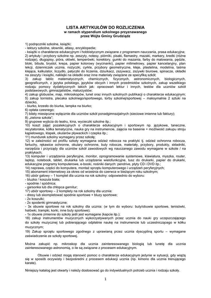 LISTA ARTYKUŁÓW DO ROZLICZENIA w ramach stypendium szkolnego przyznawanego przez Wójta Gminy Grudziądz 1) podręczniki szkolne, książki; - lektury szkolne, słowniki, atlasy, encyklopedie; - książki o charakterze edukacyjnym i hobbistycznym związane z programem nauczania, prasa edukacyjna; 2) artykuły i przybory szkolne np. zeszyty, notesy, piórniki, pisaki, flamastry, mazaki, markery, kredki (różne rodzaje), długopisy, pióra, ołówki, temperówki, korektory, gumki do mazania, farby do malowania, pędzle, bloki, bibuła, brystol, krepa, papier kolorowy (wycinanki), papier milimetrowy, papier kancelaryjny, plan lekcji, dzienniczek ucznia, nożyczki, cyrkle, przybory geometryczne, kleje, plastelina, modelina, taśma klejąca, kalkulator, liczydło, patyczki do liczenia, dziurkacz, zszywacz, zszywki biurowe, spinacze, okładki na zeszyty i książki, naklejki na okładki oraz inne materiały związane ze specyfiką szkół; 3) zakup tablic matematycznych, chemicznych, fizycznych, astronomicznych, biologicznych, geograficznych, z języka polskiego, języków obcych i innych przedmiotów szkolnych, zakup wszelkiego rodzaju pomocy dydaktycznych takich jak: opracowań lektur i innych, testów dla uczniów szkół podstawowych, gimnazjalistów, maturzystów; 4) zakup globusów, map, mikroskopów, lunet oraz innych szkolnych publikacji o charakterze edukacyjnym; 5) zakup tornistra, plecaka szkolnego/sportowego, torby szkolnej/sportowej – maksymalnie 2 sztuki na dziecko, - biurko, krzesło do biurka, lampka na biurko; 6) opłata czesnego; 7) bilety miesięczne wyłącznie dla uczniów szkół ponadgimnazjalnych (sieciowe imienne lub faktury); 8) „zielona szkoła”; 9) grupowe wyjścia do teatru, kina, wycieczki szkolne itp.; 10) koszt zajęć pozalekcyjnych o charakterze edukacyjnym i sportowym np. językowe, taneczne, recytatorskie, kółka tematyczne, nauka gry na instrumencie, zajęcia na basenie + możliwość zakupu stroju kąpielowego, klapek, okularów pływackich i czepka itp.; 11) mundurek szkolny wymagany przez szkołę; 12) w zależności od profilu szkoły wymagana odzież robocza na praktyki tj. odzież ochronna robocza, fartuchy, rękawice ochronne, okulary ochronne, buty robocze, materiały, przybory, produkty, składniki, narzędzia i przyrządy dla uczniów szkół zawodowych wg nauczanego zawodu wymagane w szkole / na praktykach; 13) komputer i urządzenia peryferyjne, monitor, oprogramowanie systemowe, klawiatura, myszka, router, laptop, notebook, tablet, drukarka lub urządzenie wielofunkcyjne, tusz do drukarki, papier do drukarki, edukacyjne programy komputerowe, e-booki, nośniki danych: pendrive, płyty CD i DVD itp.; 14) naprawa, części do komputera, montaż sprzętu komputerowego i urządzeń peryferyjnych; 15) abonament internetowy za okres od września do czerwca w bieżącym roku szkolnym; 16) ubiór galowy – 1 komplet dla ucznia na rok szkolny: odpowiednio do wyboru: - bluzka / koszula biała; - spodnie / spódnica; - garsonka lub dla chłopca garnitur; 17) ubiór sportowy – 2 komplety na rok szkolny dla ucznia: - dresy lub skompletować spodnie sportowe + bluzy sportowe; - 2x koszulki; - 2x spodenki gimnastyczne; - 3x obuwie sportowe na rok szkolny dla ucznia: (w tym do wyboru: buty/obuwie sportowe, tenisówki, halówki, trampki, korki, inne buty sportowe); - 1x obuwie zmienne do szkoły jeśli jest wymagane (kapcie itp.); 18) zakup instrumentów muzycznych wykorzystywanych przez ucznia do nauki gry uczęszczającego do szkoły muzycznej lub pobierającego odpłatnie naukę na instrumencie lub uczestniczącego w kółku muzycznym; 19) Zakup sprzętu sportowego zgodnego z uprawianą przez ucznia dyscypliną sportu – wymagane zaświadczenie ze szkoły sportowej. Można zakupić np. mikroskop dla ucznia zainteresowanego biologią zainteresowanego astronomią, o ile są związane z procesem edukacyjnym. lub lunetę dla ucznia Obuwie i odzież mogą stanowić pomoc o charakterze edukacyjnym jedynie w sytuacji, gdy wiążą się w sposób oczywisty i bezpośredni z procesem edukacji ucznia (np. kimono dla ucznia trenującego karate). Niniejszy katalog jest otwarty i należy dostosować go do indywidualnych potrzeb ucznia i rodzaju szkoły. 1 Zakup codziennej odzieży lub obuwia, umożliwiającego uczniowi dotarcie do szkoły leży w kompetencjach pomocy społecznej i nie może być finansowane w ramach stypendium szkolnego. Wyżej wymienione artykuły należy kupować na faktury lub rachunki imienne wystawione na wnioskodawcę. Na cele edukacyjne NIE NALEŻY rozliczać w ramach stypendium: - okulary korekcyjne, szkła kontaktowe, aparat słuchowy, inny sprzęt rehabilitacyjny, leki itp.; - odzież i obuwie służące do codziennego noszenia; - rower dla ucznia służący do celów transportowych; - podręczniki i lektury do klasy, do której nie uczęszcza stypendysta; - opłacenie komitetu rodzicielskiego, ubezpieczenie ucznia, wyżywienie w szkole, kupno biletów miesięcznych i sieciowych dla uczniów szkół podstawowych i gimnazjów, - koszt studniówki. 2