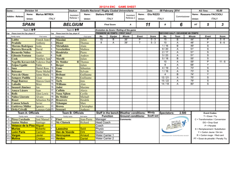 2012/14 ENC Division 1A Game: : Arbitre - Referee Name: Stadium Marius MITREA SPAIN 1. 2. 3. 4. 5. 6. 7. 8. 9. 10. 11. 12. 13. 14. 15. 16. 17. 18. 19. 20. 21. 22. 23. Sys M C1 C2 P D WC1 WC2 Stefano PENNÉ Union: ITALY Cap First name Pérez Corchado Santos Muñoz Velasco de la Pisa Murias León Paris Vargas Molina First name Sys José Manuel Santiago Miguel Roberto Carmen Javier Cristian M C1 Family name first name Finet Mc Clintock Jean-Pierre Richard Laaouina Van de Voorde Vercruysse Verdon Saïd Dirk Arnaud Daniel C2 P D WC1 WC2 11 Name : Rossano FACCIOLI ITALY Union: 6 B 16.00 KO Time: Commissioner ITALY Union: A 08 February 2014 Elia RIZZO PREMIERE MI-TEMPS / FIRST HALF First name 1. Labbe Franck Jean-Louis Julien Massimi 2. Pradalie Anthony Dienst Thomas 3. Moreno Rodríguez Jesús Miriallakis Alain 4. Barrera Howarth David Verschelden Mathieu 5. Recuerda Núñez Jesús Hendrickx Pierre 6. Gibouin Fontana Gautier Neill Andrew 7. Cook Matthew James Morelli Julien 8. Negrillo Kovacevich Federico Daniel De Molder © Thomas 9. Feijoo Ugalde Pablo Berger Julien Snee Daniel Ross 10. Guns Sébastien Belzunce Pierre Michel 11. Roos Sylvain Nava de Olano Jaime María 12. Brébant Guillaume 13. Piron Sempere Padilla César Guillaume 14. Torfs Poggi Ranwez Marcos Gustavo Jens 15. Williams Labadie Brice Alan 16. Jadot Insausti Jiménez Jon Maxime 17. Cuffolo Anaya Lázaro Juan Alexis Rolls Glen Lewis 18. Nana Njilem Cyrille 19. De Molder Núñez Llorente Álvaro Michaël 20. Brouwers Rouet Sebastien Patrick Hendrik 21. Tchangue Canosa Schack Javier Marc 22. Brown Gutiérrez Müller Ignacio Christopher 23. Agustín Ortiz Crivelli Scozzari Lorenzo Gabriel Anthony Team A: Officials Team B: Officials Family name Date: Name : HT 5 3 Evolution du Score / Rolling of the game Please insert the Cap. player N° Family name, Assistant Referee 2 Final Score Team B éê Please insert the Cap. player N° Family name, Name : BELGIUM Team A éê Cap Estadio Nacional I Rugby Ciudad Universitaria Assistant Referee 1 ITALY Union: GAME SHEET SECOND HALF / DEUXIEME MI-TEMPS No. Equipe Minute Event Score No. Team Minute Event Score 15 8 B A 36' 39' P T 0-3 5-3 15 10 1 / 16 9 / 20 2 / 17 3 / 23 5 / 18 10 8 4 / 19 1 / 16 4 12 / 21 15 / 22 14 / 18 B A B A A A B A A A A B A A A 44' 48' 49' 51' 51' 51' 55' 59' 68' 73' 73' 74' 75' 79' 80' P P S S S S S P Y S S Y S S S 5-6 8-6 Staff in the bench Weather conditions: Windy Spectators: Function Ground conditions: Sooft wet Manager Comments: Head Coach Coach Physio Doctor Water Carrier 1 Water Carrier 2 2.500 11 - 6 Event Codes: T = Essai / Try C = Transformation / Converrsion DG = Drop Goal P = Pénalité S = Remplacement / Substitution Y = Carton Jaune / Sin bin R = Carton rouge / Red card PT = Essai de pénalité / Penalty Try