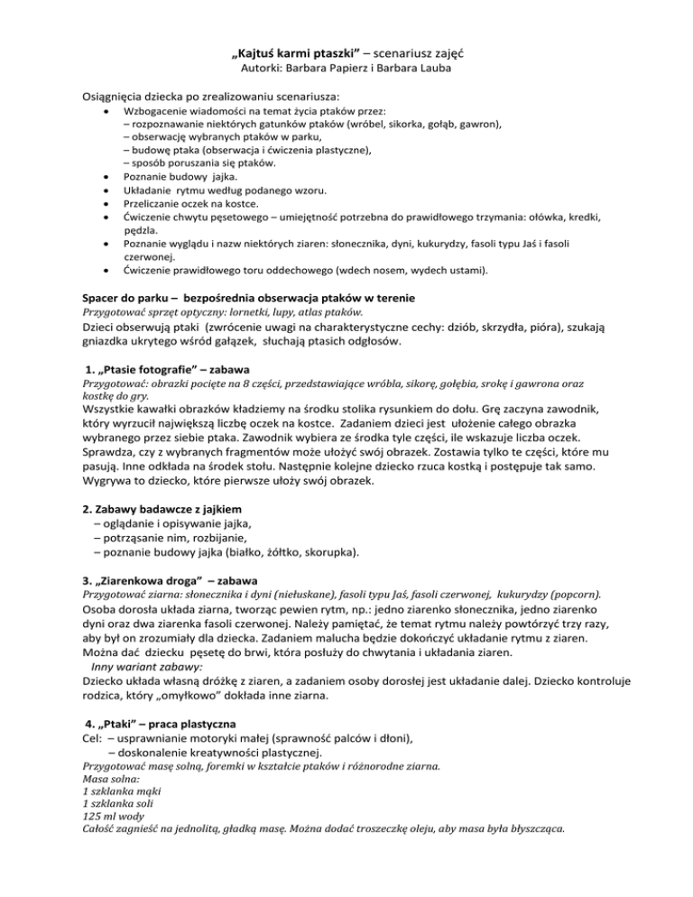 „Kajtuś karmi ptaszki” – scenariusz zajęć Autorki: Barbara Papierz i Barbara Lauba Osiągnięcia dziecka po zrealizowaniu scenariusza: • • • • • • • Wzbogacenie wiadomości na temat życia ptaków przez: – rozpoznawanie niektórych gatunków ptaków (wróbel, sikorka, gołąb, gawron), – obserwację wybranych ptaków w parku, – budowę ptaka (obserwacja i ćwiczenia plastyczne), – sposób poruszania się ptaków. Poznanie budowy jajka. Układanie rytmu według podanego wzoru. Przeliczanie oczek na kostce. Ćwiczenie chwytu pęsetowego – umiejętność potrzebna do prawidłowego trzymania: ołówka, kredki, pędzla. Poznanie wyglądu i nazw niektórych ziaren: słonecznika, dyni, kukurydzy, fasoli typu Jaś i fasoli czerwonej. Ćwiczenie prawidłowego toru oddechowego (wdech nosem, wydech ustami). Spacer do parku – bezpośrednia obserwacja ptaków w terenie Przygotować sprzęt optyczny: lornetki, lupy, atlas ptaków. Dzieci obserwują ptaki (zwrócenie uwagi na charakterystyczne cechy: dziób, skrzydła, pióra), szukają gniazdka ukrytego wśród gałązek, słuchają ptasich odgłosów. 1. „Ptasie fotografie” – zabawa Przygotować: obrazki pocięte na 8 części, przedstawiające wróbla, sikorę, gołębia, srokę i gawrona oraz kostkę do gry. Wszystkie kawałki obrazków kładziemy na środku stolika rysunkiem do dołu. Grę zaczyna zawodnik, który wyrzucił największą liczbę oczek na kostce. Zadaniem dzieci jest ułożenie całego obrazka wybranego przez siebie ptaka. Zawodnik wybiera ze środka tyle części, ile wskazuje liczba oczek. Sprawdza, czy z wybranych fragmentów może ułożyć swój obrazek. Zostawia tylko te części, które mu pasują. Inne odkłada na środek stołu. Następnie kolejne dziecko rzuca kostką i postępuje tak samo. Wygrywa to dziecko, które pierwsze ułoży swój obrazek. 2. Zabawy badawcze z jajkiem – oglądanie i opisywanie jajka, – potrząsanie nim, rozbijanie, – poznanie budowy jajka (białko, żółtko, skorupka). 3. „Ziarenkowa droga” – zabawa Przygotować ziarna: słonecznika i dyni (niełuskane), fasoli typu Jaś, fasoli czerwonej, kukurydzy (popcorn). Osoba dorosła układa ziarna, tworząc pewien rytm, np.: jedno ziarenko słonecznika, jedno ziarenko dyni oraz dwa ziarenka fasoli czerwonej. Należy pamiętać, że temat rytmu należy powtórzyć trzy razy, aby był on zrozumiały dla dziecka. Zadaniem malucha będzie dokończyć układanie rytmu z ziaren. Można dać dziecku pęsetę do brwi, która posłuży do chwytania i układania ziaren. Inny wariant zabawy: Dziecko układa własną dróżkę z ziaren, a zadaniem osoby dorosłej jest układanie dalej. Dziecko kontroluje rodzica, który „omyłkowo” dokłada inne ziarna. 4. „Ptaki” – praca plastyczna Cel: – usprawnianie motoryki małej (sprawność palców i dłoni), – doskonalenie kreatywności plastycznej. Przygotować masę solną, foremki w kształcie ptaków i różnorodne ziarna. Masa solna: 1 szklanka mąki 1 szklanka soli 125 ml wody Całość zagnieść na jednolitą, gładką masę. Można dodać troszeczkę oleju, aby masa była błyszcząca. Dziecko robi płaskorzeźbę ptaka, używając gotowej foremki lub modelując ją według własnego uznania, a następnie przyozdabia sylwetę różnymi ziarnami. Może także pomalować płaskorzeźbę farbami plakatowymi. Jeżeli przed wyschnięciem masy zrobimy w grzbiecie ptaka otwór, to gotową płaskorzeźbę będzie można zawiesić na sznureczku lub wstążce w pokoju dziecka. 5. „Malutka sikorka” – praca plastyczna Przygotować: waciki kosmetyczne, farby plakatowe (żółtą i szarą), kolorowy papier, klej w sztyfcie. Dzieci malują szarą farbą górną część wacika, natomiast żółtą, dolną część, czyli „brzuszek” sikorki. Po wyschnięciu wacika doklejają: dziób, skrzydła, ogon. Gotowe sikory zawieszamy na nitce. 6. „Fruwające ptaki” – zabawa Dziecko trzyma w ręku nitkę, na której jest zawieszona sikorka zrobiona z wacika kosmetycznego. Dmuchając na nią, uczy swoją sikorkę ,,fruwać”. Inny wariant zabawy: Na stole lub dużym kartonie przylepiamy kontury karmnika, wykorzystując paski taśmy izolacyjnej (dowolny kolor). Dziecko trzyma w ustach słomkę i dmucha na sikorkę, żeby „pofrunęła” do karmnika. 7. „Wróbelkowe zagadki” – zabawa ruchowa Dzieci stoją w kręgu i recytują wierszyk: Nasz wróbelek mały podskakuje: hop, hop, hop! Zamiast śpiewać – ćwierka! Co on zrobi? Trzeba zerkać! Jedno z dzieci wchodzi do koła i podskakuje obunóż, naśladując poruszanie się wróbla. Pokazuje wymyślony przez siebie gest, a cała grupa go naśladuje. Następnie dzieci głośno wołają: Leć już wróblu do ogrodu, raz, dwa, trzy! Dziecko udające wróbla odpowiada: Moje miejsce zajmiesz – ty! i wskazuje, które z dzieci zostanie wróblem. Zabawa toczy się dalej.