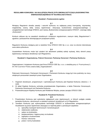 REGULAMIN KONKURSU NA NAJLEPSZĄ PRACĘ DYPLOMOWĄ DOTYCZĄCĄ BUDOWNICTWA ENERGOOSZCZĘDNEGO W TECHNOLOGII STEICO. Rozdział I. Postanowienia ogólne §1 Niniejszy Regulamin określa zasady i warunki konkursu na najlepszą pracę licencjacką, inżynierską, magisterską zwaną dalej "pracą dyplomową", dotyczącą budownictwa energooszczędnego z uwzględnieniem technologii STEICO, pod nazwą „Budownictwo energooszczędne STEICO", zwanego dalej „Konkursem”. §2 Konkurs odbywa się na zasadach określonych niniejszym regulaminem, zwanym dalej „Regulaminem” i zgodnie z powszechnie obowiązującymi przepisami prawa. §3 Regulamin Konkursu dostępny jest w siedzibie firmy STEICO CEE Sp z o.o. oraz na stronie internetowej www.steico.pl/konkurs. §4 Uczestnikiem Konkursu może być student lub absolwent polskiej szkoły wyższej, który obronił pracę dyplomową o tematyce określonej w § 8 Regulaminu. Rozdział II. Organizatorzy, Patroni Honorowi, Partnerzy Honorowi i Partnerzy Konkursu §5 Organizatorem i inicjatorem Konkursu jest firma STEICO CEE Sp. z o.o. z siedzibą przy ul. Przemysłowej 2, 64-700 Czarnków Polska zwana dalej „Organizatorem”. §6 Patronami Honorowymi, Partnerami Honorowymi i Partnerami Konkursu mogą być inne podmioty na mocy odrębnych porozumień zawartych przez Organizatora. 1. 2. 3. 1. 2. §7 Organem doradczym, programowym i opiniodawczym Konkursu jest Kapituła Konkursu złożona z 3 osób. W skład Kapituły Konkursu wchodzą przedstawiciele Organizatora, a także Patronów Honorowych, Partnerów Honorowych lub Partnerów Konkursu. Przewodniczącym Kapituły Konkursu jest Waldemar Motyka, prezes zarządu STEICO CEE. Rozdział III. Przedmiot Konkursu §8 Przedmiotem Konkursu jest wyłonienie najlepszych prac dyplomowych, w których podjęta została tematyka Konkursu, obronionych w szkołach wyższych określonych w § 4 Regulaminu. Tematem Konkursu jest wykorzystanie technologii STEICO w budownictwie energooszczędnym. Oczekiwane są prace dyplomowe ukazujące co najmniej jeden z poniższych aspektów: a. specyfikę rozwiązań technicznych i konstrukcyjnych b. właściwości użytkowe, c. wpływ na środowisko, d. bezpieczeństwo i higiena pracy na budowie e. logistyka w budownictwie f. finanse i ekonomia g. prawo i normy budowlane 1. 2. 3. 4. 5. 6. 7. Rozdział IV. Nagrody dla autorów prac dyplomowych §9 Pula nagród dla autorów prac dyplomowych w Konkursie składa się z nagród głównych oraz nagrody specjalnej. Nagrody główne stanowią nagrody pieniężne ufundowane przez Organizatora w następującym wymiarze: a. za I miejsce - 3.000 złotych, b. za II miejsce - 2.000 złotych, c. za III miejsce - 1.000 złotych. W przypadku decyzji Kapituły Konkursu o nieprzyznaniu nagrody I, II lub III stopnia, podział nagród pieniężnych może być inny od wymienionego w ust. 2. Nagrodę specjalną stanowi nagroda finansowa w wysokości 10.000 złotych dla Wydziału szkoły wyższej, z którego napłynie najwięcej prac konkursowych. W przypadku, gdy z różnych Wydziałów wpłynie ta sam liczba prac konkursowych, nagroda specjalna ulega równomiernemu rozłożeniu pomiędzy te Wydziały. Realizacja zobowiązań, związanych z przekazaniem przez Organizatora nagród finansowych Laureatom, nastąpi w terminie do 2 miesięcy od daty wyłonienia Laureatów. Organizator uprawniony jest do potrącenia z kwoty przyznanej nagrody wszelkich podatków wymaganych na podstawie przepisów powszechnie obowiązującego prawa. § 10 W przypadku ustanowienia dodatkowego funduszu nagród Kapituła Konkursu na podstawie informacji od Organizatora może podjąć decyzję o przyznaniu dodatkowych nagród pieniężnych bądź niepieniężnych Laureatom i/lub promotorom nagrodzonych prac dyplomowych. Rozdział V. Zgłaszanie prac do Konkursu § 11 1. Pracę do Konkursu może zgłosić Autor pracy za pośrednictwem szkoły wyższej reprezentowanej przez Dziekana Wydziału lub Promotora. 2. Zgłoszenie pracy do Konkursu, zgodnie z postanowieniami niniejszego Regulaminu, jest równoznaczne ze złożeniem przez uczestnika Konkursu oświadczenia w przedmiocie akceptacji niniejszego Regulaminu i zgodą na przetwarzanie jego danych osobowych przez Organizatora. § 12 3. Do Konkursu mogą być zgłoszone wyłącznie obronione prace dyplomowe, do których przysługują Autorowi nieograniczone prawa autorskie. 4. W Konkursie mogą brać udział prace dyplomowe obronione nie wcześniej niż 1 stycznia 2016 roku 5. Za prawidłowe zgłoszenie uważa się przedłożenie kompletu dokumentów zgłoszeniowych w polskiej wersji językowej, w siedzibie Organizatora lub wysłanie ich na adres Organizatora w terminie do 30 lipca 2016r. (decyduje data stempla pocztowego/nadania przesyłki kurierskiej) z dopiskiem: Konkurs „Budownictwo energooszczędne STEICO” 6. Komplet dokumentów zgłoszeniowych składa się z: 1) płyty CD lub DVD lub innego nośnika danych w standardzie USB, zawierających: a. pracę dyplomową w wersji elektronicznej w formacie doc, docx lub pdf, (w przypadku prac napisanych oryginalnie w innym języku niż polski należy przedłożyć pracę przetłumaczoną na język polski); b. kompletnie wypełnionego, opieczętowanej i podpisanego „Formularza zgłoszeniowego”, dostępnego w wersji elektronicznej na stronie internetowej Organizatora lub do pobrania w Dziekanacie Wydziału, zawierającego: - informacje na temat Autora i jego dane kontaktowe - streszczenie (abstract) pracy c. d. potwierdzonej przez uczelnię (sekretariat studiów lub dziekanat) kopii dyplomu magisterskiego lub wydanego przez uczelnię (sekretariat studiów lub dziekanat) zaświadczenia o ukończeniu studiów i uzyskaniu dyplomu w okresie nie wcześniejszym niż przed 1 stycznia 2016 r. potwierdzonej za zgodność przez uczelnię (sekretariat studiów lub dziekanat) kopii promotorskiej recenzji pracy, w szczególności zawierającej ocenę pracy, § 13 Nośniki z pracami zgłoszonymi do 