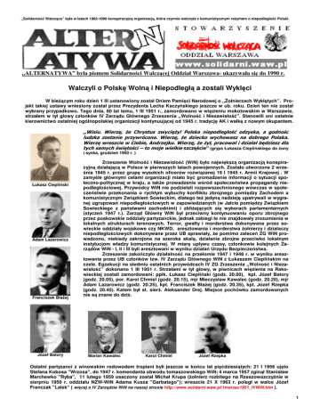 ,,Solidarność Walcząca’’ była w latach 1982-1990 konspiracyjną organizacją, która czynnie walczyła z komunistycznym reŜymem o niepodległość Polski. „ALTERNATYWA” była pismem Solidarności Walczącej Oddział Warszawa- ukazywała się do 1990 r. Walczyli o Polskę Wolną i Niepodległą a zostali Wyklęci W bieŜącym roku dzień 1 III ustanowiony został Dniem Pamięci Narodowej o ,,śołnierzach Wyklętych’’. Projekt takiej ustawy wniesiony został przez Prezydenta Lecha Kaczyńskiego jeszcze w ub. roku. Dzień ten nie został wybrany przypadkowo. Tego dnia, 60 lat temu, 1 III 1951 r., zamordowano w więzieniu mokotowskim w Warszawie, strzałem w tył głowy członków IV Zarządu Głównego Zrzeszenia ,,Wolność i Niezawisłość''. Stanowili oni ostatnie kierownictwo ostatniej ogólnopolskiej organizacji kontynuującej od 1945 r. tradycję AK i walkę z nowym okupantem. ,,Wisiu. Wierzę, Ŝe Chrystus zwycięŜy! Polska niepodległość odzyska, a godność ludzka zostanie przywrócona. Wierzę, Ŝe dziecko wychowasz na dobrego Polaka. Wierzę wreszcie w Ciebie, Andrzejku. Wierzę, Ŝe Ŝył, pracował i działał będziesz dla tych samych świętości – to moje wielkie szczęście’’ (gryps Łukasza Cieplińskiego do Ŝony i synka, grudzień 1950 r. ) Łukasz Ciepliński Adam Lazarowicz Franciszek BłaŜej Józef Batory Zrzeszenie Wolność i Niezawisłość (WiN) było największą organizacją konspiracyjną działającą w Polsce w pierwszych latach powojennych. Zostało utworzone 2 września 1945 r. przez grupę wysokich oficerów rozwiązanej 19 I 1945 r. Armii Krajowej . W zamyśle głównymi celami organizacji miało być gromadzenie informacji o sytuacji społeczno-politycznej w kraju, a takŜe prowadzenie wśród społeczeństwa propagandy niepodległościowej. Przywódcy WiN nie podzielali rozpowszechnionego wówczas w społeczeństwie przekonania o rychłym wybuchy konfliktu zbrojnego pomiędzy Zachodem a komunistycznym Związkiem Sowieckim, dlatego teŜ jedyną nadzieję upatrywali w wygranej ugrupowań niepodległościowych w zapowiedzianych (w Jałcie pomiędzy Związkiem Sowieckiego z państwami zachodnimi) i zbliŜających się wyborach parlamentarnych (styczeń 1947 r.). Zarząd Główny WiN był przeciwny kontynuowaniu oporu zbrojnego przez poakowskie oddziały partyzanckie, jednak zabiegi te nie znajdowały zrozumienia w lokalnych strukturach terenowych. Terror, gwałty i morderstwa dokonywane przez sowieckie oddziały wojskowe czy NKWD, aresztowania i morderstwa Ŝołnierzy i działaczy niepodległościowych dokonywane przez UB sprawiały, Ŝe pomimo zaleceń ZG WiN prowadzono, niekiedy zakrojone na szeroka skalę, działania zbrojne przeciwko lokalnym instytucjom władzy komunistycznej. W miarę upływu czasy, członkowie kolejnych Zarządów WiN - I, II i III byli aresztowani w wyniku działań Urzędu Bezpieczeństwa. Zrzeszenie zakończyło działalność na przełomie 1947 i 1948 r. w wyniku aresztowania przez UB członków tzw. IV Zarządu Głównego WiN z Łukaszem Cieplińskim na czele. Egzekucji na siedmiu ostatnich przywódcach IV ZG Zrzeszenia ,,Wolność i Niezawisłość’’ dokonano 1 III 1951 r. Strzałami w tył głowy, w piwnicach więzienia na Rakowieckiej zostali zamordowani: ppłk. Łukasz Ciepliński (godz. 20.00), kpt. Józef Batory (godz. 20.05), por. Karol Chmiel (godz. 20.15), mjr Mieczysław Kawalec (godz. 20.20), mjr Adam Lazarowicz (godz. 20.25), kpt. Franciszek BłaŜej (godz. 20.35), kpt. Józef Rzepka (godz. 20.45). Katem był st. sierŜ. Aleksander Drej. Miejsce pochówku zamordowanych nie są znane do dziś. Marian Kawalec Karol Chmiel Józef Rzepka Ostatni partyzanci z winowskim rodowodem tropieni byli jeszcze w końcu lat pięćdziesiątych: 21 I 1956 ujęto Stefana Kobosa "Wrzosa", do 1947 r. komendanta obwodu tomaszowskiego WiN; 4 marca 1957 zginął Stanisław Marchewko "Ryba", 11 lutego 1959 osaczony został Michał Krupa (Ŝołnierz rozbitego na Rzeszowszczyźnie w sierpniu 1950 r. oddziału NZW-WiN Adama Kusza "Garbatego"); wreszcie 21 X 1963 r. poległ w walce Józef Franczak "Lalek" ( więcej o IV Zarządzie WiN na naszej stronie http://www.solidarni.waw.pl/1marzec1951_IVWiN.htm ). 1 Kalendarium marca 7 marca 1949 r. , w mokotowskim więzieniu w Warszawie, zamordowani zostali mjr Hieronim Dekutowski ,,Zapora’’ (l.31), kpt. Stanisław Łukasik ,,Ryś’’ (l.31), por. Edmund Tudruj ,,Mundek’’ (l.26), por. Jerzy Miatkowski ,,Zawada’’ (l.26), por. Tadeusz Pelak ,,Junak’’ (l.27), por. Arkadiusz Wasilewski ,,Biały’’ (l.24), por. Roman Groński ,,śbik’’ (l.23). Partyzanci mjr ,,Zapory’’ (stoi piąty od lewej), Dobryń koło Mielca, lato 1946 r. Zgrupowanie WiN mjr. Hieronima Dekutowskiego ,,Zapory'' na Lubelszczyźnie liczyło latem 1946 r. ok. 150 partyzantów. Mjr ,,Zapora’’, ,,cichociemny'', był legendarnym dowódca oddziałów partyzanckich Armii Krajowej (AK), Delegatury Sił Zbrojnych (DSZ) i WiN. Podległe mu oddziały w okresie okupacji niemieckiej wykonały ok. 50 powaŜnych akcji bojowych. Po wejściu Armii Czerwonej na teren Polski ,,Zapora'' pozostał w konspiracji. Od wiosny 1945 r. był dowódcą dywersji i oddziałów partyzanckich na terenie Lubelszczyzny. Oddziały Dekutowskiego rozbudowały swą siatkę od Lubartowskiego na północy do Tarnobrzeskiego na południu i od Zamojszczyzny po wschodnią Kielecczyznę. Jego Ŝołnierze przeprowadzili szereg udanych akcji przeciwko funkcjonariuszom MO, UB i zołnierzom KBW. W lipcu 1947 r. ,,Zapora'' przekazał dowodzenie kpt. Zdzisławowi Brońskiemu ,,Uskokowi'' († 21 V 1949 r.) i podjął nieudaną próbę przedostania się na Zachód. Aresztowany wraz ze swoimi współpracownikami przez funkcjonariuszy UB byli bestialsko torturowany. Egzekucję zarządził prezes NajwyŜszego Sądu Wojskowego Władysław Garnowski. Ewa Kurek w ksiąŜce "Zaporczycy" pisze o ostatnich chwilach ,,Zapory’’: "Mi