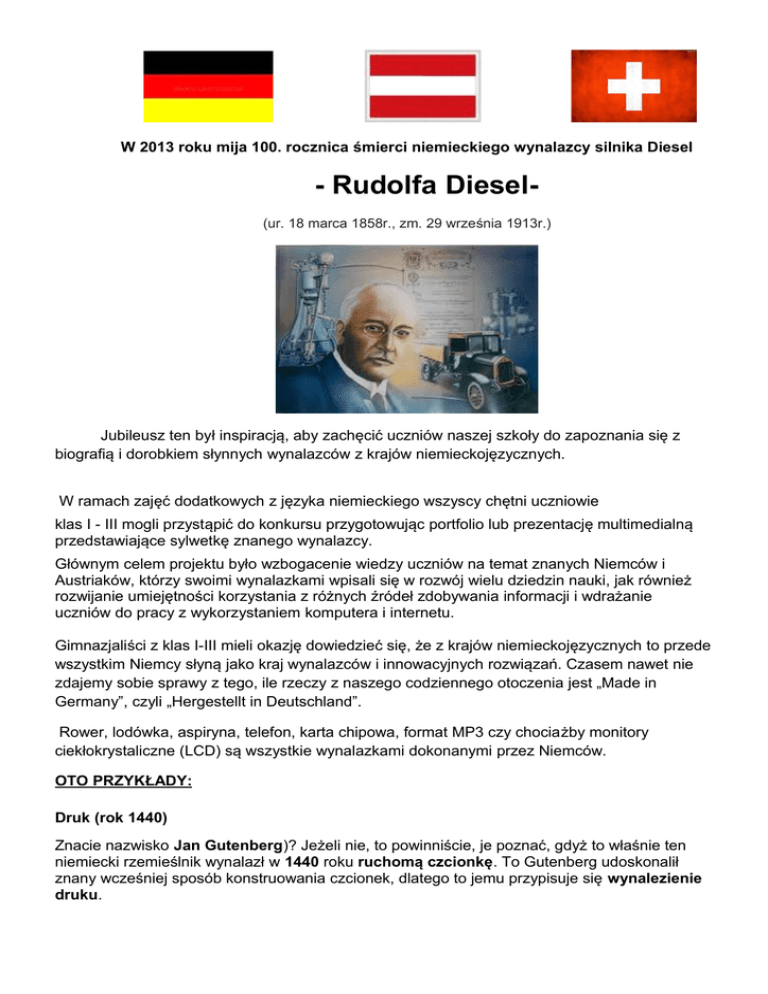 W 2013 roku mija 100. rocznica śmierci niemieckiego wynalazcy silnika Diesel - Rudolfa Diesel(ur. 18 marca 1858r., zm. 29 września 1913r.) Jubileusz ten był inspiracją, aby zachęcić uczniów naszej szkoły do zapoznania się z biografią i dorobkiem słynnych wynalazców z krajów niemieckojęzycznych. W ramach zajęć dodatkowych z języka niemieckiego wszyscy chętni uczniowie klas I - III mogli przystąpić do konkursu przygotowując portfolio lub prezentację multimedialną przedstawiające sylwetkę znanego wynalazcy. Głównym celem projektu było wzbogacenie wiedzy uczniów na temat znanych Niemców i Austriaków, którzy swoimi wynalazkami wpisali się w rozwój wielu dziedzin nauki, jak również rozwijanie umiejętności korzystania z różnych źródeł zdobywania informacji i wdrażanie uczniów do pracy z wykorzystaniem komputera i internetu. Gimnazjaliści z klas I-III mieli okazję dowiedzieć się, że z krajów niemieckojęzycznych to przede wszystkim Niemcy słyną jako kraj wynalazców i innowacyjnych rozwiązań. Czasem nawet nie zdajemy sobie sprawy z tego, ile rzeczy z naszego codziennego otoczenia jest „Made in Germany”, czyli „Hergestellt in Deutschland”. Rower, lodówka, aspiryna, telefon, karta chipowa, format MP3 czy chociażby monitory ciekłokrystaliczne (LCD) są wszystkie wynalazkami dokonanymi przez Niemców. OTO PRZYKŁADY: Druk (rok 1440) Znacie nazwisko Jan Gutenberg)? Jeżeli nie, to powinniście, je poznać, gdyż to właśnie ten niemiecki rzemieślnik wynalazł w 1440 roku ruchomą czcionkę. To Gutenberg udoskonalił znany wcześniej sposób konstruowania czcionek, dlatego to jemu przypisuje się wynalezienie druku. Rower (rok 1817) Mamy rok 1817, kiedy Karl von Drais buduje pierwszy rower (patent – 1818). Ta dwukołowa i jakże niezbędna dzisiaj maszyna jest bardzo ważnym elementem życia wielu osób na całym świecie. Żarówka (rok 1854) Już w roku 1854 Heinrich Göbel doprowadził do żarzenia włókna bambusa. Proces ten odbył się w próżni i miał miejsce jeszcze przed wynalezieniem sieci elektrycznej. Jego wynalazek był pierwszym praktycznym użyciem żarówki. Telefon (rok 1861) Wynalezienie telefonu rozpoczęło niemałą rewolucję w dziedzinie komunikacji. Wynalazku dokonał w roku 1861 Philipp Reis. Reis był nauczycielem matematyki i to on jako pierwszy przekształcił dźwięki i głos ludzki w prąd elektryczny, po czym odtworzył to w zupełnie innym miejscu. Za wynalazcę telefonu uważa się jednak Aleksandra Bella. Lodówka (rok 1876) Wyobrażacie sobie życie bez niej? Jak długo moglibyśmy przechowywać nasze jedzenie, gdyby nie wynalazek Carla von Linde. Lodówka została przez niego opatentowana w roku 1876. Różniła się ona od dzisiejszych, gdyż do chłodzenia używany był amoniak. Aspiryna (rok 1897) Od roku 1897 niestraszne były już bóle głowy i przeziębienie, gdyż chemik Felix Hoffmann wynalazł kwas acetylisalicylowy (inaczej: aspiryna). Teoria względności (rok 1905) Odkrycia tego dokonał w roku 1905 Albert Einstein, urodzony w Niemczech fizyk, który w roku 1933 z tego kraju wyemigrował. Telewizja (rok 1930) Ten wynalazek to zasługa Manfreda von Ardenne który to w 1930 roku przeprowadził pierwszą elektroniczną transmisję telewizyjną. Poza telewizją, do Ardenne należy ok. 600 innych wynalazków i patentów. Komputer (rok 1941) Kto z Was wiedział, że pierwszą binarną maszynę liczącą wynalazł w 1941 r. właśnie Niemiec? Nazywał się Konrad Zuse i swój wynalazek nazwał Z3. Jego osiągnięcie zapoczątkowało erę cyfrową, chociaż maszyna potrafiła niewiele. Wykonywała mianowicie tylko cztery podstawowe działania arytmetyczne. Karta chipowa (rok 1969) Mamy je w telefonach komórkowych, w kartach płatniczych itp. Wynalezienie karty chipowej w 1969 roku to zasługa Jürgena Dethloffa oraz Helmuta Gröttrupa Monitor LCD (rok 1976) Patent na monitory ciekłokrystaliczne należy od 1976 roku do firmy Merck KGaA z Darmstadt. Firma jest pionierem technologii LCD i przedsiębiorstwem o międzynarodowym zasięgu. Format MP3 (rok 1995) Wynalezienie standardu MP3 miało miejsce w roku 1995 i zawdzięczane jest zespołowi naukowców z Instytutu im. Fraunhofera. Zespołem kierował Karlheinz Brandenburg. Do Niemców należy jeszcze wiele innych wynalazków, np.: • filtry do kawy, • poduszka powietrzna, • silnik Diesla, • kołek rozporowy, • silnik odrzutowy, • dynamo, • szybowiec itp. TYCH INTERESUJĄCYCH INFORMACJI MOGLIŚMY DOWIEDZIEĆ SIĘ Z PRAC NASZYCH UCZNIÓW! Wszystkie prace były ciekawe, ale na szczególną uwagę i pochwałę zasługują: prezentacje multimedialne: • Laury Kubiak – klasa 1c • Daniela Gricera – klasa 3e • oraz portfolio: Pauliny Goździewicz – klasa 2b • Jana Czernieckiego – klasa 2b • Wojciecha Barana – klasa 1b • Mariusza Przezaka – klasa 2b GRATULACJE!!!! Pomysł i koordynacja projektu: Joanna Baucz