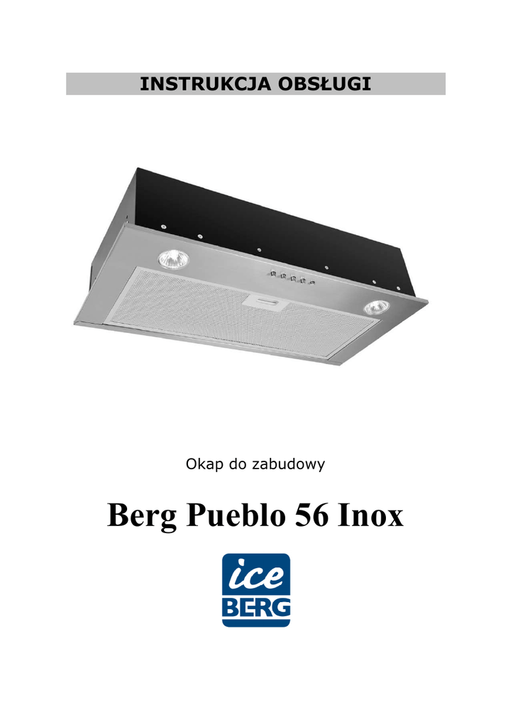 INSTRUKCJA OBSŁUGI Okap do zabudowy Berg Pueblo 56 Inox Informacje ogólne Przy przeprowadzaniu instalacji urządzenia należy postępować według wskazówek podanych w niniejszej instrukcji. Producent uchyla się od wszelkiej odpowiedzialności za uszkodzenia wynikłe na skutek instalacji niezgodnej z informacjami podanymi w niniejszej instrukcji. Okap został zaprojektowany wyłącznie do użytku domowego. Okap może różnić się pod względem wyglądu od okapu przedstawionego na rysunkach niniejszej instrukcji, ale zalecenia dotyczące obsługi, konserwacji i montażu pozostają niezmienione. ! Należy zachować instrukcję obsługi aby móc z niej skorzystać w każdej chwili. W przypadku sprzedaży urządzenia lub przeprowadzki, należy upewnić się, że dołączono do niego instrukcję obsługi. ! Uważnie zapoznać się z treścią instrukcji obsługi, która dostarcza dokładne informacje dotyczące instalacji, użytkowania i pielęgnacji urządzenia ! Nie dokonywać zmian elektrycznych czy mechanicznych w urządzeniu lub na przewodach odprowadzających. Uwaga: Elementy oznaczone symbolem “(*)” wchodzą wyłącznie w skład wybranych modeli, w pozostałych przypadkach powinny być zakupione osobno. Dane techniczne Cechy charakterystyczne SL-BOX 60 Napięcie zasilania Silnik wentylatora Oświetlenie Ilość filtrów tłuszczowych Stopnie prędkości Szerokość [cm] Głębokość [cm] Wysokość [cm] Wylot [ø mm] Wydajność [m 3/h] Pobór mocy [W] Głośność [dBA] Rodzaj pracy Kolor AC 230V ~50Hz 1 Halogen JDR 2 x 20 W 1 3 60 29 13,7 120 max 194 220 Max. 65 Wyciąg lub pochłaniacz Inox + czarny korpus Ostrzeżenia Uwaga! Nie podłączać urządzenia do sieci elektrycznej przed ukończeniem montażu. Przed wykonaniem jakiejkolwiek czynności czyszczenia lub konserwacji należy odłączyć okap od zasilania, wyjmując wtyczkę z gniazdka lub wyłączając główny wyłącznik zasilania. Wszelkie czynności montażowe i konserwacyjne wykonywać w rękawicach ochronnych. Niniejsze urządzenie nie jest przeznaczone do użytku przez osoby (w tym dzieci) o ograniczonych zdolnościach fizycznych, sensorycznych czy umysłowych, a także nieposiadające wiedzy lub doświadczenia w użytkowaniu tego typu urządzeń, chyba, że będą one nadzorowane lub zostaną poinstruowane na temat korzystania z tego urządzenia przez osobę odpowiedzialną za ich bezpieczeństwo. Dzieci należy pilnować, aby mieć pewność, że nie bawią się urządzeniem. Nie należy nigdy używać okapu bez prawidłowo zamontowanych filtrów! Okap nie powinien być NIGDY używany jako płaszczyzna oparcia chyba, że taka możliwość została wyraźnie wskazana. Pomieszczenie, w którym okap jest używany łącznie z innymi urządzeniami spalającymi gaz lub inne paliwo powinno posiadać odpowiednią wentylację. Zasysane powietrze nie powinno być odprowadzane do kanału wykorzystywanego do odprowadzania spalin wytwarzanych przez urządzenia gazowe lub na inne paliwo. Surowo zabrania się przygotowywania pod okapem potraw z użyciem otwartego otwart ognia (flambirowanie). Użycie otwartego ognia jest groźne dla filtrów i stwarza ryzyko pożaru, a zatem nie wolno tego robić pod żadnym pozorem. Podczas smażenia należy zachować ostrożność, aby nie dopuścić do przegrzania oleju, aby nie uległ samozapaleniu. ozapaleniu. Dostępne części mogą ulec znacznemu nagrzaniu, jeżeli będą używane razem z urządzeniami przeznaczonymi do gotowania. W zakresie koniecznych do zastosowania środków technicznych i bezpieczeństwa dotyczących odprowadzania spalin należy ściśle przestrzegać przepisów wydanych przez kompetentne władze lokalne. Okap powinien być często czyszczony zarówno na zewnątrz jak i od wewnątrz (PRZYNAJMNIEJ RAZ W MIESIĄCU, z zachowaniem wskazówek dotyczących konserwacji podanych w niniejszej szej instrukcji). Nieprzestrzeganie zasad dotyczących czyszczenia okapu oraz wymiany i czyszczenia filtrów powoduje powstanie zagrożenia pożarem. Celem uniknięcia porażenia prądem nie należy używać lub pozostawiać okapu bez prawidłowo zamontowanych żarówek. arówek. Producent nie ponosi żadnej odpowiedzialności za ewentualne szkody lub pożary spowodowane przez urządzenie a wynikające z nieprzestrzegania zaleceń podanych w niniejszej instrukcji. Niniejsze urządzenie Unijną 2002/96/EC w elektronicznego (WEEE). zgodnie z Dyrektywą posiada oznaczenia sprawie zużytego sprzętu elektrycznego i Zapewniając prawidłowe złomowanie niniejszego urządzenia, przyczynią się Państwo do ograniczenia ryzyka wystąpienia negatywnego wpływu produktu na środowisko i zdrowie ludzi, które mogłoby zaistnieć w przypadku niewłaściwej utylizacji urządzenia. Symbol na urządzeniu lub opakowaniu oznacza, że tego produktu nie można traktować jak innych odpadów komunalnych. Należy oddać go do właściwego punktu zbiórki i recyklingu yklingu sprzętów elektrycznych i elektronicznych. Właściwa utylizacja i złomowanie pomaga w eliminacji niekorzystnegowpływu złomowanych urządzeń na środowisko oraz zdrowie. Aby uzyskać szczegółowe dane dotyczące możliwości recyklingu niniejszego urządzenia, a, należy skontaktować się z lokalnym urzędem miasta, służbami oczyszczania miasta lub sklepem, w którym produkt został zakupiony. Obsługa Urządzenie można używać jako wyciąg (odprowadzanie oparów na zewnątrz) bądź jako pochłaniacz (opary są filtrowane i odprowadzane z powrotem do pomieszczenia). Modele okapów, które nie posiadają wentylatora wyciągowego, funkcjonują wyłącznie jako wyciąg i muszą być połączone z urządzeniem wyciągowym (nie zawartym w wyposażeniu). Wskazówki dotyczące podłączenia są dostarczane razem z zewnętrznym urządzeniem wyciągowym. Okap pracujący jako wyciąg Opary są usuwane na zewnątrz rurą odprowadzającą zamocowaną do kołnierza łączeniowego. Średnica rury odprowadzającej musi być równa 