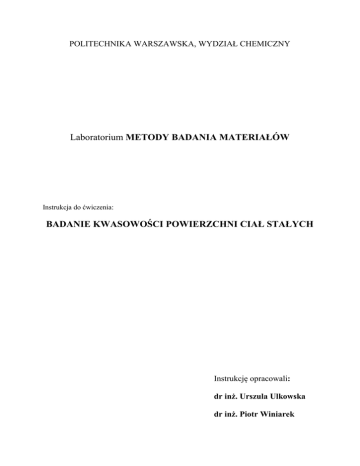 POLITECHNIKA WARSZAWSKA, WYDZIAŁ CHEMICZNY Laboratorium METODY BADANIA MATERIAŁÓW Instrukcja do ćwiczenia: BADANIE KWASOWOŚCI POWIERZCHNI CIAŁ STAŁYCH Instrukcję opracowali: dr inż. Urszula Ulkowska dr inż. Piotr Winiarek WSTĘP Jedną z właściwości opisujących powierzchnię ciała stałego jest jej kwasowość. Badania właściwości kwasowych powierzchni ciał stałych zaliczają się do podstawowych badań służących do zdefiniowania charakteru centrów znajdujących się na powierzchni substancji. Określenie tych właściwości jest niezwykle istotne, szczególnie w przypadku, gdy badany materiał ma być zastosowany jako sorbent, katalizator, nośnik itp. O praktycznym znaczeniu ciał stałych o cechach kwasowych niech świadczy zastosowanie ich jako katalizatorów w wielu podstawowych procesach w przemyśle chemicznym takich, jak kraking czy reforming. W chemii funkcjonuje wiele definicji kwasowości. W przypadku roztworów najczęściej operuje się definicjami opracowanymi przez Arrheniusa lub Franklina. W odniesieniu do powierzchni ciał stałych stosuje się definicje Brønsteda lub Lewisa. W myśl teorii Brønsteda kwasem jest substancja, która w reakcji kwasowo-zasadowej jest donorem protonu. Zgodnie z teorią Lewisa kwasem jest substancja będąca akceptorem pary elektronowej. Na powierzchniach ciał stałych można spotkać zarówno miejsca zdolne do oddawania protonów, jak i takie, które mogą wiązać parę elektronową. Miejsca takie nazywamy odpowiednio centrami kwasowymi typu Brønsteda i centrami kwasowymi typu Lewisa. Tworzenie takich centrów na powierzchni -Al2O3 przedstawiono na rysunku: H H O O Al Al - O -H2O O O O O H O- Al O + H O O O- +H2O + Al O + Al Al O O Al O Al O O W czasie prażenia tlenku glinu w wysokiej temperaturze (np. 500 C) dochodzi do odwadniania jego powierzchni. W wyniku tego procesu na powierzchni pojawiają się odsłonięte, nie w pełni skoordynowane kationy glinowe. Są one zdolne do koordynowania ligandów zawierających wolne pary elektronowe, a więc stanowią centra kwasowe typu Lewisa. Centra takie mogą koordynować cząsteczkę wody, w wyniku czego dochodzi do znacznego osłabienia wiązania O-H. Wiązanie to może ulegać heterolitycznej dysocjacji, odszczepiając proton. str. 2 W ten sposób na powierzchni tlenku glinu tworzy się centrum kwasowe typu Brønsteda. W rzeczywistości tlenek glinu kalcynowany w temperaturze ok. 500 C posiada na powierzchni praktycznie tylko centra kwasowe typu Lewisa. W celu scharakteryzowania kwasowości powierzchni ciała stałego należy określić: 1. stężenie wszystkich centrów kwasowych, obecnych na powierzchni (tzw. kwasowość ogólna), 2. moc powierzchniowych centrów kwasowych (mierząc stężenia centrów o różnych mocach kwasowych, wyznaczamy tzw. dystrybucję mocy centrów kwasowych powierzchni) 3. rodzaj centrów kwasowych obecnych na powierzchni (Brønsted czy Lewis). str. 3 BADANIE WŁAŚCIWOŚCI KWASOWYCH METODAMI MIARECZKOWYMI Metodami miareczkowymi uzyskuje się informacje na temat całkowitego stężenia centrów kwasowych (miareczkowanie przy pomocy amin) oraz mocy tych centrów (metoda wskaźników Hammetta) na powierzchni ciała stałego. Miareczkowanie centrów kwasowych przy pomocy amin prowadzi do oznaczenia całkowitego stężenia centrów kwasowych, zarówno typu Lewisa jak i Brønsteda. Pomiary te polegają na wprowadzeniu znanej ilości zasady (np. n-butyloaminy) w postaci roztworu w toluenie na powierzchnię badanej próbki, a następnie odmiareczkowaniu nieprzereagowanej aminy przy pomocy kwasu solnego wobec fenoloftaleiny jako wskaźnika. n-Butyloamina reaguje z centrami kwasowymi na powierzchni ciała stałego w następujący sposób (przy założeniu stechiometrii reakcji 1:1): (b) (a) + NH 2 H NH2 -O M M Adsorpcja zasady (n-BuNH2) na centrum kwasowym (a) Lewisa, (b) Brönsteda. (M - kation metalu) Oprócz znajomości stężenia centrów kwasowych na powierzchni badanego ciała stałego ważne jest również to, jaką mocą kwasową się one charakteryzują. Moc kwasową powierzchni ciała stałego definiuje się jako zdolność do przeprowadzenia obojętnej cząsteczki zasady (wskaźnika), zaadsorbowanej na jego powierzchni, w cząsteczkę sprzężonego z nią kwasu. Moc kwasową opisuje się przy pomocy funkcji kwasowej H0 (funkcja Hammetta). Reakcja wskaźnika z protonem pochodzącym od badanego kwasu biegnie według następującego równania: B H BH (1) Stała równowagi dysocjacji sprotonowanej formy wskaźnika ( BH ) wyrażana jest w następujący sposób: K BH aH aB a BH 2 gdzie aH , aB , aBH – są to aktywności odpowiednio protonu ( H ), zasadowej formy wskaźnika (B) i sprotonowanej formy wskaźnika ( BH ). Aktywność ( ai ) wyraża się wzorem: str. 4 3 ai f i ci f i – współczynnik aktywności składnika i, ci – stężenie składnika i. Po podstawieniu wzoru (3) do (2) i obustronnym zlogarytmowaniu otrzymuje się zależność: f log K BH log aH B f BH log cB c BH 4 gdzie: 5 pK BH log K BH f H 0 log a H B f BH 6 cB cBH 7 stąd: H 0 pK BH log Do wyznaczenia mocy kwasowej danej substancji stosuje się sekwencję wskaźników o zdefiniowanej mocy zasadowej (znanym pK BH , patrz – Tabela 1). Pomiary polegają na obserwowaniu zmiany zabarwienia kolejnych wskaźników w reakcji z badanym kwasem (forma obojętna wskaźnika i forma sprotonowana mają inne zabarwienie). Zmiana zabarwienia świadczy o przebiegu reakcji. Można ją obserwować, gdy co najmniej 10 % wskaźnika zaadsorbowanego na powierzchni ciała stałego będzie w formie kwasowej. Gdy stężenie formy zasadowej wskaźnika i formy kwasowej będą wynosiły 50 %, wtedy cB 1 , a zatem c BH H 0 pK BH . Jeżeli zatem zabarwienie wskaźnika jest takie jak jego formy kwasowej, oznacza to, że na powierzchni badanego ciała stałego są centra o mocy H0 równej bądź niższej niż pK BH tego wskaźnika. Moc kwasu jest tym większa im mniejsza jest moc zasadowa wskaźnika 