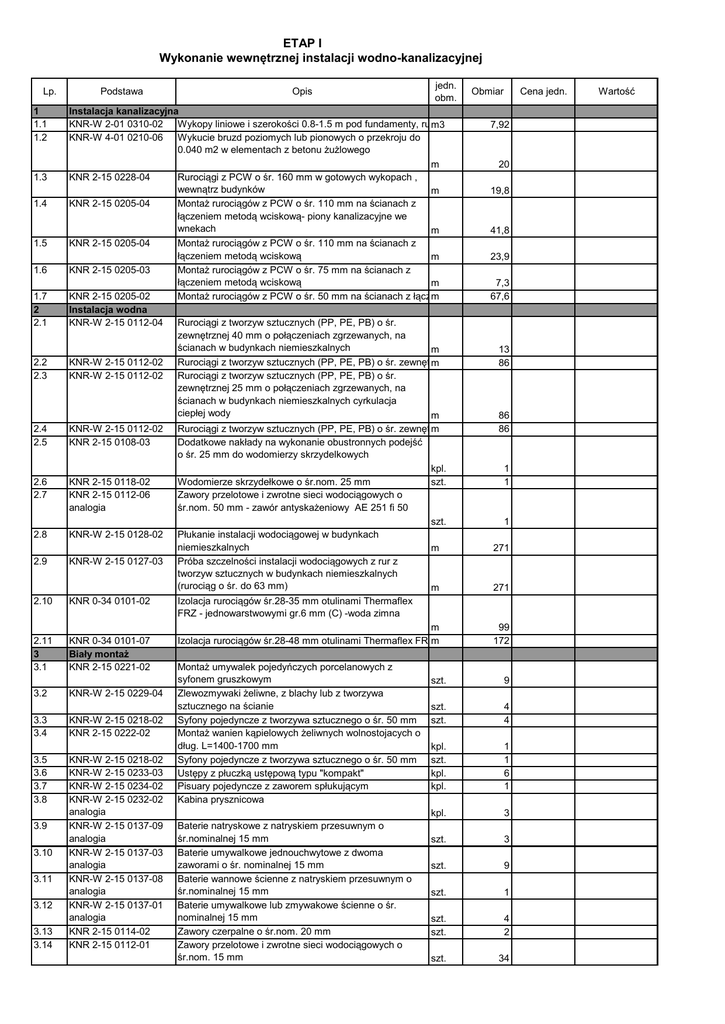 ETAP I Wykonanie wewnętrznej instalacji wodno-kanalizacyjnej Lp. 1 1.1 1.2 1.3 1.4 1.5 1.6 1.7 2 2.1 2.2 2.3 Podstawa KNR-W 2-15 0112-02 KNR 2-15 0108-03 2.6 2.7 KNR 2-15 0118-02 KNR 2-15 0112-06 analogia 2.8 KNR-W 2-15 0128-02 2.9 KNR-W 2-15 0127-03 2.10 KNR 0-34 0101-02 2.11 3 3.1 KNR 0-34 0101-07 Biały montaż KNR 2-15 0221-02 3.2 KNR-W 2-15 0229-04 3.3 3.4 KNR-W 2-15 0218-02 KNR 2-15 0222-02 3.5 3.6 3.7 3.8 KNR-W 2-15 0218-02 KNR-W 2-15 0233-03 KNR-W 2-15 0234-02 KNR-W 2-15 0232-02 analogia KNR-W 2-15 0137-09 analogia KNR-W 2-15 0137-03 analogia KNR-W 2-15 0137-08 analogia KNR-W 2-15 0137-01 analogia KNR 2-15 0114-02 KNR 2-15 0112-01 3.10 3.11 3.12 3.13 3.14 jedn. obm. Obmiar Cena jedn. Wartość Instalacja kanalizacyjna KNR-W 2-01 0310-02 Wykopy liniowe i szerokości 0.8-1.5 m pod fundamenty, rurociągi, kolektory m3 7,92w gruntach suchych z wydobyciem urobku łopatą lu KNR-W 4-01 0210-06 Wykucie bruzd poziomych lub pionowych o przekroju do 0.040 m2 w elementach z betonu żużlowego m 20 KNR 2-15 0228-04 Rurociągi z PCW o śr. 160 mm w gotowych wykopach , wewnątrz budynków m 19,8 KNR 2-15 0205-04 Montaż rurociągów z PCW o śr. 110 mm na ścianach z łączeniem metodą wciskową- piony kanalizacyjne we wnekach m 41,8 KNR 2-15 0205-04 Montaż rurociągów z PCW o śr. 110 mm na ścianach z łączeniem metodą wciskową m 23,9 KNR 2-15 0205-03 Montaż rurociągów z PCW o śr. 75 mm na ścianach z łączeniem metodą wciskową m 7,3 KNR 2-15 0205-02 Montaż rurociągów z PCW o śr. 50 mm na ścianach z łączeniem metodą67,6 wciskową m Instalacja wodna KNR-W 2-15 0112-04 Rurociągi z tworzyw sztucznych (PP, PE, PB) o śr. zewnętrznej 40 mm o połączeniach zgrzewanych, na ścianach w budynkach niemieszkalnych m 13 KNR-W 2-15 0112-02 Rurociągi z tworzyw sztucznych (PP, PE, PB) o śr. zewnętrznej zgrzewanych, na ścianach w budynkach m 25 mm o połączeniach 86 KNR-W 2-15 0112-02 Rurociągi z tworzyw sztucznych (PP, PE, PB) o śr. zewnętrznej 25 mm o połączeniach zgrzewanych, na ścianach w budynkach niemieszkalnych cyrkulacja ciepłej wody m 86 2.4 2.5 3.9 Opis Rurociągi z tworzyw sztucznych (PP, PE, PB) o śr. zewnętrznej zgrzewanych, na ścianach w budynkach m 25 mm o połączeniach 86 Dodatkowe nakłady na wykonanie obustronnych podejść o śr. 25 mm do wodomierzy skrzydelkowych kpl. 1 Wodomierze skrzydełkowe o śr.nom. 25 mm szt. 1 Zawory przelotowe i zwrotne sieci wodociągowych o śr.nom. 50 mm - zawór antyskażeniowy AE 251 fi 50 szt. 1 Płukanie instalacji wodociągowej w budynkach niemieszkalnych m 271 Próba szczelności instalacji wodociągowych z rur z tworzyw sztucznych w budynkach niemieszkalnych (rurociąg o śr. do 63 mm) m 271 Izolacja rurociągów śr.28-35 mm otulinami Thermaflex FRZ - jednowarstwowymi gr.6 mm (C) -woda zimna m 99 Izolacja rurociągów śr.28-48 mm otulinami Thermaflex FRZm- jednowarstwowymi gr.13 mm (J) - cyrkulacja i woda ciepła 172 Montaż umywalek pojedyńczych porcelanowych z syfonem gruszkowym Zlewozmywaki żeliwne, z blachy lub z tworzywa sztucznego na ścianie Syfony pojedyncze z tworzywa sztucznego o śr. 50 mm Montaż wanien kąpielowych żeliwnych wolnostojacych o dług. L=1400-1700 mm Syfony pojedyncze z tworzywa sztucznego o śr. 50 mm Ustępy z płuczką ustępową typu "kompakt" Pisuary pojedyncze z zaworem spłukującym Kabina prysznicowa Baterie natryskowe z natryskiem przesuwnym o śr.nominalnej 15 mm Baterie umywalkowe jednouchwytowe z dwoma zaworami o śr. nominalnej 15 mm Baterie wannowe ścienne z natryskiem przesuwnym o śr.nominalnej 15 mm Baterie umywalkowe lub zmywakowe ścienne o śr. nominalnej 15 mm Zawory czerpalne o śr.nom. 20 mm Zawory przelotowe i zwrotne sieci wodociągowych o śr.nom. 15 mm szt. 9 szt. szt. 4 4 kpl. szt. kpl. kpl. 1 1 6 1 kpl. 3 szt. 3 szt. 9 szt. 1 szt. szt. 4 2 szt. 34 Zawory przelotowe i zwrotne sieci wodociągowych o śr.nom. 15 mm Dodatek za wykonanie podejść odpływowych z rur i kształtek z nieplastyfikowanego PCW o śr. 50 mm umywalka, zlewozmywak, wanna,kabina prysznicowa 3.15 KNR 2-15 0112-01 3.16 KNR 2-15 0208-03 3.17 KNR 2-15 0208-05 Dodatek za wykonanie podejść odpływowych z rur i kształtek z nieplastyfikowanego PCW o śr. 110 mmustęp, pisuar 3.18 KNR-W 2-15 0142-03 analogia KNR 2-15 0212-01 Drzwiczki rewizyjne o wymiarach 200 x 250 mm drzwiczki rewizyjne 250*250 Montaż wpustów zeliwnych podłogowych o śr. 50 mm 3.19 szt. 7 szt. 17 szt. 7 szt. 4 szt. 2 0,00