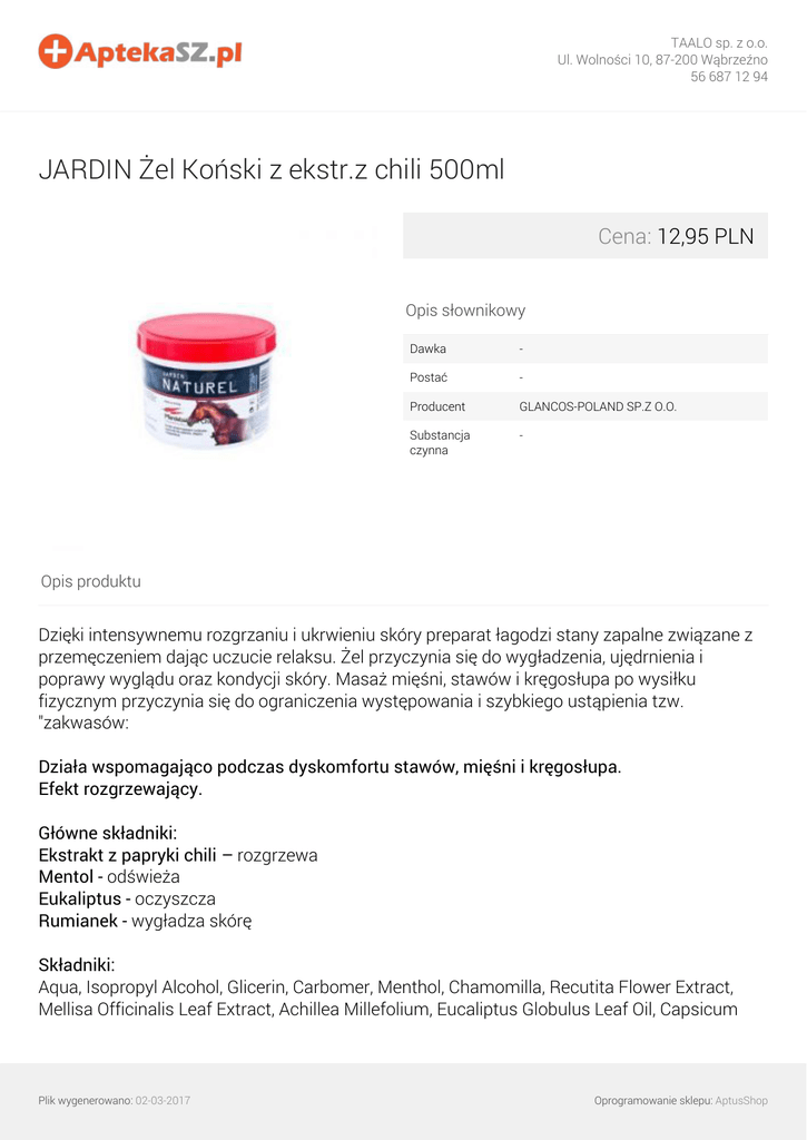 TAALO sp. z o.o. Ul. Wolności 10, 87-200 Wąbrzeźno 56 687 12 94 JARDIN Żel Koński z ekstr.z chili 500ml Cena: 12,95 PLN Opis słownikowy Dawka - Postać - Producent GLANCOS-POLAND SP.Z O.O. Substancja czynna - Opis produktu Dzięki intensywnemu rozgrzaniu i ukrwieniu skóry preparat łagodzi stany zapalne związane z przemęczeniem dając uczucie relaksu. Żel przyczynia się do wygładzenia, ujędrnienia i poprawy wyglądu oraz kondycji skóry. Masaż mięśni, stawów i kręgosłupa po wysiłku fizycznym przyczynia się do ograniczenia występowania i szybkiego ustąpienia tzw. "zakwasów: Działa wspomagająco podczas dyskomfortu stawów, mięśni i kręgosłupa. Efekt rozgrzewający. Główne składniki: Ekstrakt z papryki chili – rozgrzewa Mentol - odświeża Eukaliptus - oczyszcza Rumianek - wygładza skórę Składniki: Aqua, Isopropyl Alcohol, Glicerin, Carbomer, Menthol, Chamomilla, Recutita Flower Extract, Mellisa Officinalis Leaf Extract, Achillea Millefolium, Eucaliptus Globulus Leaf Oil, Capsicum Plik wygenerowano: 02-03-2017 Oprogramowanie sklepu: AptusShop TAALO sp. z o.o. Ul. Wolności 10, 87-200 Wąbrzeźno 56 687 12 94 Frutescens Fruit Extract, Benzyl Nicotinate, Sodium Hydroxide, Parfum, Viscum Album Leaf Extract, Foeniculum Vulgare Fruit Extract, Humulus Lupulus (Hops) Extract, Valeriana Officinalis Root Extract, Propylene Glicol, Phenylpropanol, Methylisothiazolinone, Phenoxyethanol, Methylparaben, Ethylparaben, Propylparaben, Butylparaben, Isobutylparaben, Limonene, C I. 14720, 16255. Sposób użycia: Żel należy wmasować w skórę. Delikatny masaż daje uczucie pełnego rozluźnienia. Uwaga: Tylko do użytku zewnętrznego. Chronić miejsca podrażnione oraz okolice oczu, ust, nosa i błon śluzowych. Pojemność: 500ml Plik wygenerowano: 02-03-2017 Powered by TCPDF (www.tcpdf.org) Oprogramowanie sklepu: AptusShop