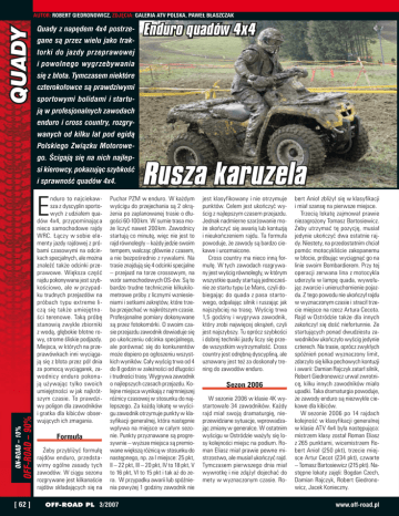 QUADY Autor: ???????? autor: Robert Giedronowicz, zdjĘcia: ????? Zdjęcia: Galeria ATV Polska, paweł błaszczak Quady z napędem 4x4 postrzegane są przez wielu jako trak- Enduro quadów 4x4 torki do jazdy przeprawowej i powolnego wygrzebywania się z błota. Tymczasem niektóre czterokołowce są prawdziwymi sportowymi bolidami i startują w profesjonalnych zawodach enduro i cross country, rozgrywanych od kilku lat pod egidą Polskiego Związku Motorowego. Ścigają się na nich najlepsi kierowcy, pokazując szybkość i sprawność quadów 4x4. ON-ROAD – 10% OFF-ROAD – 90% E [ 62 ] nduro to najciekawsza z dyscyplin sportowych z udziałem quadów 4x4, przypominająca nieco samochodowe rajdy WRC. Łączy w sobie elementy jazdy rajdowej z próbami czasowymi na odcinkach specjalnych, ale można znaleźć także odcinki przeprawowe. Większa część rajdu pokonywana jest szybkościowo, ale w przypadku trudnych przejazdów na próbach typu extreme liczą się także umiejętności terenowe. Taką próbę stanowią zwykle zbiorniki z wodą, głębokie błotne rowy, strome śliskie podjazdy. Miejsca, w których na przeprawówkach inni wyciągają się z błota przez pół dnia za pomocą wyciągarek, zawodnicy enduro pokonują używając tylko swoich umiejętności w jak najkrótszym czasie. To prawdziwy poligon dla zawodników i gratka dla kibiców obserwujących ich zmagania. Formuła Żeby przybliżyć formułę rajdów enduro, przedstawimy ogólne zasady tych zawodów. W ciągu sezonu rozgrywane jest kilkanaście rajdów składających się na Rusza karuzela Puchar PZM w enduro. W każdym wyścigu do przejechania są 2 okrążenia po zaplanowanej trasie o długości 60-100 km. W sumie trasa może liczyć nawet 200 km. Zawodnicy startują co minutę, więc nie jest to rajd równoległy – każdy jedzie swoim tempem, walcząc głównie z czasem, a nie bezpośrednio z rywalami. Na trasie znajdują się 4 odcinki specjalne – przejazd na torze crossowym, na wzór samochodowych OS-ów. Są to bardzo trudne technicznie kilkukilometrowe próby z licznymi wzniesieniami i setkami zakrętów, które trzeba przejechać w najkrótszym czasie. Profesjonalne pomiary dokonywane są przez fotokomórki. O swoim czasie przejazdu zawodnik dowiaduje się po ukończeniu odcinka specjalnego, ale porównać się do konkurentów może dopiero po ogłoszeniu wszystkich wyników. Cały wyścig trwa od 4 do 8 godzin w zależności od długości i trudności trasy. Wygrywa zawodnik o najlepszych czasach przejazdu. Kolejne miejsca wynikają z najmniejszej różnicy czasowej w stosunku do najlepszego. Za każdą lokatę w wyścigu zawodnik otrzymuje punkty w klasyfikacji generalnej, która następnie wpływa na miejsce w całym sezonie. Punkty przyznawane są progresywnie – wyższe miejsca są premiowane większą różnicą w stosunku do następnego, np. za I miejsce: 25 pkt, II – 22 pkt, III – 20 pkt, IV to 18 pkt, V to 16 pkt, VI to 15 pkt i tak aż do zera. W przypadku awarii lub spóźnienia powyżej 1 godziny zawodnik nie OFF-ROAD PL 3/2007 jest klasyfikowany i nie otrzymuje punktów. Celem jest ukończyć wyścig z najlepszym czasem przejazdu. Jednak nadmierne szarżowanie może skończyć się awarią lub kontuzją i nieukończeniem rajdu. Ta formuła powoduje, że zawody są bardzo ciekawe i urozmaicone. Cross country ma nieco inną formułę. W tych zawodach rozgrywany jest wyścig równoległy, w którym wszystkie quady startują jednocześnie ze startu typu Le Mans, czyli dobiegając do quada z pasa startowego, odpalając silnik i ruszając jak najszybciej na trasę. Wyścig trwa 1,5 godziny i wygrywa zawodnik, który zrobi najwięcej okrążeń, czyli jest najszybszy. Tu oprócz szybkości i dobrej techniki jazdy liczy się przede wszystkim wytrzymałość. Cross country jest odrębną dyscypliną, ale uznawany jest też za doskonały trening do zawodów enduro. Sezon 2006 W sezonie 2006 w klasie 4K wystartowało 34 zawodników. Każdy rajd miał swoją dramaturgię, nieprzewidziane sytuacje, wprowadzając zmiany w generalce. W ostatnim wyścigu w Ostródzie ważyły się losy kolejności miejsc na podium. Roman Eliasz miał prawie pewne mistrzostwo, ale musiał ukończyć rajd. Tymczasem pierwszego dnia miał wywrotkę i nie zdążył dojechać do mety w wyznaczonym czasie. Ro- bert Anioł zbliżył się w klasyfikacji i miał szansę na pierwsze miejsce. Trzecią lokatę zajmował prawie niezagrożony Tomasz Bartosiewicz. Żeby utrzymać tę pozycję, musiał jedynie ukończyć dwa ostatnie rajdy. Niestety, na przedostatnim chciał pomóc motocykliście zakopanemu w błocie, próbując wyciągnąć go na linie swoim Bombardierem. Przy tej operacji zerwana lina z motocykla uderzyła w lampę quada, wywołując zwarcie i unieruchomienie pojazdu. Z tego powodu nie ukończył rajdu w wyznaczonym czasie i stracił trzecie miejsce na rzecz Artura Cecota. Rajd w Ostródzie także dla innych zakończył się dość niefortunnie. Ze startujących ponad dwudziestu zawodników ukończyło wyścig jedynie czterech. Na trasie, oprócz zwykłych spóźnień ponad wyznaczony limit, zdarzyło się kilka pechowych kontuzji i awarii: Damian Rajczyk zatarł silnik, Robert Giedronowicz urwał zwrotnicę, kilku innych zawodników miało upadki. Taka dramaturgia powoduje, że zawody enduro są niezwykle ciekawe dla kibiców. W sezonie 2006 po 14 rajdach kolejność w klasyfikacji generalnej w klasie ATV 4x4 była następująca: mistrzem klasy został Roman Eliasz z 265 punktami, wicemistrzem Robert Anioł (250 pkt), trzecie miejsce Artur Cecot (234 pkt), czwarte – Tomasz Bartosiewicz (215 pkt). Następne lokaty zajęli: Bogdan Czech, Damian Rajczyk, Robert Giedronowicz, Jacek Konieczny. www.off-road.pl Prezentacja czołowych zawodników enduro w klasie ATV 4K (quady z napędem 4x4) Roman Eliasz Aktualny mistrz enduro w klasie 4K. Zdobywca Pucharu PZM w enduro w 2006 roku. W 2005 roku był piąty, w 2004 – d