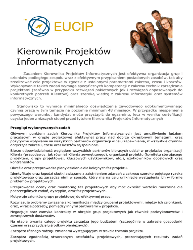 Kierownik Projektów Informatycznych Zadaniem Kierownika Projektów Informatycznych jest efektywna organizacja grup i cz³onków podleg³ego zespo³u wraz z efektywnym przypisaniem posiadanych zasobów, tak aby zrealizowaæ cele projektowe w zgodzie z ustalonymi parametrami zakresu, czasu i kosztów. Wykonywanie takich zadañ wymaga specyficznych kompetencji z zakresu technik zarz¹dzania projektami (zarówno w przypadku rozwi¹zañ pakietowych jak i rozwi¹zañ dopasowanych do konkretnych potrzeb Klientów) oraz szerok¹ wiedzê z zakresu informatyki oraz systemów informatycznych. Stanowisko to wymaga minimalnego doœwiadczenia zawodowego udokumentowanego czynn¹ prac¹ w tym temacie na poziomie minimum 48 miesiêcy. W przypadku niespe³nienia powy¿szego warunku, kandydat mo¿e przyst¹piæ do egzaminu, lecz w wyniku certyfikacji uzyska jeden z ni¿szych stopni przed tytu³em Kierownika Projektów Informatycznych Przegl¹d wykonywanych zadañ G³ównym punktem zadañ Kierownika Projektów Informatycznych jest umo¿liwienie ludziom pracuj¹cym w grupie projektowej efektywnej pracy nad dobrze okreœlonymi tematami, oraz pozytywne wp³ywanie na wszystkich partnerów organizacji w celu zapewnienia, i¿ wszystkie czynniki dotycz¹ce zakresu, czasu oraz kosztów s¹ spe³nione. Bierze odpowiedzialnoœæ wzglêdem wszystkich partnerów bior¹cych udzia³ w projekcie: organizacji Klienta (pracodawcy, jak równie¿ Klienta zewnêtrznego), organizacji projektu (komitetu steruj¹cego projektem, grupy projektowej, kluczowych u¿ytkowników, etc.), u¿ytkowników docelowych oraz kontrahentów. Okreœla oraz przeprowadza plany dzia³ania dla kolejnych faz projektu. Identyfikuje oraz ³agodzi skutki zwi¹zane z zaistnieniem zdarzeñ z zakresu szeroko pojêtego ryzyka projektowego oraz zarz¹dza nimi w sposób, który ma na celu unikniêcie wyst¹pienia ich w formie problemów projektowych. Przeprowadza oceny oraz monitoring faz projektowych aby móc okreœliæ wartoœci mierzalne dla poszczególnych zadañ, dyscyplin, oraz faz projektowych. Motywuje cz³onków grupy projektowej do efektywnej pracy. Rozwi¹zuje problemy zwi¹zane z komunikacj¹ miêdzy grupami projektowymi, miêdzy ich cz³onkami, oraz, w razie potrzeby, pomiêdzy innymi partnerami w projekcie. Negocjuje oraz zamyka kontrakty w obrêbie grup projektowych jak równie¿ podwykonawców i zewnêtrznych dostawców. Na etapie trwania ca³ego projektu zarz¹dza jego bud¿etem (szczególnie w zakresie gospodarki czasem oraz przydzia³u œrodków pieniê¿nych). Zarz¹dza ró¿nego rodzaju zmianami wystêpuj¹cymi w trakcie trwania projektu. Zarz¹dza zgodnoœci¹ stworzonych artefaktów projektowych, prezentuj¹cych rezultaty zadañ projektowych. Kluczowe umiejêtnoœci behawioralne Rola Kierownika Projektu Informatycznego wymaga posiadania ogólnej wiedzy z zakresu IT, chêci ci¹g³ego uczenia siê, doskona³ej umiejêtnoœci komunikowania siê z ludŸmi, zarówno w formie pisemnej jak i ustnej, oraz posiadania szerokiego zasobu bardziej szczegó³owych umiejêtnoœci behawioralnych. Zdolnoœci dobrej wspó³pracy s¹ wymagane do stworzenia i utrzymywania dobrej grupy projektowej, dlatego te¿ konieczna jest umiejêtnoœæ rozumienia potrzeb grupy i stawiania ich jako priorytetowych. Poœwiêcanie uwagi, umiejêtnoœæ zbierania informacji, wra¿liwoœæ organizacyjna i handlowa s¹ wymagane do szybkiego i dog³êbnego rozumienia potrzeb Klientów oraz Partnerów. Otwartoœæ, wizjonerstwo, umiejêtnoœæ przeprowadzania ró¿nego rodzaju analiz, wyobraŸnia, aktywnoœæ s¹ wymagane formu³owania oraz zatwierdzania rozwi¹zañ projektowych. Stale stawianie sobie nowych celów, umiejêtnoœæ dostosowywania siê do panuj¹cych, czêsto stresuj¹cych warunków, determinacja, umiejêtnoœci z zakresu planowania i kontroli, budowania grupy i jej przewodzeniu s¹ wymagane do realizacji za³o¿onych zadañ. Polskie Towarzystwo Informatyczne Zarz¹d G³ówny Al. Solidarnoœci 82A m.5, 01-003 Warszawa tel: +48 22 636 89 87 fax: +48 22 838 47 05 www.eucip.pl [email protected]