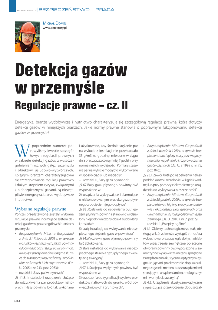 promotor 9/2013 | bezpieczeństwo – praca Michał Domin www.detektory.pl Detekcja gazów w przemyśle Regulacje prawne – cz. II Energetyka, branże wydobywcze i hutnictwo charakteryzują się szczegółową regulacją prawną, która dotyczy detekcji gazów w niniejszych branżach. Jakie normy prawne stanowią o poprawnym fukcjonowaniu detekcji gazów w przemyśle? W poprzednim numerze poruszyliśmy kwestie szczegółowych regulacji prawnych w zakresie detekcji gazów, z wyszczególnieniem różnych gałęzi przemysłu i obiektów usługowo-wytwórczych. Kolejnymi branżami charakteryzującymi się szczegółowością regulacji prawnych i dużym stopniem ryzyka, związanymi z niebezpiecznymi gazami, są niewątpliwie: energetyka, branże wydobywcze i hutnictwo. Wybrane regulacje prawne Poniżej przedstawione zostały wybrane regulacje prawne, normujące system detekcji gazów w poszczególnych branżach przemysłu. • Rozporządzenie Ministra Gospodarki z dnia 21 listopada 2005 r. w sprawie warunków technicznych, jakim powinny odpowiadać bazy i stacje paliw płynnych, rurociągi przesyłowe dalekosiężne służące do transportu ropy naftowej i produktów naftowych i ich usytuowanie (Dz. U. 2005 r. nr 243, poz. 2063): – rozdział II „Bazy paliw płynnych”: „§ 11.3. Instalacje i urządzenia służące do odzyskiwania par produktów naftowych I klasy powinny być tak wykonane 20 i użytkowane, aby średnie stężenie par na wylocie z instalacji nie przekraczało 35 g/m3 na godzinę, mierzone w ciągu dnia pracy, przez co najmniej 7 godzin, przy normalnej ich wydajności. Pomiary stężenia par na wylocie mogą być wykonywane w sposób ciągły lub nieciągły”. – rozdział III „Bazy gazu płynnego”: „§ 67.Bazy gazu płynnego powinny być wyposażone w: 2) urządzenia wykrywające i alarmujące o niekontrolowanym wycieku gazu płynnego z odcięciem jego dopływu”. „§ 83 .Rozlewnia do napełniania butli gazem płynnym powinna stanowić wydzielony niepodpiwniczony obiekt budowlany i posiadać: 5) stałą instalację do wykrywania niebezpiecznego stężenia gazu w powietrzu.” „§ 84.W rozlewni gazu płynnego powinny być zblokowane: 2) stała instalacja do wykrywania niebezpiecznego stężenia gazu płynnego z wentylacją awaryjną”. – rozdział III „Bazy gazu płynnego”: „§ 97.1. Stacje paliw płynnych powinny być wyposażone w: 3) urządzenia do sygnalizacji wycieku produktów naftowych do gruntu, wód powierzchniowych i gruntowych”; • Rozporządzenie Ministra Gospodarki z dnia 6 września 1999 r. w sprawie bezpieczeństwa i higieny pracy przy magazynowaniu, napełnianiu i rozprowadzaniu gazów płynnych (Dz. U. z 1999 r. nr 75, poz. 846): „§ 23.1.Zawór butli po napełnieniu należy poddać kontroli szczelności w kąpieli wodnej lub przy pomocy elektronicznego urządzenia do wykrywania nieszczelności”. • Rozporządzenie Ministra Gospodarki z dnia 28 grudnia 2009 r. w sprawie bezpieczeństwa i higieny pracy przy budowie i eksploatacji sieci gazowych oraz uruchamianiu instalacji gazowych gazu ziemnego (Dz. U. 2010 r. nr 2, poz. 6): – rozdział 1 „Przepisy ogólne”: „§ 4.1. Obiekty technologiczne ze stałą obsługą, w których może wystąpić atmosfera wybuchowa, oraz przyległe do tych obiektów przestrzenie zewnętrzne połączone otworami powinny być wyposażone w samoczynne wykrywacze metanu sprzężone z urządzeniami akustyczno-optycznymi sygnalizującymi przekroczenie dopuszczalnego stężenia metanu oraz z urządzeniami sterującymi urządzeniami technologicznymi i wentylacją awaryjną”. „§ 4.2. Urządzenia akustyczno-optyczne sygnalizujące przekroczenie dopuszczal- nego stężenia metanu powinny przy stężeniu 10% dolnej granicy wybuchowości, zwanej dalej DGW, włączyć ostrzegawczy sygnał optyczny i akustyczny, a przy 40% DGW – wyłączyć urządzenia z ruchu”. „§ 5.1. W pomieszczeniach technologicznych bez stałej obsługi oraz w przyległych przestrzeniach zewnętrznych, w których może wystąpić atmosfera wybuchowa, prowadzi się okresowe pomiary stężenia metanu”. „§ 5.2. Częstość pomiarów, o których mowa w ust. 1, określa operator sieci gazowej”. „§ 5.3. Wyniki pomiarów, o których mowa w ust. 1 i 2, powinny być dokumentowane i archiwizowane”. Uwaga: tutaj doskonale znajdują zastosowanie przenośne mierniki gazów z wbudowaną pamięcią i możliwością zrzutu pamięci do komputera, dzięki czemu można w prosty i szybki sposób archiwizować nawet wielomiejscowe wyniki pomiarów. „§ 10. W przypadku zagrożenia wystąpieniem metanu lub niedoboru tlenu, podczas prowadzenia prac, w szczególności w wykopach, kanałach, zbiornikach, studzienkach, związanych z remontami i naprawą gazociągów, należy stosować odpowiednie do zagrożeń środki ochrony indywidualnej i sprzęt służący do asekuracji lub ewakuacji z zagrożonego obszaru”. „§ 11.1. Przed przystąpieniem do prac w miejscach zagrożonych obecnością gazu ziemnego należy wykonać pomiary stężenia metanu i stężenia tlenu. Pomiary należy również wykonywać podczas prowadzenia prac”. – rozdział 3 „Budowa, przebudowa, remonty i eksploatacja sieci gazowej gazu ziemnego” „§ 39. Kotłownię gazową w obiekcie technologicznym z kotłami o mocy cieplnej większej niż 60 kW należy wyposażyć w urządzenia sygnalizacyjno-odcinające dopływ gazu ziemnego do kotła”. „§ 46. W obiektach tłoczni należy stosować wentylację awaryjną o odpowiedniej wydajności i dwóch niezależnych systemach sterowania, a w szczególności: 1) systemie automatycznym – sprzężonym z urządzeniem do wykrywania obecności metanu”; – rozdział 4 „Uruchamianie instalacji gazu ziemnego w obiektach budowlanych oraz montaż i demontaż gazomierzy” „§ 60.1. Przed przystąpieniem do montażu lub demontażu gazomierza należy: 2) sprawdzić szczelność połączeń gazomierza z instalacj