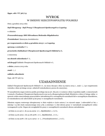 Sygn. akt: VU 567/13 WYROK W IMIENIU RZECZYPOSPOLITEJ POLSKIEJ Dnia 4 grudnia 2013 roku Sąd Okręgowy - Sąd Pracy i Ubezpieczeń Społecznych w Legnicy w składzie: Przewodniczący: SSO Mirosława Molenda-Migdalewicz Protokolant: Katarzyna Awsiukiewicz po rozpoznaniu w dniu 4 grudnia 2013 r. w Legnicy sprawy z wniosku F. L. przeciwko Zakładowi Ubezpieczeń Społecznych Oddział w L. o emeryturę na skutek odwołania F. L. od decyzji Zakładu Ubezpieczeń Społecznych Oddział w L. z dnia 4 marca 2013 roku znak (...) oddala odwołanie Sygn. akt VU 567/13 UZASADNIENIE Zakład Ubezpieczeń Społecznych Oddział w L. na mocy decyzji z dnia 04 marca 2013 r., znak (...) po rozpatrzeniu wniosku z dnia 25 lutego 2013r. odmówił wnioskodawcy prawa do emerytury. W uzasadnieniu organ rentowy podał, powołując się na art. 184 ust.1 i 2 ustawy z dnia 17 grudnia 1998r. o emeryturach i rentach z Funduszu Ubezpieczeń Społecznych oraz na § 4 Rozporządzenia Rady Ministrów z dnia 07 lutego 1983r. w sprawie wieku emerytalnego pracowników zatrudnionych w szczególnych warunkach lub w szczególnym charakterze, iż wnioskodawca nie udowodnił 15 lat pracy w szczególnych warunkach. Zdaniem organu rentowego ubezpieczony w dniu wejścia w życie ustawy ( 01 styczeń 1999r. ) udowodnił 27 lat, 1 miesiąc i 15 dni stażu sumarycznego oraz 5 lat, 9 miesięcy i 2 dni okresu pracy w warunkach szczególnych wobec wymaganych 15 lat. Organ nie uwzględnił do pracy w szczególnych warunkach okresu zatrudnienia: - od dnia 21.10.1971 r. do 31.05.1975r. w (...)Spółdzielni (...) w G.; - od dnia 13.06.1975 r. do 31.08.1978 r. w (...)Spółdzielni(...) w L.; - od dnia 12.09.1978 r. do 14.01.1979 r. w (...) Przedsiębiorstwie (...) w Z.; - od dnia 19.10.1984 r. do 31.08.1990 r. w Spółdzielni Mieszkaniowej (...) w L., ponieważ wnioskodawca nie przedłożył świadectw wykonywania pracy w szczególnych warunkach. Dnia 21 marca 2013r. wnioskodawca wniósł odwołanie od powyższej decyzji ZUS. W odwołaniu ubezpieczony podnosi, iż posiada wszystkie świadectwa pracy zakładów w których był zatrudniony na stanowisku spawacza w pełnym wymiarze czasu pracy. W odpowiedzi organu rentowego na powyższe odwołanie wnosi on o jego oddalenie podtrzymując treść zaskarżonej decyzji. Sąd ustalił następujący stan faktyczny: F. L., ur. (...), wykształcenie podstawowe, z zawodu spawacz. Na dzień 01 stycznia 1999r. wykazał 27 lat, 1 miesiąc i 15 dni okresów składkowych i nieskładkowych. Nie przystąpił do OFE. Udowodnił 5 lat, 9 miesięcy i 2 dni stażu pracy w szczególnych warunkach. Wiek emerytalny 60 lat osiągnął (...) ( bezsporne ) W okresie zatrudnienia w (...)Spółdzielni (...) w G.w latach od 21.10.1971 r. do 31.05.1975 r. odbył podstawowy kurs spawania elektrycznego i spawania acetylenowego w okresie od 02.11.1974 r. do 05.04.1975 r.. Uprawnienia spawalnicze zdobył 05.04.1975 r.. Dowód: akta osobowe– świadectwo pracy, wyjaśnienia wnioskodawcy – nagranie audio-wideo 00:35:10. W latach od dnia 13.06.1975 r. do 31.08.1978 r. wnioskodawca był zatrudniony w (...)Spółdzielni (...)w L.na stanowisku spawacza. Zakład zajmował się produkcją taczek, piecy do centralnego ogrzewania, kotłów, spawaniem kominów. Wnioskodawca w pełnym wymiarze czasu pracy zajmował się spawaniem elektrycznym, gazowym i przy wycinaniu palnikiem acetylenowym. Dowód: akta sądowe, akta ZUS - świadectwo pracy, k. 5; zeznania świadka –H. T., nagranie audio- wideo 00:21:36; wyjaśnienia wnioskodawcy – nagranie audio – wideo 00:40:40. W latach od dnia 12.09.1978 r. do 14.01.1979 r. wnioskodawca był zatrudniony w (...) Przedsiębiorstwie (...) w Z. na stanowisku spawacz - monter. Na początku zatrudnienia pracował w Polsce, a następnie przebywał na kontrakcie w dawnej NRD gdzie w pełnym wymiarze czasu pracy wykonywał prace przy spawaniu elektrycznym oraz gazowym konstrukcji stalowych i rurociągów. Była to praca na wysokościach. Dowód: akta osobowe – świadectwo pracy; wyjaśnienia wnioskodawcy – nagranie audio – wideo 00:42:15. W latach od dnia 19.10.1984 r. do 31.08.1990 r. wnioskodawca był zatrudniony w Spółdzielni Mieszkaniowej (...) w L.. W powyższym zakładzie wykonywał w pełnym wymiarze czasu pracy prace przy spawaniu grzejników, które były następnie montowane na klatkach schodowych oraz przy spawaniu rur do centralnego ogrzewania. Dowód: akta osobowe – umowa o pracę, angaże, świadectwo pracy; zeznania świadków – M. R.- nagranie audio-wideo 00:15:56, J. T. - nagranie audio – wideo 00:28:36; wyjaśnienia wnioskodawcy – nagranie audio-wideo 00:46:20. Sąd zważył, co następuje: Odwołanie jest nieuzasadnione. Zgodnie z treścią art. 32 ust. 1 ustawy z dnia 17 grudnia 1998r. o emeryturach i rentach z Funduszu Ubezpieczeń Społecznych ubezpieczonym urodzonym przed 01 stycznia 1949r., będącym pracownikami zatrudnionymi w szczególnych warunkach lub w szczególnym charakterze, przysługuje emerytura w wieku niższym niż określony w art. 27 pkt.1, tj. innym niż 65 lat dla mężczyzn. Wiek emerytalny, o którym mowa w ust. 1, rodzaje prac lub stanowisk oraz warunki, na podstawie których osobom zatrudnionym w szczególnych warunkach przysługuje prawo do emerytury, ustala się na podstawie przepisów dotychczasowych, tj. Rozporządzenia Rady Ministrów z dnia 07 lutego 1983r. w sprawie wieku emerytalnego pracowników zatrudnionych w szczególnych warunkach lub w szczególnym charakterze. I tak zgodnie z § 4 tego rozporządzenia pracownik, który wykonywał pracę w szczególnych warunkach, wymienione w wykazie A, nabywa prawo do emerytury, jeżeli spełnia łącznie następujące warunki: 1) osiągnął wiek emerytalny wynoszący 60 lat dla mężczyzn, 2) ma wymagany okres zatrudnienia 25 lat, w tym co najmniej 15 lat pracy w szczególnych warunkach. Z mocy art. 184 ust. 1 ustawy emerytalnej cytowane przepisy znajdują zastosowanie w stosunku do ubezpiecz