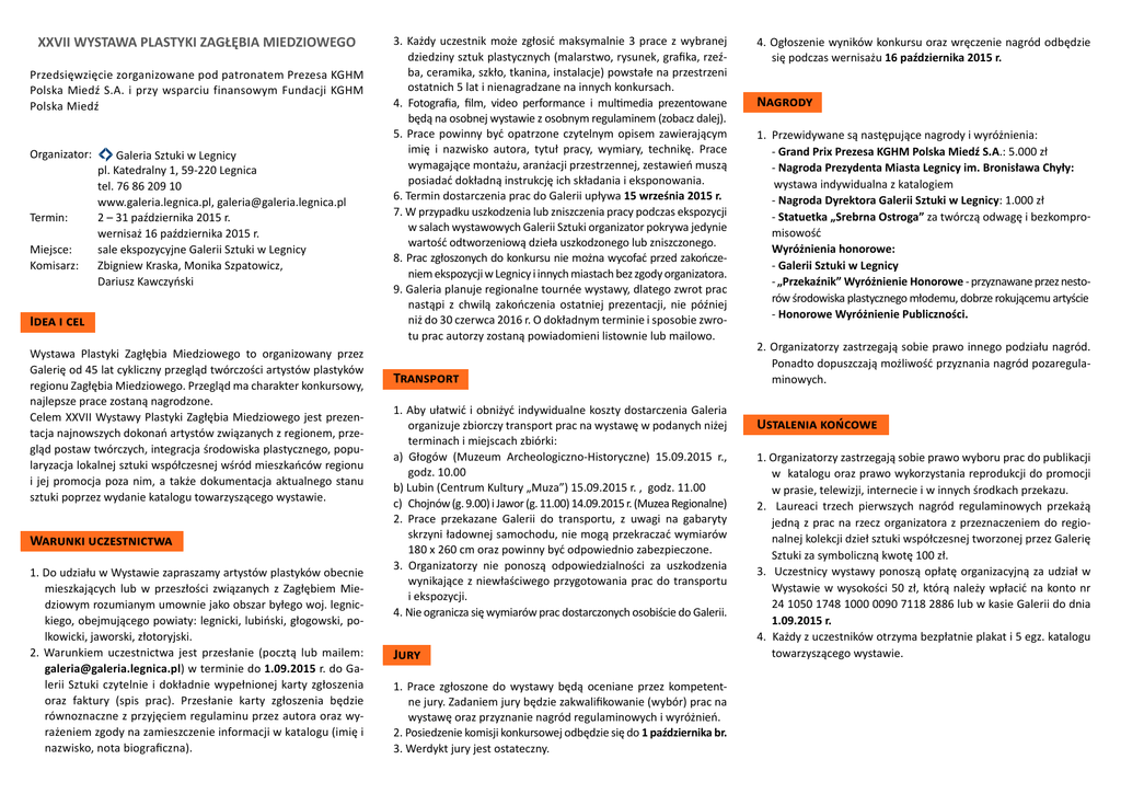 XXVII WYSTAWA PLASTYKI ZAGŁĘBIA MIEDZIOWEGO Przedsięwzięcie zorganizowane pod patronatem Prezesa KGHM Polska Miedź S.A. i przy wsparciu finansowym Fundacji KGHM Polska Miedź Organizator: Galeria Sztuki w Legnicy pl. Katedralny 1, 59-220 Legnica tel. 76 86 209 10 www.galeria.legnica.pl, [email protected] Termin: 2 – 31 października 2015 r. wernisaż 16 października 2015 r. Miejsce: sale ekspozycyjne Galerii Sztuki w Legnicy Komisarz: Zbigniew Kraska, Monika Szpatowicz, Dariusz Kawczyński Idea i cel Wystawa Plastyki Zagłębia Miedziowego to organizowany przez Galerię od 45 lat cykliczny przegląd twórczości artystów plastyków regionu Zagłębia Miedziowego. Przegląd ma charakter konkursowy, najlepsze prace zostaną nagrodzone. Celem XXVII Wystawy Plastyki Zagłębia Miedziowego jest prezentacja najnowszych dokonań artystów związanych z regionem, przegląd postaw twórczych, integracja środowiska plastycznego, popularyzacja lokalnej sztuki współczesnej wśród mieszkańców regionu i jej promocja poza nim, a także dokumentacja aktualnego stanu sztuki poprzez wydanie katalogu towarzyszącego wystawie. Warunki uczestnictwa 1. Do udziału w Wystawie zapraszamy artystów plastyków obecnie mieszkających lub w przeszłości związanych z Zagłębiem Miedziowym rozumianym umownie jako obszar byłego woj. legnickiego, obejmującego powiaty: legnicki, lubiński, głogowski, polkowicki, jaworski, złotoryjski. 2. Warunkiem uczestnictwa jest przesłanie (pocztą lub mailem: [email protected]) w terminie do 1.09.2015 r. do Galerii Sztuki czytelnie i dokładnie wypełnionej karty zgłoszenia oraz faktury (spis prac). Przesłanie karty zgłoszenia będzie równoznaczne z przyjęciem regulaminu przez autora oraz wyrażeniem zgody na zamieszczenie informacji w katalogu (imię i nazwisko, nota biograficzna). 3. Każdy uczestnik może zgłosić maksymalnie 3 prace z wybranej dziedziny sztuk plastycznych (malarstwo, rysunek, grafika, rzeźba, ceramika, szkło, tkanina, instalacje) powstałe na przestrzeni ostatnich 5 lat i nienagradzane na innych konkursach. 4. Fotografia, film, video performance i multimedia prezentowane będą na osobnej wystawie z osobnym regulaminem (zobacz dalej). 5. Prace powinny być opatrzone czytelnym opisem zawierającym imię i nazwisko autora, tytuł pracy, wymiary, technikę. Prace wymagające montażu, aranżacji przestrzennej, zestawień muszą posiadać dokładną instrukcję ich składania i eksponowania. 6. Termin dostarczenia prac do Galerii upływa 15 września 2015 r. 7. W przypadku uszkodzenia lub zniszczenia pracy podczas ekspozycji w salach wystawowych Galerii Sztuki organizator pokrywa jedynie wartość odtworzeniową dzieła uszkodzonego lub zniszczonego. 8. Prac zgłoszonych do konkursu nie można wycofać przed zakończeniem ekspozycji w Legnicy i innych miastach bez zgody organizatora. 9. Galeria planuje regionalne tournée wystawy, dlatego zwrot prac nastąpi z chwilą zakończenia ostatniej prezentacji, nie później niż do 30 czerwca 2016 r. O dokładnym terminie i sposobie zwrotu prac autorzy zostaną powiadomieni listownie lub mailowo. Transport 1. Aby ułatwić i obniżyć indywidualne koszty dostarczenia Galeria organizuje zbiorczy transport prac na wystawę w podanych niżej terminach i miejscach zbiórki: a) Głogów (Muzeum Archeologiczno-Historyczne) 15.09.2015 r., godz. 10.00 b) Lubin (Centrum Kultury „Muza”) 15.09.2015 r. , godz. 11.00 c) Chojnów (g. 9.00) i Jawor (g. 11.00) 14.09.2015 r. (Muzea Regionalne) 2. Prace przekazane Galerii do transportu, z uwagi na gabaryty skrzyni ładownej samochodu, nie mogą przekraczać wymiarów 180 x 260 cm oraz powinny być odpowiednio zabezpieczone. 3. Organizatorzy nie ponoszą odpowiedzialności za uszkodzenia wynikające z niewłaściwego przygotowania prac do transportu i ekspozycji. 4. Nie ogranicza się wymiarów prac dostarczonych osobiście do Galerii. Jury 1. Prace zgłoszone do wystawy będą oceniane przez kompetentne jury. Zadaniem jury będzie zakwalifikowanie (wybór) prac na wystawę oraz przyznanie nagród regulaminowych i wyróżnień. 2. Posiedzenie komisji konkursowej odbędzie się do 1 października br. 3. Werdykt jury jest ostateczny. 4. Ogłoszenie wyników konkursu oraz wręczenie nagród odbędzie się podczas wernisażu 16 października 2015 r. Nagrody 1. Przewidywane są następujące nagrody i wyróżnienia: - Grand Prix Prezesa KGHM Polska Miedź S.A.: 5.000 zł - Nagroda Prezydenta Miasta Legnicy im. Bronisława Chyły: wystawa indywidualna z katalogiem - Nagroda Dyrektora Galerii Sztuki w Legnicy: 1.000 zł - Statuetka „Srebrna Ostroga” za twórczą odwagę i bezkompromisowość Wyróżnienia honorowe: - Galerii Sztuki w Legnicy - „Przekaźnik” Wyróżnienie Honorowe - przyznawane przez nestorów środowiska plastycznego młodemu, dobrze rokującemu artyście - Honorowe Wyróżnienie Publiczności. 2. Organizatorzy zastrzegają sobie prawo innego podziału nagród. Ponadto dopuszczają możliwość przyznania nagród pozaregulaminowych. Ustalenia końcowe 1. Organizatorzy zastrzegają sobie prawo wyboru prac do publikacji w katalogu oraz prawo wykorzystania reprodukcji do promocji w prasie, telewizji, internecie i w innych środkach przekazu. 2. Laureaci trzech pierwszych nagród regulaminowych przekażą jedną z prac na rzecz organizatora z przeznaczeniem do regionalnej kolekcji dzieł sztuki współczesnej tworzonej przez Galerię Sztuki za symboliczną kwotę 100 zł. 3. Uczestnicy wystawy ponoszą opłatę organizacyjną za udział w Wystawie w wysokości 50 zł, którą należy wpłacić na konto nr 24 1050 1748 1000 0090 7118 2886 lub w kasie Galerii do dnia 1.09.2015 r. 4. Każdy z uczestników otrzyma bezpłatnie plakat i 5 egz. katalogu towarzyszącego wystawie.