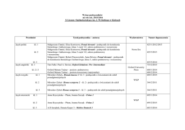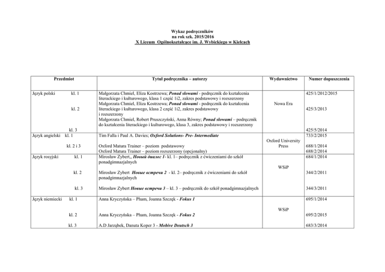 Wykaz podręczników na rok szk. 2015/2016 X Liceum Ogólnokształcące im. J. Wybickiego w Kielcach Przedmiot Język polski Tytuł podręcznika – autorzy kl. 1 kl. 2 Język angielski kl. 3 kl. 1 kl. 2 i 3 Język rosyjski kl. 1 Małgorzata Chmiel, Eliza Kostrzewa; Ponad słowami - podręcznik do kształcenia literackiego i kulturowego, klasa 1 część 1i2, zakres podstawowy i rozszerzony Małgorzata Chmiel, Eliza Kostrzewa; Ponad słowami - podręcznik do kształcenia literackiego i kulturowego, klasa 2 część 1i2, zakres podstawowy i rozszerzony Małgorzata Chmiel, Robert Pruszczyński, Anna Równy; Ponad słowami – podręcznik do kształcenia literackiego i kulturowego, klasa 3, zakres podstawowy i rozszerzony Wydawnictwo 425/1/2012/2015 Nowa Era 425/3/2013 425/5/2014 733/2/2015 Tim Falla i Paul A. Davies; Oxford Solutions- Pre- Intermediate Oxford Matura Trainer – poziom podstawowy Oxford Matura Trainer – poziom rozszerzony (opcjonalny) Mirosław Zybert,, Новый диалог 1- kl. 1– podręcznik z ćwiczeniami do szkół ponadgimnazjalnych Numer dopuszczenia Oxford University Press 688/1/2014 688/2/2014 684/1/2014 WSiP Język niemiecki kl. 2 Mirosław Zybert Новые встречи 2 - kl. 2– podręcznik z ćwiczeniami do szkół ponadgimnazjalnych 344/2/2011 kl. 3 Mirosław Zybert Новые встречи 3 – kl. 3 – podręcznik do szkół ponadgimnazjalnych 344/3/2011 kl. 1 Anna Kryczyńska – Pham, Joanna Szczęk - Fokus 1 695/1/2014 kl. 2 Anna Kryczyńska – Pham, Joanna Szczęk - Fokus 2 695/2/2015 kl. 3 A.D Jarząbek, Danuta Koper 3 - Mobive Deutsch 3 683/3/2014 WSiP Historia Rafał Dolecki, Krzysztof Gutowski, Jędrzej Smoleński; Historia. Po prostu podręcznik do historii dla szkół ponadgimnazjalnych. Zakres podstawowy kl. 1 kl. 2 (dotyczy klasy o profilu humanistycznym) kl. 3 Roman Czaja, Małgorzata Strzelecka, Jan Wroniszewski Historia 1 Starożytność zakres rozszerzony cz. 1 Roman Czaja, Małgorzata Strzelecka, Jan Wroniszewski Historia 1 Średniowiecze zakres rozszerzony cz. 2 Ustrzycki J., Ustrzycki M. Ciekawi świata 2 Historia i społeczeństwo kl. 2 (dotyczy klas o profilu sportowym) 558/2012 WSiP OPERON 478/1/2012 OPERON 478/2/2012 OPERON Marcin Markowicz, Olga Pytlińska, Agata Wyroda - Ojczysty Panteon i Ojczyste spory - podręcznik do historii i społeczeństwa dla szkół ponadgimnazjalnych Europa i świat – M. Markowicz, O. Pytlińska 644/1/2013 WSiP Wojna i wojskowość – M. Markowicz, O. Pytlińska WOS Rządzący i rządzeni – M. Markowicz, O. Pytlińska Marek Grondas, Janusz Żmijski ; WOS. Po prostu; podręcznik do wiedzy o społeczeństwie dla szkół ponadgimnazjalnych. Zakres podstawowy kl. 3 kl. 1 WOS (klasa prawo i bezp. wewn.) Wiedza o społeczeństwie – J. Maleska, Z. Smutek kl. 2 Wiedza o kulturze Spotkania z kulturą - Monika Bokiniec, Barbara Forysiewicz, Jacek Michałowski, Natalia Mrozkowiak - Nastrożna, Grzegorz Nazaruk, Magdalena Sacha, Grażyna kl. 1 Świętochowska Matematyka kl. 1 M. Kurczab, E. Kurczab i E. Świda; Matematyka-podręcznik do liceów i techników. Klasa 1. Zakres podstawowy M. Kurczab, E. Kurczab i E. Świda; Matematyka - zbiór zadań do liceów i techników. Klasa 1. Zakres podstawowy kl. 2 M. Kurczab, E. Kurczab i E. Świda; Matematyka-podręcznik do liceów i techników. Klasa 2. Zakres podstawowy M. Kurczab, E. Kurczab i E. Świda; Matematyka - zbiór zadań do liceów i techników. Klasa 2. Zakres podstawowy kl. 3 M. Kurczab, E. Kurczab i E. Świda; Matematyka-podręcznik do liceów i techników. Klasa 3. Zakres podstawowy M. Kurczab, E. Kurczab i E. Świda; Matematyka - zbiór zadań do liceów i techników. Klasa 3. Zakres podstawowy 531/2012 WSiP OPERON 488/1/2012 Nowa Era 449/2012 412/1/2012 Oficyna Edukacyjna Krzysztof Pazdro 412/2/2012 412/3/2012 Fizyka kl. 1 Biologia kl. 1 Marcin Braun, Weronika Śliwa; Odkryć fizykę; podręcznik z płytą kl. 1. Zakres podstawowy 447/2012/2015 Nowa Era 450/2012/2015 Emilia Bonar, Weronika Krzeszowiec- Jeleń, Stanisław Czachorowski; Biologia na czasie - podręcznik dla szkół ponadgimnazjalnych. Zakres podstawowy Nowa Era kl.2 (profil sportowy ) Marek Guzik, Ewa Jastrzębska, Ryszard Kozik, Renata Matuszewska, Ewa PyłkaGutowska, Władysław Zamachowski - Biologia na czasie 1 i 2- podręcznik dla szkół ponadgimnazjalnych. Zakres rozszerzony. kl. 3(profil sportowy ) Maria Marko-Wosłowska, Władysław Zamachowski, Franciszek Dubert Biologia na czasie 3 – podręcznik do liceum ogólnokształcącego i technikum. Zakres rozszerzony. Przyroda kl. 2 (dotyczy klas o profilu humanistycznym oraz prawo i bezp. wew. ) Grzegorz F. Wojewoda - Przyroda część fizyka. Ciekawi świata - podręcznik dla liceum ogólnokształcącego i technikum Chemia Romuald Hassa, Aleksandra Mrzigod, Janusz Mrzigod; To jest chemia; podręcznik dla szkół Ponadgimnazjalnych Zakres podstawowy kl. 1 kl. 2 (profil sportowy ) Maria Litwin, Szarota Styka-Wlazło, Joanna Szymońska To jest chemia 1 Chemia ogólna i nieorganiczna Podręcznik dla liceum ogólnokształcącego i technikum Zakres rozszerzony cz. I 564/1/2012/2015 cz. II 564/2/2013 cz. III 564/3/2014 637/1/2013 Operon 438/2012/2015 Nowa Era 528/1/2012/2015 528/2/2013 kl. 3 (profil sportowy ) Maria Litwin, Szarota Styka-Wlazło, Joanna Szymońska To jest chemia 2 Podręcznik dla liceum ogólnokształcącego i technikum. Zakres rozszerzony Geografia kl. 1 Radosław Uliszak, Krzystof Wiedermann; Oblicza geografii 1; podręcznik dla szkół Ponadgimnazjalnych Zakres podstawowy Informatyka kl. 1 Zdzisław Nowakowski ; Informatyka. Po prostu; podręcznik dla kl. 1 szkół ponadgimnazjalnych z dostępem na zasobów platformy edukacyjnej. Zakres podstawowy Nowa Era 433/2012 544/2012 WSiP Edukacja dla bezpieczeństwa kl. 1 Podstawy przedsiębiorczości Religia Jarosław Słoma; Żyję i działam bezpiecznie. Edukacja dla bezpieczeństwa Zbigniew Makieła, Tomasz Rachwał; Krok w przedsiębiorczość; kl. 1 podrę