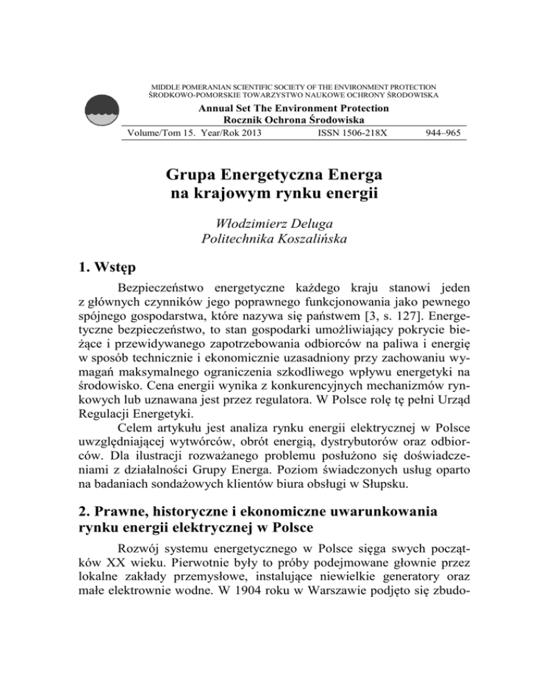 MIDDLE POMERANIAN SCIENTIFIC SOCIETY OF THE ENVIRONMENT PROTECTION ŚRODKOWO-POMORSKIE TOWARZYSTWO NAUKOWE OCHRONY ŚRODOWISKA Annual Set The Environment Protection Rocznik Ochrona Środowiska Volume/Tom 15. Year/Rok 2013 ISSN 1506-218X 944–965 Grupa Energetyczna Energa na krajowym rynku energii Włodzimierz Deluga Politechnika Koszalińska 1. Wstęp Bezpieczeństwo energetyczne każdego kraju stanowi jeden z głównych czynników jego poprawnego funkcjonowania jako pewnego spójnego gospodarstwa, które nazywa się państwem [3, s. 127]. Energetyczne bezpieczeństwo, to stan gospodarki umożliwiający pokrycie bieżące i przewidywanego zapotrzebowania odbiorców na paliwa i energię w sposób technicznie i ekonomicznie uzasadniony przy zachowaniu wymagań maksymalnego ograniczenia szkodliwego wpływu energetyki na środowisko. Cena energii wynika z konkurencyjnych mechanizmów rynkowych lub uznawana jest przez regulatora. W Polsce rolę tę pełni Urząd Regulacji Energetyki. Celem artykułu jest analiza rynku energii elektrycznej w Polsce uwzględniającej wytwórców, obrót energią, dystrybutorów oraz odbiorców. Dla ilustracji rozważanego problemu posłużono się doświadczeniami z działalności Grupy Energa. Poziom świadczonych usług oparto na badaniach sondażowych klientów biura obsługi w Słupsku. 2. Prawne, historyczne i ekonomiczne uwarunkowania rynku energii elektrycznej w Polsce Rozwój systemu energetycznego w Polsce sięga swych początków XX wieku. Pierwotnie były to próby podejmowane głownie przez lokalne zakłady przemysłowe, instalujące niewielkie generatory oraz małe elektrownie wodne. W 1904 roku w Warszawie podjęto się zbudo- Grupa Energetyczna Energa na krajowym rynku energii 945 wania elektrowni miejskiej, która dostarczała energię elektryczną mieszkańcom, a w późniejszym czasie została wykorzystana dla potrzeb przemysłu i transportu miejskiego. Wydarzenie to zapoczątkowało masowe powstawanie elektrowni w całym kraju. Po I Wojnie Światowej w Polsce działało około 280 elektrowni miejskich i przemysłowych o łącznej mocy 210 MW i rocznej produkcji około 500 GWh, a w 1938 roku istniało już 3198 obiektów o łącznej mocy 1668 MW i łącznej produkcji 3974 GWh [13]. Nie stanowiły one jednak jednolitego systemu wytwarzania, dystrybucji i sprzedaży energii. Zadania te realizowały liczne przedsiębiorstwa lokalne. Ogólnokrajowy zasięg systemy elektroenergetyczne osiągnęły dopiero po II Wojnie Światowej, kiedy to powstały nowoczesne elektrownie o dużych mocach połączone w scentralizowane systemy, a także wdrożono program powszechnej elektryfikacji kraju. Odpowiedzialność za rynek energii elektrycznej przejęło państwo. Ważne dla świata, w tym również dla Polski zmiany wprowadziła Wielka Brytania, która w 1989 roku podpisała Electricity Act wprowadzający prywatyzację energii oraz wyodrębnienie procesów jej wytwarzania, przesyłu oraz dystrybucji [14, s. 25]. Następnie transformacje te objęły kraje Europy Środkowej i Wschodniej. Energia elektryczna stała się towarem a jej odbiorcy klientami. W Polsce proces deregulacji sektora energetycznego rozpoczął się z przeobrażeniami ustrojowymi (począwszy od 1989 roku). W latach 90tych XX w. powołano spółkę akcyjną Polskie Sieci Elektroenergetyczne (PSE SA), która stała się właścicielem sieci przesyłowych o napięciu od 220 do 750 KV oraz dysponowała mocą elektrowni systemowych [14, s. 26]. Powołano też 15 spółek dystrybucyjnych w miejsce istniejących wówczas 33 zakładów energetycznych [1, s. 52]. Przeprowadzono proces restrukturyzacji (wyodrębniono przedsiębiorstwa, które zajmowały się działalnością pośrednio związaną z funkcjonowaniem zakładów energetycznych, np. firmy transportowe, remontowe, itp.), a także komercjalizacji przedsiębiorstw (wszystkie podmioty za wyjątkiem PSE SA, związane z energetyką, przekształcono w spółki akcyjne). 10 kwietnia 1997 roku przyjęto ustawę o Prawie Energetycznym (Dz.U. 1997 nr 54 poz. 348) [1, s. 54]. Do najistotniejszych rozwiązań wprowadzonych w tejże ustawie wymienić należy: 946 Włodzimierz Deluga powołanie oraz określenie zakresu działania Urzędu Regulacji Energetyki (URE) – nadrzędnego organu administracyjnego odpowiedzialnego za nadzór w energetyce, koncesjonowanie przez URE działalności w zakresie wytwarzania, przesyłu oraz dystrybucji energii elektrycznej, wymóg zatwierdzania przez URE taryf na energię elektryczną, przy możliwości zwolnienia przedsiębiorstwa energetycznego z konieczności zatwierdzania taryf, w przypadku stwierdzenia, że przedsiębiorstwo działa na rynku konkurencyjnym, obowiązek opracowywania i uzgadniania z URE, przez przedsiębiorstwa energetyczne sieciowe: przesyłowe i dystrybucyjne, planów rozwoju w zakresie zaspokojenia obecnego i przyszłego zapotrzebowania na energię elektryczną, możliwość korzystania przez grupy odbiorców z usług przesyłowych, w zależności od ich rocznych zakupów energii elektrycznej [1, s. 54–55]. Po przystąpieniu Polski do Unii Europejskiej koniecznym stało się dostosowanie polskiego prawa energetycznego do zasad obowiązujących w całej Wspólnocie określonych głównie w Dyrektywie UE o zasadach wspólnego rynku energii elektrycznej. Wraz z wstąpieniem Polski do Unii Europejskiej, polskie prawodawstwo dotyczące rynku energii zostało dostosowane do prawodawstwa europejskiego. Obecny rynek energii elektrycznej w kraju podporządkowany jest przepisom Dyrektyw UE. Dotyczą one głównie [1]: tworzenia konkurencyjnego rynku energii, który jest najlepszym sposobem na obniżenie cen energii oraz podniesienia jakości obsługi klienta, wprowadzenia prawa do swobodnego wyboru sprzedawcy energii elektrycznej, procesu nabywania towaru w postaci energii elektrycznej wraz z usługą przesyłu tej energii od wytwórcy do odbiorcy. Grupa Energetyczna Energa na krajowym rynku energii 94