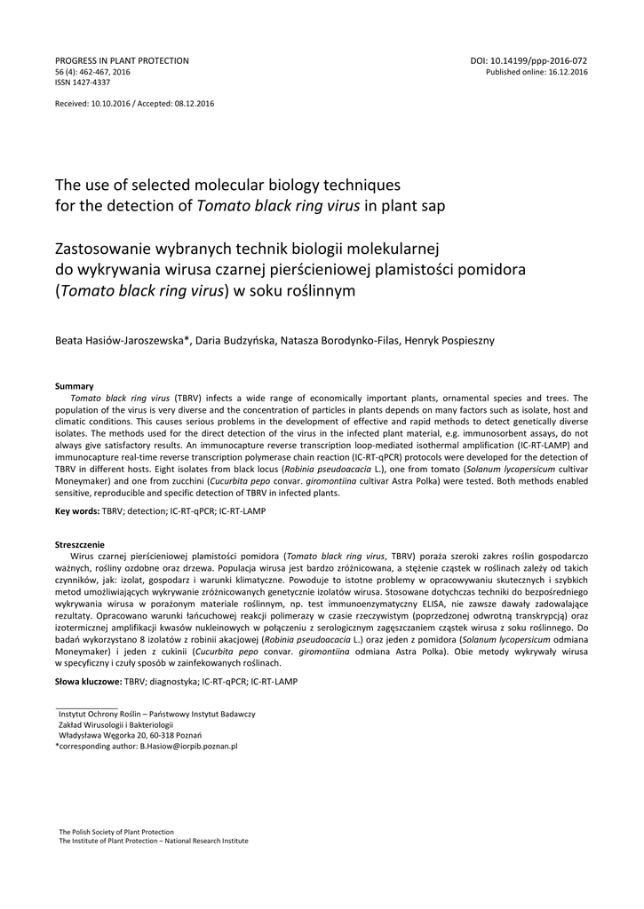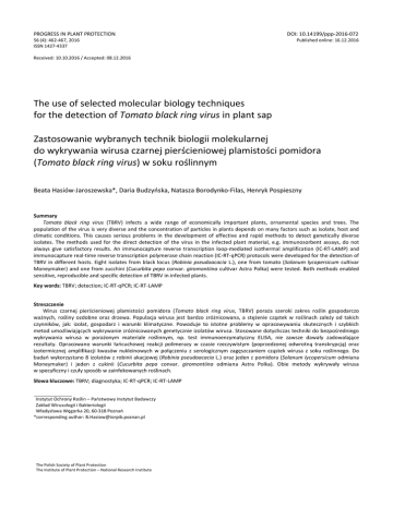 PROGRESS IN PLANT PROTECTION 56 (4): 462-467, 2016 ISSN 1427-4337 DOI: 10.14199/ppp-2016-072 Published online: 16.12.2016 Received: 10.10.2016 / Accepted: 08.12.2016 The use of selected molecular biology techniques for the detection of Tomato black ring virus in plant sap Zastosowanie wybranych technik biologii molekularnej do wykrywania wirusa czarnej pierścieniowej plamistości pomidora (Tomato black ring virus) w soku roślinnym Beata Hasiów-Jaroszewska*, Daria Budzyńska, Natasza Borodynko-Filas, Henryk Pospieszny Summary Tomato black ring virus (TBRV) infects a wide range of economically important plants, ornamental species and trees. The population of the virus is very diverse and the concentration of particles in plants depends on many factors such as isolate, host and climatic conditions. This causes serious problems in the development of effective and rapid methods to detect genetically diverse isolates. The methods used for the direct detection of the virus in the infected plant material, e.g. immunosorbent assays, do not always give satisfactory results. An immunocapture reverse transcription loop-mediated isothermal amplification (IC-RT-LAMP) and immunocapture real-time reverse transcription polymerase chain reaction (IC-RT-qPCR) protocols were developed for the detection of TBRV in different hosts. Eight isolates from black locus (Robinia pseudoacacia L.), one from tomato (Solanum lycopersicum cultivar Moneymaker) and one from zucchini (Cucurbita pepo convar. giromontiina cultivar Astra Polka) were tested. Both methods enabled sensitive, reproducible and specific detection of TBRV in infected plants. Key words: TBRV; detection; IC-RT-qPCR; IC-RT-LAMP Streszczenie Wirus czarnej pierścieniowej plamistości pomidora (Tomato black ring virus, TBRV) poraża szeroki zakres roślin gospodarczo ważnych, rośliny ozdobne oraz drzewa. Populacja wirusa jest bardzo zróżnicowana, a stężenie cząstek w roślinach zależy od takich czynników, jak: izolat, gospodarz i warunki klimatyczne. Powoduje to istotne problemy w opracowywaniu skutecznych i szybkich metod umożliwiających wykrywanie zróżnicowanych genetycznie izolatów wirusa. Stosowane dotychczas techniki do bezpośredniego wykrywania wirusa w porażonym materiale roślinnym, np. test immunoenzymatyczny ELISA, nie zawsze dawały zadowalające rezultaty. Opracowano warunki łańcuchowej reakcji polimerazy w czasie rzeczywistym (poprzedzonej odwrotną transkrypcją) oraz izotermicznej amplifikacji kwasów nukleinowych w połączeniu z serologicznym zagęszczaniem cząstek wirusa z soku roślinnego. Do badań wykorzystano 8 izolatów z robinii akacjowej (Robinia pseudoacacia L.) oraz jeden z pomidora (Solanum lycopersicum odmiana Moneymaker) i jeden z cukinii (Cucurbita pepo convar. giromontiina odmiana Astra Polka). Obie metody wykrywały wirusa w specyficzny i czuły sposób w zainfekowanych roślinach. Słowa kluczowe: TBRV; diagnostyka; IC-RT-qPCR; IC-RT-LAMP Instytut Ochrony Roślin – Państwowy Instytut Badawczy Zakład Wirusologii i Bakteriologii Władysława Węgorka 20, 60-318 Poznań *corresponding author: [email protected] The Polish Society of Plant Protection The Institute of Plant Protection – National Research Institute Progress in Plant Protection 56 (4) 2016 Wstęp / Introduction Wirus czarnej pierścieniowej plamistości pomidora (Tomato black ring virus, TBRV) należy do podgrupy B rodzaju Nepovirus, rodziny Secoviridae (King i wsp. 2012; Hasiów-Jaroszewska i wsp. 2015a). TBRV po raz pierwszy opisano w Anglii, gdzie jego obecność stwierdzono na pomidorze (Smith 1946). Obecnie wirus występuje w Europie (m.in. Finlandia, Niemcy, Norwegia, Włochy), Ameryce Północnej (Kanada, USA), Ameryce Południowej (Brazylia), Azji (Indie, Japonia, Turcja) i Afryce (Kenia) (Sastry 1966; Kaiser i wsp. 1978; Jończyk i wsp. 2004; Yücel i wsp. 2008; Šneideris i wsp. 2012; Rymelska i wsp. 2013). W Polsce TBRV po raz pierwszy wykryto w 1969 roku na pomidorze (Twardowicz-Jakusz 1969). Charakterystyczne dla wirusów z rodzaju Nepovirus jest przenoszenie przez nicienie z rodzaju Longidorus i Xiphinema (Harrison i wsp. 1961; Harrison 1964; Harrison i Murant 1977). Wirus może być również przenoszony przez nasiona (Lister i Murant 1967). TBRV poraża szeroki zakres roślin, w tym rośliny gospodarczo ważne, ozdobne oraz drzewa. Występowanie wirusa potwierdzono między innymi na pomidorze, cebuli, ogórku, cukinii, winorośli, truskawce i robinii akacjowej (Borodynko i wsp. 2011). Wirus na porażonych roślinach wywołuje takie objawy, jak chlorotyczne zmiany występujące lokalnie lub systemicznie, niekiedy w postaci charakterystycznych pierścieni, mozaiki, nekrozy, deformacje liści, zahamowanie wzrostu rośliny (Pospieszny i Borodynko 2005). Powszechnym dla nepowirusów zjawiskiem jest tzw. pozorne ozdrowienie – zanik objawów chorobowych w czasie (Giersch 1986). Materiał genetyczny wirusa stanowią dwie cząsteczki RNA o polaryzacji dodatniej (+ ssRNA): RNA 1 o długości około 7500 nukleotydów (nt) oraz RNA 2 o długości około 4500 nt (Jończyk i wsp. 2004; Digiaro i wsp. 2015). Każda z cząsteczek genomowego RNA upakowana jest w osobny kapsyd. W obrębie rodzaju Nepovirus ze względu na podobieństwo sekwencji, właściwości serologiczne i długość cząsteczki RNA 2, wyróżniono trzy podgrupy: A, B i C (King i wsp. 2012; Digiaro i wsp. 2015). Długość nici RNA 2 w poszczególnych podgrupach wynosi odpowiednio: 3700–4000 nt, 4400–4700 nt, 6400–7300 nt (Steinkellner i wsp. 1992). W oparciu o wcześniej wymienione kryteria TBRV zakwalifikowano do podgrupy B. Obie cząsteczki genomowego RNA zawierają na końcu 5’ białko VPg, a na końcach 3’ dołączony jest ogon poliadenylowy (Rymelska i wsp. 2013). RNA 1 zawiera geny istotne dla replikacji i „dojrzewania” wirusa, natomiast RNA 2 geny białka płaszcza (CP – coat protein) oraz białka transportowego (MP – movement protein). Zar