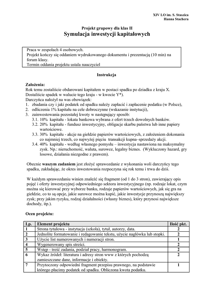 XIV LO im. S. Staszica Hanna Stachera Projekt grupowy dla klas II Symulacja inwestycji kapitałowych Praca w zespołach 4 osobowych. Projekt kończy się oddaniem wydrukowanego dokumentu i prezentacją (10 min) na forum klasy. Termin oddania projektu ustala nauczyciel Instrukcja Założenia: Rok temu zostaliście obdarowani kapitałem w postaci spadku po dziadku z kraju X. Dostaliście spadek w walucie tego kraju - w kwocie Y*). Darczyńca nałożył na was obowiązek: 1. zbadania czy i jaki podatek od spadku należy zapłacić i zapłacenie podatku (w Polsce), 2. odliczenia 1% kapitału na cele dobroczynne (wskazanie instytucji), 3. zainwestowania pozostałej kwoty w następujący sposób: 3.1. 10% kapitału - lokata bankowa wybrana z ofert trzech dowolnych banków. 3.2. 20% kapitału - fundusz inwestycyjny, obligacje skarbu państwa lub inne papiery wartościowe. 3.3. 30% kapitału - akcje na giełdzie papierów wartościowych, z założeniem dokonania co najmniej trzech, co najwyżej pięciu transakcji kupna–sprzedaży akcji. 3.4. 40% kapitału - według własnego pomysłu – inwestycja nastawiona na maksymalny zysk. Np.: nieruchomość, waluta, surowce, legalny biznes. (Wykluczony hazard, gry losowe, działania niezgodne z prawem). Obecnie waszym zadaniem jest złożyć sprawozdanie z wykonania woli darczyńcy tego spadku, zakładając, że okres inwestowania rozpoczyna się rok temu i trwa do dziś. W każdym sprawozdaniu winien znaleźć się fragment (od 1 do 3 stron), zawierający opis pojęć i oferty inwestycyjnej odpowiedniego sektora inwestycyjnego (np. rodzaje lokat, czym można się kierować przy wyborze banku, rodzaje papierów wartościowych, jak się gra na giełdzie, co to są opcje, jakie surowce można kupić, jakie inwestycje przynoszą największy zysk; przy jakim ryzyku, rodzaj działalności (własny biznes), który przynosi największe dochody, itp.). Ocen projektu: Lp. 1 2 3 4 5 6 7 Element projektu Strona tytułowa - instytucja (szkoła), tytuł, autorzy, data. Jednolite formatowanie i redagowanie tekstu, użycie nagłówka lub stopki. Użycie list numerowanych i numeracji stron. Wygenerowany spis streści. Wstęp - treść zadania, podział pracy, harmonogram. Wykaz źródeł: literatura i adresy stron www z których pochodzą zamieszczane dane, informacje i obiekty. Przytoczony odpowiedni fragment przepisu prawnego, na podstawie którego płacimy podatek od spadku. Obliczona kwota podatku. Ilość pkt. 2 2 1 2 2 2 1 H.Stachera XIV LO im. S. Staszica Instrukcja do projektu grupowego – inwestycje kapitału 8 9 Podział dokumentu na rozdziały Obliczona wartość kapitału po opłaceniu podatku, (ewentualnej) zamianie waluty i oddaniu 1% na cel dobroczynny (wskazanie jaki). Cztery kolejne rozdziały zawierające sprawozdania z inwestycji: opis pojęć oferty inwestycyjnej danego sektora, wybór inwestycji i uzasadnienie wyboru, bądź rodzaj biznesu i obliczenie nakładów i zysków, tabela z obliczeniami w kolejnych okresach inwestowania, zysk/strata zaprezentowana na wykresach, obliczenie stopy zwrotu, podsumowanie opłacalności inwestycji – wnioski. Podsumowanie wszystkich inwestycji: wykres z porównaniem sposobów inwestowania, wnioski dotyczące opłacalności poszczególnych inwestycji, podsumowanie projektu (doświadczenia, napotkane trudności). 10 11 12 13 14 15 16 17 18 1 1 20 x 4 5 2 5 5 2 2 2 2 1 Prezentacja projektu na forum klasy (10 min.) – oddzielna ocena. Uwaga do p. 3.1, 3.2 i 3.4 Jeżeli informacja na temat oferty z danego roku jest niedostępna (np. oprocentowanie lokat), można założyć że obowiązywała wtedy oferta z dziś. Ważne w pracy grupowej: 1. 2. 3. 4. 5. 6. 7. 8. 9. Wybór przewodniczącego zespołu. Odczytanie instrukcji do projektu. Omówienie poziomu trudności elementów projektu, propozycje podziału pracy. Wybranie osoby, która będzie opracowywała dokument wynikowy. Ustalenie terminów i autorów wykonania elementów projektu. Ustalenie sposobu kontaktów w zespole. Utworzenie przez przewodniczącego zespołu harmonogramu prac. Ustalenie sposobu wymiany informacji bieżących. Ustalenie standardów wykonawczych (np. utworzenie szablonu dokumentu, formatowanie, czarno–biały lub kolor, rozmiary wykresów). 10. Uzupełnianie harmonogramu prac w ustalonych terminach spotkań zespołu. 11. Wymiana na bieżąco uwag odnośnie postępu prac, elastyczne modyfikowanie ustaleń. 12. Miła atmosfera spotkań, życzliwość, chęć współpracy, umiejętność rozwiązywania problemów. Przykładowy harmonogram prac: Postępy prac Lp. Element projektu Kto Termin oddania Data Wykonanie (w %) Instrukcja do projektu grupowego – inwestycje kapitału Oceny na podstawie ilości punktów: Liczba punktów 0 - 50 51 - 55 56 – 60 61 – 65 66 – 70 71 – 75 76 – 82 83 – 89 90 – 96 97 – 100 Ocena ndst ndst+ dop dop + dst dst + db db + bdb bdb + H.Stachera XIV LO im. S. Staszica Instrukcja do projektu grupowego – inwestycje kapitału H.Stachera XIV LO im. S. Staszica Dane do projektu *) – X i Y zostaną przydzielone drogą losowania, przewodniczący zespołu losuje liczbę (kartkę z kapelusza) Wylosowany X Kraj numer 1 2 3 4 5 6 7 8 9 10 11 12 13 14 14 16 17 18 19 20 21 22 23 Y Kwota Australia Cypr Czechy Dania Estonia Węgry Hongkong Japonia Kanada Litwa Łotwa Malta Norwegia Rosja RPA SDR Słowacja Słowenia Szwajcaria Szwecja Ukraina USA W. Brytania 500 000 100 000 500 000 300 000 2 950 0000 4 000 000 800 000 30 000 000 200 000 7000 000 1 300 000 500 000 400 000 6 000 000 300 000 250 000 100 000 30 000 000 200 000 350 000 5 000 000 250 000 100 000 Instrukcja do projektu grupowego – inwestycje kapitału H.Stachera XIV LO im. S. Staszica