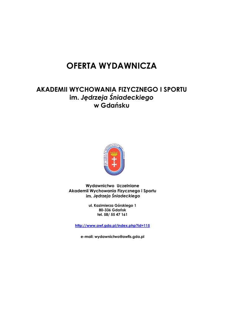 OFERTA WYDAWNICZA AKADEMII WYCHOWANIA FIZYCZNEGO I SPORTU im. Jędrzeja Śniadeckiego w Gdańsku Wydawnictwo Uczelniane Akademii Wychowania Fizycznego i Sportu im. Jędrzeja Śniadeckiego ul. Kazimierza Górskiego 1 80-336 Gdańsk tel. 58/ 55 47 161 http://www.awf.gda.pl/index.php?id=115 e-mail: [email protected] MONOGRAFIE (podano ceny brutto) Aktywność fizyczna i zdrowie w badaniach naukowych, red. W. Moska, Z. Ossowski, 2014, ss. 181, 10,50 zł. Wieloautorska monografia składa się z 16 rozdziałów, w tym z jednego w języku angielskim. Obszar tematyczny, którym zajmują się autorzy monografii to szeroko pojęta całożyciowa aktywność fizyczna (z naciskiem na takie jej formy jak nordic walking) oraz zdrowie w wymiarze społecznym. Adam M.: Wskaźniki przygotowania techniczno-taktycznego zawodników i zawodniczek judo jako kryterium kontroli poziomu wyszkolenia, 2013, ss. 229, 26,25 zł. Monografia stanowi próbę ujednolicenia wskaźników umożliwiających kompleksową ocenę PTT zawodników judo i kontrolę poziomu ich wyszkolenia na podstawie wieloletnich indywidualnych obserwacji. Materiał badawczy stanowiły obserwacje zawodów sportowych prowadzone przez Autora w okresie dwudziestu trzech lat – w tym czasie zarejestrowano ponad sześć tysięcy walk sportowych czternastu zawodniczek i osiemnastu zawodników posiadających klasy mistrzowskie i mistrzowskie międzynarodowe. Dodatkowy materiał stanowiła analiza tysiąca czterystu walk uczestników minionych igrzysk olimpijskich (19962004). Klasyfikacja technik judo została dokonana na podstawie opracowań Kodokan Judo. Nowa Bielec G.: Aktywność fizyczna w środowisku wodnym wobec wybranych celów i funkcji cena! wychowania fizycznych – na przykładzie gimnazjów publicznych, 2012, ss. 144, 10,50 zł. Monografia ukazuje problematykę wychowania fizycznego w gimnazjum poprzez pryzmat lekcji odbywających się w środowisku wodnym na podstawie wyników badań dotyczących dwuletniego eksperymentu pedagogicznego przeprowadzonego w wybranych gimnazjach publicznych Gdańska. Drabik J.: Pedagogiczna kontrola pozytywnych mierników zdrowia fizycznego, 2006, ss. 329, 9,45 zł. Duda B.: Aktywność, sprawność i wydolność fizyczna a komponenty morfologiczne u osób w wieku średnim, 2009, ss. 162, 36,75 zł. Erdmann W. S., Zieniawa R.: Biomechanika judo, wyd. II (oprawa miękka), 2012, ss. 300, 36,75 zł. W monografii przedstawiono zagadnienia mechaniki podstawowej, w tym formy bezruchu i ruchu, inercję, działające siły. Opisano podstawy biomechaniki, w tym problemy morfologiczne, mechanikę układu ruchu i zasilania, systematykę ruchu i jego sterowanie, zagadnienia techniczne i środowisko. Zaprezentowano również wybrane elementy biomechaniki sportu, zwłaszcza ćwiczenia rozruchowe, siłę mięśniową sportowca. Główną treść książki stanowią: zacytowane teksty judoków – w tym założyciela judo Jigoro Kano – na temat biomechaniki judo, problematyka morfologii judoków, treningu i diagnostyki siły mięśniowej, reakcji na bodźce, oceny i selekcji zawodników, a szczególnie opisu mechaniki walki – rzutów i chwytów podczas przytrzymań, zakładania dźwigni, duszeń. Przedstawiono także biomechanikę odnowy biologicznej, a na koniec zagadnienia naukowe i edukacyjne. Nowa cena! Jastrzębski Z., Barnat W.: Wydolność i sprawność 13–15-letnich piłkarzy nożnych w trzyletnim cyklu treningowym, 2015, ss. 180, 15,75 zł. Celem niniejszej pracy było określenie wielkości i kierunku zmian wydolności i sprawności fizycznej 13-15-letnich młodych piłkarzy nożnych w trzyletnim cyklu treningowym oraz zachodzących pomiędzy nimi zależności. W pracy przedstawiono zarówno rejestrację obciążeń treningowych, jak i ich rezultaty. Porównanie do osób nietrenujących pozwoliło dostrzec efekt wpływu obciążeń na poziom wydolności i sprawności fizycznej młodych piłkarzy nożnych. Jedel J., Moska W., Zawadzki J., Kopczyk R., Kędzior M., Lubomańska-Palarczyk M., Schwarz M.: Rynek sportu. Zarys problematyki, 2015, ss. 150, 16,80 zł. Monografia prezentuje nowatorskie holistyczne podejście do obszaru sportu funkcjonującego w polskiej gospodarce. Na szczególną uwagę zasługują treści dotyczące nowej filozofii zarządzania przedsiębiorstwem sportowym oraz procesu budowania bezpieczeństwa imprez masowych, tak w świetle prawa polskiego, jak i UE. Poruszana jest także tematyka zasady fair play, opisano też proces kształtowania wizerunku przedsiębiorstwa w sytuacjach kryzysowych. Publikację zamykają treści dotyczące zawodowego produktu Kierunki optymalizacji treningu I systemu szkolenia w sporcie wyczynowym – retrospekcja i perspektywy, red. W. Moska, J. Jaszczur-Nowicki, 2012, ss.158, 16,80 zł. Laskowski R.: Skuteczność techniczna i taktyczna zawodniczek reprezentacji Polski w judo w wieloletnim procesie treningowym, 2006, ss. 97, 10,50 zł. Lipińska P.: Strategia tempa w dyscyplinach sportowych o cyklicznym charakterze ruchów ze szczególnym uwzględnieniem pływania, 2015, ss. 114, 25,20 zł. Monografia dotyczy problematyki strategii rozgrywania zawodów ze szczególnym uwzględnieniem rozkładu tempa w dyscyplinach sportowych o cyklicznym charakterze ruchów, z akcentem na pływanie. Celem badań było określenie strategii tempa (pacing strategies) u pływaków poziomu mistrzowskiego oraz związku obranych strategii z osiąganym wynikiem. Autorka dokonała analizy 504 wyścigów pływackich kobiet, zaś mężczyzn – 396 wyścigów, przeprowadzonych podczas zawodów o różnej randze (od uniwersjad do IO) w okresie od października 2013 do kwietnia 2014. Mishchenko V., Przybylski W., Tomiak T, Zasada M.: Sports specific training effects and their physiological monitoring in high performance athletes, 2013, ss. 219, 27,90 zł. Monografia w języku angielskim, składa się z siedmiu rozdziałów, opatrzona jest kilkudziesięcioma rycinami i tabelami. Autorzy monog