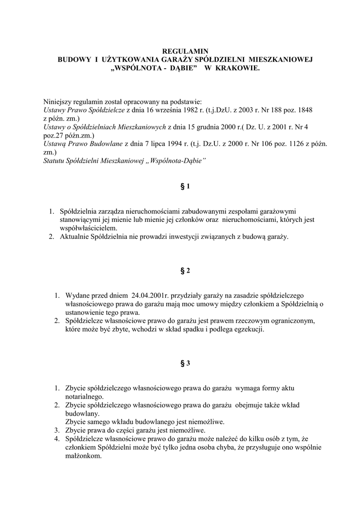 REGULAMIN BUDOWY I UŻYTKOWANIA GARAŻY SPÓŁDZIELNI