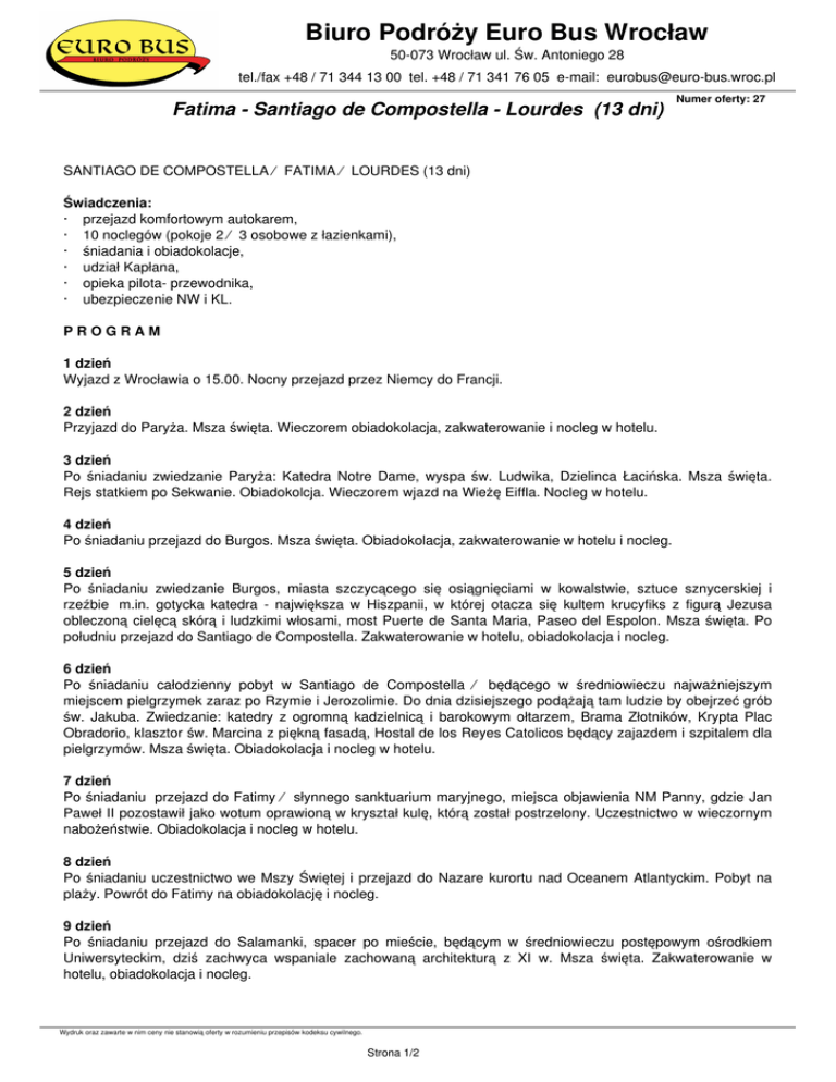 Biuro Podróży Euro Bus Wrocław 50-073 Wrocław ul. Św. Antoniego 28 tel./fax +48 / 71 344 13 00 tel. +48 / 71 341 76 05 e-mail: [email protected] Fatima - Santiago de Compostella - Lourdes (13 dni) Numer oferty: 27 SANTIAGO DE COMPOSTELLA – FATIMA – LOURDES (13 dni) Świadczenia: · przejazd komfortowym autokarem, · 10 noclegów (pokoje 2 – 3 osobowe z łazienkami), · śniadania i obiadokolacje, · udział Kapłana, · opieka pilota- przewodnika, · ubezpieczenie NW i KL. PROGRAM 1 dzień Wyjazd z Wrocławia o 15.00. Nocny przejazd przez Niemcy do Francji. 2 dzień Przyjazd do Paryża. Msza święta. Wieczorem obiadokolacja, zakwaterowanie i nocleg w hotelu. 3 dzień Po śniadaniu zwiedzanie Paryża: Katedra Notre Dame, wyspa św. Ludwika, Dzielinca Łacińska. Msza święta. Rejs statkiem po Sekwanie. Obiadokolcja. Wieczorem wjazd na Wieżę Eiffla. Nocleg w hotelu. 4 dzień Po śniadaniu przejazd do Burgos. Msza święta. Obiadokolacja, zakwaterowanie w hotelu i nocleg. 5 dzień Po śniadaniu zwiedzanie Burgos, miasta szczycącego się osiągnięciami w kowalstwie, sztuce sznycerskiej i rzeźbie m.in. gotycka katedra - największa w Hiszpanii, w której otacza się kultem krucyfiks z figurą Jezusa obleczoną cielęcą skórą i ludzkimi włosami, most Puerte de Santa Maria, Paseo del Espolon. Msza święta. Po południu przejazd do Santiago de Compostella. Zakwaterowanie w hotelu, obiadokolacja i nocleg. 6 dzień Po śniadaniu całodzienny pobyt w Santiago de Compostella – będącego w średniowieczu najważniejszym miejscem pielgrzymek zaraz po Rzymie i Jerozolimie. Do dnia dzisiejszego podążają tam ludzie by obejrzeć grób św. Jakuba. Zwiedzanie: katedry z ogromną kadzielnicą i barokowym ołtarzem, Brama Złotników, Krypta Plac Obradorio, klasztor św. Marcina z piękną fasadą, Hostal de los Reyes Catolicos będący zajazdem i szpitalem dla pielgrzymów. Msza święta. Obiadokolacja i nocleg w hotelu. 7 dzień Po śniadaniu przejazd do Fatimy – słynnego sanktuarium maryjnego, miejsca objawienia NM Panny, gdzie Jan Paweł II pozostawił jako wotum oprawioną w kryształ kulę, którą został postrzelony. Uczestnictwo w wieczornym nabożeństwie. Obiadokolacja i nocleg w hotelu. 8 dzień Po śniadaniu uczestnictwo we Mszy Świętej i przejazd do Nazare kurortu nad Oceanem Atlantyckim. Pobyt na plaży. Powrót do Fatimy na obiadokolację i nocleg. 9 dzień Po śniadaniu przejazd do Salamanki, spacer po mieście, będącym w średniowieczu postępowym ośrodkiem Uniwersyteckim, dziś zachwyca wspaniale zachowaną architekturą z XI w. Msza święta. Zakwaterowanie w hotelu, obiadokolacja i nocleg. Wydruk oraz zawarte w nim ceny nie stanowią oferty w rozumieniu przepisów kodeksu cywilnego. Strona 1/2 Biuro Podróży Euro Bus Wrocław 50-073 Wrocław ul. Św. Antoniego 28 tel./fax +48 / 71 344 13 00 tel. +48 / 71 341 76 05 e-mail: [email protected] 10 dzień Po śniadaniu przejazd do Lourdes. Uczestniczenie w uroczystościach kościelnych: Droga Krzyżowa, Nabożeństwo w języku polskim w jednej z kaplic. Obiadokolacja i nocleg w hotelu. 11 dzień Po śniadaniu przejazd do Annecy – miasteczka położonego nad jeziorem, zwanym z uwagi na liczne kanały i mosty „Alpejską Wenecją”. Zwiedzanie zamku z XII wieku i katedry. Msza święta. Obiadokolacja i nocleg. 12 dzień Po śniadaniu wyjazd do kraju. 13 dzień Powrót do Wrocławia w godzinach rannych. Uwaga: Na wstępy potrzeba ok. 100 EURO. Cena 3200 zł Wydruk oraz zawarte w nim ceny nie stanowią oferty w rozumieniu przepisów kodeksu cywilnego. Strona 2/2