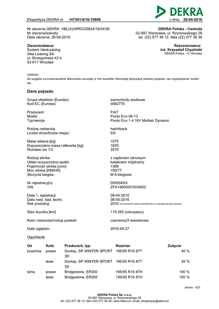 Ekspertyza DEKRA nr 147541/4/16-10606 z dnia Nr zlecenia DEKRA: VBL(A)/WRO/23824/16/04/26 Nr zlecenia/szkody: Data zlecenia: 26-04-2016 28-04-2016 DEKRA Polska - Centrala 02-697 Warszawa, ul. Rzymowskiego 28 tel. (22) 577 36 12, faks (22) 577 36 36 Zleceniodawca: System IdeaLeasing Idea Leasing SA ul. Strzegomska 42 b 53-611 Wrocław Rzeczoznawca: inż. Krzysztof Chyziński DEKRA Polska - O. Wrocław UWAGA: Ze względu na przeznaczenie dokumentu usunięto w nim wszelkie informacje dotyczące wartości pojazdu, cen wyposażenia, korekt, etc. Dane pojazdu Grupa obiektów (Eurotax) Kod EC (Eurotax) samochody osobowe 0082770 Producent Model Typ/wersja FIAT Punto Evo 09-13 Punto Evo 1.4 16V Multiair Dynamic Rodzaj nadwozia Liczba drzwi/liczba miejsc hatchback 5/5 Masa własna [kg] Dopuszczalna masa całkowita [kg] Rozstaw osi 1/2 1075 1635 2510 Rodzaj silnika Układ oczyszczana spalin Pojemność silnika [ccm] Moc silnika [KM/kW] Skrzynia biegów z zapłonem iskrowym katalizator trójdrożny 1368 105/77 M 6-biegowa Nr rejestracyjny VIN DW504SX ZFA19900001634832 Data 1. rejestracji Data nast. bad. techn. Rok produkcji 08-04-2010 08-05-2016 2010 (rok produkcji został zweryfikowany z zewnętrzną bazą danych) Stan licznika [km] 119 293 (odczytany) Kolor nadwozia/rodzaj powłoki czerwony/2-warstwowa Data oględzin 2016-04-27 Ogumienie Oś przednia Koło prawe lewe tylna prawe lewe Producent, typ Dunlop, SP WINTER SPORT 3D Dunlop, SP WINTER SPORT 3D Bridgestone, ER300 Bridgestone, ER300 Rozmiar 195/55 R16 87T Zużycie 40 % 195/55 R16 87T 40 % 195/55 R16 87H 195/55 R16 87H 100 % 100 % strona 1/23 DEKRA Polska Sp. z o.o. 02-697 Warszawa, ul. Rzymowskiego 28 tel. (22) 577 36 12, faks (22) 577 36 36, www.dekra.pl, email: [email protected] Ekspertyza DEKRA nr 147541/4/16-10606 z dnia 28-04-2016 strona 2/23 DEKRA Polska Sp. z o.o. 02-697 Warszawa, ul. Rzymowskiego 28 tel. (22) 577 36 12, faks (22) 577 36 36, www.dekra.pl, email: [email protected] Ekspertyza DEKRA nr 147541/4/16-10606 z dnia 28-04-2016 Wyposażenie standardowe wg Eurotax 1. 2. 3. 4. 5. 6. 7. 8. 9. 10. 11. 12. ABS Airbag kierowcy i pasażera Czujnik temperatury zewnętrznej Elektryczne podnoszenie szyb, przód Fotel kierowcy z mech. regulacją wysokości Kierownica i gałka zmiany biegów pokryte skórą Klimatyzacja manualna Kolumna kierownicy z regulacją w dwóch płaszczyznach Komputer pokładowy Koło zapasowe, pełnowymiarowe 185/65 R15 Lusterka boczne regulowane elektrycznie i ogrzewane Lusterka boczne w kolorze nadwozia 13. 14. 15. 16. 17. 18. Obrotomierz Ogrzewanie tylnej szyby Poduszka powietrzna chroniąca kolana kierowcy Radio CD/MP3 ze sterowaniem z kierownicy System Stop & Start Tapicerka materiałowa Yahoo/Google 19. Tylne oparcie składane, dzielone 60/40 20. Wspomaganie kierownicy Dual Drive 21. Wycieraczka szyby tylnej 22. Zamek centralny sterowany pilotem 23. Światła przeciwmgielne z funkcją doświetlania zakrętów Wyposażenie dealerskie 1. Blue&Me - system głośnomówiący Bluetooth + USB ............................................................................. 2. Felgi aluminiowe 16 (kod 4AY) z ogumieniem 195/55 ........................................................................... 3. Korek wlewu paliwa zamykany na kluczyk ............................................................................................. - Wartość bazowa pojazdu Wartość bazowa pojazdu wg Eurotax (netto/zakup)¹ .............................................................................. - Korekty Pierwsza rejestracja Przebieg Wyposażenie Ogumienie Inne Stwierdzone braki i uszkodzenia ................................................................................................................ - Powyższą wartość określono w oparciu o notowania cen samochodów używanych na rynku polskim Eurotax (baza danych nr 04-2016 POL) z uwzględnieniem parametrów technicznych i rynkowych mających wpływ na wartość pojazdu. Dla pojazdów zarejestrowanych w Polsce powyższa wartość została określona na dzień sporządzenia wyceny. Jeżeli pojazd nie jest zarejestrowany w kraju - podana wartość jest wartością hipotetyczną przy założeniu uiszczenia wszelkich opłat i podatków należnych przy wprowadzeniu pojazdu na polski obszar celny. strona 3/23 DEKRA Polska Sp. z o.o. 02-697 Warszawa, ul. Rzymowskiego 28 tel. (22) 577 36 12, faks (22) 577 36 36, www.dekra.pl, email: [email protected] Ekspertyza DEKRA nr 147541/4/16-10606 z dnia 28-04-2016 Wydruk podstawowy bez informacji o wartości pojazdu - ze względu na przeznaczenie dokumentu usunięto w nim wszelkie informacje dotyczące wartości pojazdu, cen wyposażenia, korekt, etc. Data: 28-04-2016 Rzeczoznawca DEKRA: inż. Krzysztof Chyziński Dokument wystawiony elektronicznie ważny bez podpisu. strona 4/23 DEKRA Polska Sp. z o.o. 02-697 Warszawa, ul. Rzymowskiego 28 tel. (22) 577 36 12, faks (22) 577 36 36, www.dekra.pl, email: [email protected] Ekspertyza DEKRA nr 147541/4/16-10606 z dnia 28-04-2016 Pomiar grubości powłoki lakierowej poj. Nr punktu kontroli 1 2 3 4 5 6 7 8 9 10 11 12 13 14 15 16 17 Kontrolowany element Pokrywa przednia Błotnik przedni lewy Słupek przedni lewy Drzwi przednie lewe Dach Słupek środkowy lewy Próg lewy Drzwi tylne lewe Błotnik tylny lewy Pokrywa/klapa Błotnik tylny prawy Drzwi tylne prawe Słupek środkowy prawy Próg prawy Drzwi przednie prawe Słupek przedni prawy Błotnik przedni prawy Zmierzony przedział grubości powłoki lakierowej [µm] 110 - 135 110 - 135 110 - 135 110 - 135 110 - 135 70 - 90 85 - 100 110 - 135 110 - 135 110 - 135 110 - 135 110 - 135 75 - 95 85 - 100 110 - 135 110 - 135 110 - 135 strona 5/23 DEKRA Polska Sp. z o.o. 02-697 Warszawa, ul. Rzymowskiego 28 tel. (22) 577 36 12, faks (22) 577 36 36, www.dekra.pl, email: [email protected] Ekspertyza DEKRA nr 147541/4/16-10606 z dnia 28-04-2016 Opis stanu technicznego NADWOZIE/Elementy karoserii Nazwa elementu Błotnik Drzwi Opis elementu przed. p. tyln. 