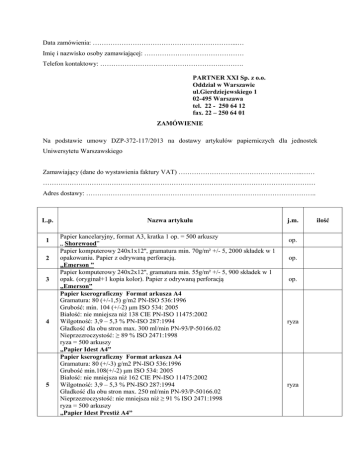 Data zamówienia: ………………………………………………………...… Imię i nazwisko osoby zamawiającej: ……………………………………… Telefon kontaktowy: ……………………………………………….………. PARTNER XXI Sp. z o.o. Oddział w Warszawie ul.Gierdziejewskiego 1 02-495 Warszawa tel. 22 - 250 64 12 fax. 22 – 250 64 01 ZAMÓWIENIE Na podstawie umowy DZP-372-117/2013 na dostawy artykułów papierniczych dla jednostek Uniwersytetu Warszawskiego Zamawiający (dane do wystawienia faktury VAT) ………………………………………………..…… …………………………………………………………………………………………………………… Adres dostawy: ………………………………………………………………………………………….. L.p. 1 2 3 4 5 Nazwa artykułu Papier kancelaryjny, format A3, kratka 1 op. = 500 arkuszy „ Shorewood” Papier komputerowy 240x1x12'', gramatura min. 70g/m² +/- 5, 2000 składek w 1 opakowaniu. Papier z odrywaną perforacją. „Emerson ” Papier komputerowy 240x2x12'', gramatura min. 55g/m² +/- 5, 900 składek w 1 opak. (oryginał+1 kopia kolor). Papier z odrywaną perforacją „Emerson” Papier kserograficzny Format arkusza A4 Gramatura: 80 (+/-1,5) g/m2 PN-ISO 536:1996 Grubość: min. 104 (+/-2) µm ISO 534: 2005 Białość: nie mniejsza niż 138 CIE PN-ISO 11475:2002 Wilgotność: 3,9 – 5,3 % PN-ISO 287:1994 Gładkość dla obu stron max. 300 ml/min PN-93/P-50166.02 Nieprzezroczystość: ≥ 89 % ISO 2471:1998 ryza = 500 arkuszy „Papier Idest A4” Papier kserograficzny Format arkusza A4 Gramatura: 80 (+/-3) g/m2 PN-ISO 536:1996 Grubość min.108(+/-2) µm ISO 534: 2005 Białość: nie mniejsza niż 162 CIE PN-ISO 11475:2002 Wilgotność: 3,9 – 5,3 % PN-ISO 287:1994 Gładkość dla obu stron max. 250 ml/min PN-93/P-50166.02 Nieprzezroczystość: nie mniejsza niż ≥ 91 % ISO 2471:1998 ryza = 500 arkuszy „Papier Idest Prestiż A4” j.m. op. op. op. ryza ryza ilość 6 7 8 9 10 11 Papier kserograficzny Format arkusza A4 Gramatura: 90 (+/-3) g/m2 PN-ISO 536:1996 Grubość: 119 (+/-4)µm ISO 534: 2005 Białość: nie mniejsza niż 170 CIE PN-ISO 11475:2002 Wilgotność: 3,9 – 5,3 % PN-ISO 287:1994 Gładkość dla obu stron max. 140 +/- 30 ml/min PN-93/P-50166.02 Nieprzezroczystość: ≥ 94,5 % ISO 2471:1998 ryza = 500 arkuszy „Papier Target 90 Personal A4 Grupo Portucel Soporcel” Papier kserograficzny kolorowy - barwy pastelowe Format arkusza A4 Gramatura: 80 (+/-3) g/m2 PN-ISO 536:1996 Grubość min.108(+/-2) µm ISO 534: 2005 Wilgotność: 3,9 – 5,3 % PN-ISO 287:1994 Gładkość dla obu stron max. 250 ml/min PN-93/P-50166.02 Nieprzezroczystość: nie mniejsza niż ≥ 90 % ISO 2471:1998 ryza = 500 arkuszy „Papier Symphony A4 XEROX” Papier kserograficzny Format arkusza A3 Gramatura: 80 (+/-3) g/m2 PN-ISO 536:1996 Grubość min.108(+/-2) µm ISO 534: 2005 Białość: nie mniejsz niż 162 CIE PN-ISO 11475:2002 Wilgotność: 3,9 – 5,3 % PN-ISO 287:1994 Gładkość dla obu stron max. 250 ml/min PN-93/P-50166.02 Nieprzezroczystość: nie mniejsza niż ≥ 91 % ISO 2471:1998 ryza = 500 arkuszy „Papier Idest Prestiż A3” Papier termiczny do faksu o wymiarach 216X30 mb. „Emerson ” Papier kserograficzny Format arkusza A4 Gramatura: 100 (+/-4) g/m2 PN-ISO 536:1996 Grubość 123 (+/-4) µm ISO 534: 2005 Białość: nie mniejsza niż 170 CIE PN-ISO 11475:2002 Wilgotność: 3,9 – 5,3 % PN-ISO 287:1994 Gładkość dla obu stron max. 140 +/- 50 ml/min PN-93/P-50166.02 Nieprzezroczystość: nie mniejsza niż ≥ 95 % ISO 2471:1998 ryza = 500 arkuszy „Papier Target 100 Personal A4 Grupo Portucel Soporcel/” Papier kserograficzny Format arkusza A4 Gramatura: 120 (+/-1,5) g/m2 PN-ISO 536:1996 Grubość 125 (+/-2) µm ISO 534: 2005 Białość: nie mniejsza niż 161 CIE PN-ISO 11475:2002 Wilgotność: 3,9 – 5,3 % PN-ISO 287:1994 Gładkość dla obu stron max. 50 ml/min PN-93/P-50166.02 Nieprzezroczystość: nie mniejsza niż ≥ 95 % ISO 2471:1998 ryza = 500 arkuszy „Papier Colotech 120 XEROX” ryza ryza ryza szt. ryza ryza ……………………………………….. akceptacja kierownika jednostki ………….……………………………………………….. akceptacja Zastępcy Kanclerza ds. Ekonomicznych