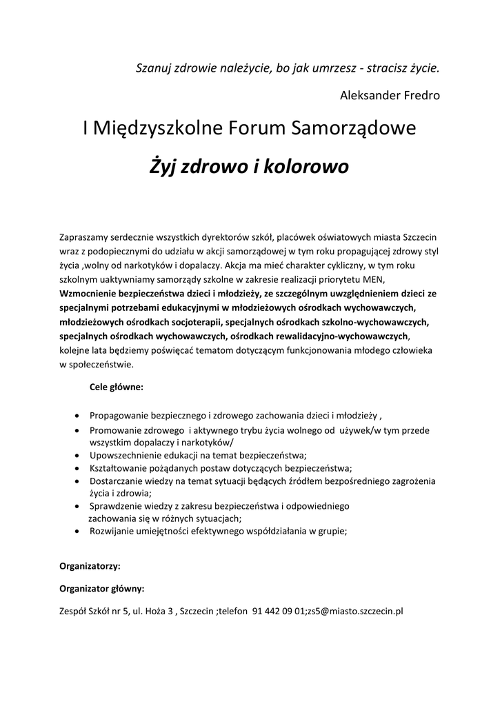 Szanuj zdrowie należycie, bo jak umrzesz - stracisz życie. Aleksander Fredro I Międzyszkolne Forum Samorządowe Żyj zdrowo i kolorowo Zapraszamy serdecznie wszystkich dyrektorów szkół, placówek oświatowych miasta Szczecin wraz z podopiecznymi do udziału w akcji samorządowej w tym roku propagującej zdrowy styl życia ,wolny od narkotyków i dopalaczy. Akcja ma mieć charakter cykliczny, w tym roku szkolnym uaktywniamy samorządy szkolne w zakresie realizacji priorytetu MEN, Wzmocnienie bezpieczeństwa dzieci i młodzieży, ze szczególnym uwzględnieniem dzieci ze specjalnymi potrzebami edukacyjnymi w młodzieżowych ośrodkach wychowawczych, młodzieżowych ośrodkach socjoterapii, specjalnych ośrodkach szkolno-wychowawczych, specjalnych ośrodkach wychowawczych, ośrodkach rewalidacyjno-wychowawczych, kolejne lata będziemy poświęcać tematom dotyczącym funkcjonowania młodego człowieka w społeczeństwie. Cele główne: Propagowanie bezpiecznego i zdrowego zachowania dzieci i młodzieży , Promowanie zdrowego i aktywnego trybu życia wolnego od używek/w tym przede wszystkim dopalaczy i narkotyków/ Upowszechnienie edukacji na temat bezpieczeństwa; Kształtowanie pożądanych postaw dotyczących bezpieczeństwa; Dostarczanie wiedzy na temat sytuacji będących źródłem bezpośredniego zagrożenia życia i zdrowia; Sprawdzenie wiedzy z zakresu bezpieczeństwa i odpowiedniego zachowania się w różnych sytuacjach; Rozwijanie umiejętności efektywnego współdziałania w grupie; Organizatorzy: Organizator główny: Zespół Szkół nr 5, ul. Hoża 3 , Szczecin ;telefon 91 442 09 01;[email protected] Partner: ODN w ZCEMiP w Szczecinie, ul. Hoża 6; telefon 91 428 29 44; [email protected] Uczestnicy: Samorządy szkolne szkół podstawowych oraz gimnazjów miasta Szczecin Opis przedsięwzięcia Akcja adresowana do szkół ma na celu propagować zdrowy styl życia, samorządy szkolne uczestniczące w akcji przeprowadzają cykl imprez promujących bezpieczny i zdrowy styl życia, przykładowe imprezy: Konkurs na scenkę rodzajowa promującą zdrowy styl życia Przygotowanie około 30-40 sekundowego spotu filmowego ”Dopalacze kradną życie” Konkurs wiedzowy na temat zagrożeń związanych z zażywaniem używek Debata szkolna Żyję zdrowo i kolorowo Inauguracja 22.02.2016 rok ZS nr 5 godzina 13.30 Warsztaty dla uczniów Warsztaty dla nauczycieli/opiekunów Samorządy szkolne biorące udział w akcji przygotowują sprawozdawczą prezentację multimedialną lub sprawozdanie w innej formie i przesyłają ją na adres organizatora do 31.03.2016r. Spotkanie przedstawicieli uczniowskich/ ocena prezentacji/ 10.04.2016r. Działania samorządowe będą poddane ocenie przedstawicieli uczniów wszystkich szkół biorących udział w akcji/ prezentacja podjętych działań podczas forum samorządowego/ Akcja objęta jest Mecenatem Miasta Szczecin oraz Honorowym Patronatem Zachodniopomorskiego Kuratora Zgłoszenia udziału w akcji 18.02.2016 rok /karta zgłoszenia w załączniku/ Sprawozdanie z działań szkoły na rzecz propagowania bezpieczeństwa/ w formie prezentacji multimedialnej lub w innej formie/ do 31.03.2016r./przesłane na adres organizatora. FORUM SAMORZĄDOWE 14.04.2016r. 1. Najciekawsze prezentacje akcji samorządowych 2. Debata Alternatywne metody spędzania wolnego czasu Spotkania z wybitnymi animatorami życia kulturalnego i sportowego miasta Szczecin Mediator w szkole- krótki warsztat dla młodzieży Wolontariat to moja pasja 3.Rozdanie nagród i wyróżnień dla szkół uczestniczących w akcji Zapraszamy serdecznie wszystkich mających potrzebę tworzenia świata pełnego pasji i radości koordynator akcji Dagmara Lewartowska opiekun SU w Gimnazjum nr 43 doradca metodyczny ODN w ZCEMiP w Szczecinie kontakt mailowy [email protected] [email protected]