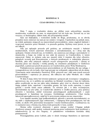 ROZDZIAŁ X CZAS OD DNIA 7-11 MAJA Dnia 7 maja, o wschodzie słońca, po obfitej rosie usłyszeliśmy muzykę moskiewską; wydawało się nam, że nieprzyjaciel był tuż koło nas. Zerwali się ze snu wszyscy, co dostrzegłszy, dałem znak, aby przynajmniej usiedli. Sam zaś klęknąłem, i wzniosłem modły do Boga, przekonany, że za chwilę przyjdzie może zmierzyć się nam po raz ostatni z wrogiem. Uspokoiłem się jednak zaraz, na widok spokojnie stojących na stanowiskach przewodników, mimo ciągłych bębnień i wygrywań marszów przez Moskali, i to przeszło godzinę. Byliśmy teraz pewni, że nas nie odkryli. Gdy już upłynęło przeszło pół godziny, po ucichnięciu muzyki i bębnień moskiewskich, wrócili ustawieni włościanie z zawiadomieniem, że i dwaj inni idą spokojnie. Ostatni oświecili nas, że Gołubów, nie zastawszy już nikogo z powstańców w miasteczku, a bojąc się widać na noc udać do puszczy za Czachowskim, w temże zanocował. Dalej, że stolarze całą noc musieli robić 6 trumien dla tyluż oficerów, poległych wczoraj pod Rzeczniowem, a których przebranych w żołnierskie płaszcze, Moskale, jako niby jedynych zabitych swych szeregowców przywieźli, i dzisiaj ze słyszaną przez nas muzyką i wielką paradą, na cmentarzu parafjalnym w Grabowcu pogrzebali, a potem już poszli do puszczy za Czachowskim, przez Wolę Modrzejową. Podziękowawszy patrjotycznym przewodnikom za ich braterską dla nas usługę, i wynagrodziwszy ich za trudy, choć tego przyjąć się wzbraniali, odprawiłem ich do domu. Tymczasem zacni mieszkańcy Pasztowej Woli, pożywili nas i dali nam trzech nowych przewodników i szperaczy po puszczy, dla odkrycia nie tylko Moskali, ale i śladu Czachowskiego. W dniu 8 maja, który był również pięknym i gorącym jak wczorajszy i onegdajszy, upewniwszy się, ze w pobliżu nie natrafimy na Moskali wyszliśmy z lasu do Lubienia, gdzie oczekiwało na nas juz jakie takie śniadanie; gdyż wieś ta, chociaż dosyć duża, mając jednak liche, sapowate i niewielkie grunta, nie była wcale zamożną, a często gościła i żywiła różne nasze oddziały. Tu również jak i w dniu wczorajszym, dowiedziałam się tyle tylko, że Czachowski zaledwie w środku puszczy, przy pomocy oficerów i kawalerji, zdołał wstrzymać pierzchających podkomendnych i część przodujących w haniebnej tej rozsypce, Grelińskiego uciekinierów. Choć trochę takowych uporządkowawszy, zajął był w powyższem miejscu na noc stanowisko. Lecz upadek moralny jego podkomendnych, głównie z powodu niewiadomości, co się stało z najdawniejszymi jego żołnierzami,. i najlepszą broń posiadającymi, był tak wielki, ze około 250, przeważnie kosynjerów i reszta Grelińszczyków, wymknąwszy się w ciemności nocy z bronią swą, którą wielu porzuciło w lesie, uciekli. Można sobie wystawić oburzenie i gniew starego wodza! Ulegając jednak chwilowej sytuacji, udał spokój: rozkazał porzuconą przez ucikinierów broń pozbierać a naładowawszy ją na swe furgony, w pułudniowo wchodniem kierunku dalej pomaszerował. Przeciągnęliśmy przez Lubień, jako w dzień świętego Stanisława ze śpiewami: 109 «Kto się w opiekę poda Panu swemu» - i pomaszerowaliśmy dalej już sami ku obozowisku, pod Budami; gdyż przed wieczorem, wczoraj, zacnych włościan wsi z Pasztowej woli pożegnaliśmy, wyprawiając ich z powrotem do domu. Około godziny 12 rano, wyprowadziłem swych towarzyszy na trakt z Iłży do Ostrowca, zaledwie o paręset kroków od karczmy. Tu, obok potwierdzenia wieści o kolumnie Czachowskiego, dodano objaśnienie: iż nowa kolumna moskiewska, z czterech rot piechoty i kawalerji, dzisiaj rano tędy przeciągnęła, i poszedłszy na południe, drogą ku Ostrowcowi, rzeczywiście skręciła na wschód, ku Dankowu borami wiodącą. Poprowadziłem więc i ja towarzyszy traktem na południe, a około godziny 12 w południe dopędziły nas pospiesznie dwie bryczki mieszczan z patrjotycznej Iłży, wiozące pełno na nich różnych wędlin dla oddziału Czachowskiego, który według nich miał nocować w Dankowie. Zakupiłem więc od nich dla siebie i towarzyszy część takowych, i przepuściłem ich dalej, przed sobą. Opowiedzieli mi przytem mieszczanie, jaki skutek bezwzględne nasze postępowanie z Moskalami, w bitwach pod Stefankowem i w Bałtowskich lasach dla naszych rannych sprowadziło. Pułkownik Zwierow, gdy w miasteczku Siennem zastał naszych rannych, nawiedził wszystkich, a przemawiając do nich, po moskiewsku, uspokajał, aby się go nie bali; bo on, chociaż Zwierow, ale nie zwierz, i nie Czengiery, jak się sam miał wyrazić. Prócz tego kazał natychmiast swym felczerom i lekarzowi rany ich opatrzyć, nastawić samowary i herbatą ich częstował. Zaś przed wymarszem z tego miasta, pozostawił na piśmie pozwolenie na założenie szpitala dla rannych powstańców w miastach: Siennie, Iłży i Wąchocku, a to pod kontrolą swoją. Otóż i tu, pokazał się dowodnie charakter azjatyckiej Moskwy. Dopokąd bowiem powstańcy z r. 1863 po ludzku obchodzili się z jej jeńcami wojennemi, obdarzając ich wolnością, a nawet dając im i pieniądze na drogę, to ci, zaledwie uszli po za ich obóz o pół mili lub trochę dalej, odpłacali się im za to: rabowaniem i paleniem siół, lezących na drodze ich i mordowaniem spokojnych mieszkańców; towarzysze zaś ich, znów mordowali i dobijali naszych rannych. Jakże tylko zaczęliśmy bezwzględnie z nimi w rzeczonych bitwach postępować, tak zaraz jakby w nagrodę teg otrzymaliśmy akt ich urzędowy, dowodzący szacunku i względności dla nas. Z czego niech każdy, którego los fatalny zmusi do przestawania lub walczenia z tym barbarzyńskim, okrutnym, ciemnym i zupełnie dzikim, a podstępnym i przewrotnym narodem i jego azjatycko-bizantyńskim rządem, misję tylko zniszczenia i zburzenia wszelkiej cywilizacji za jedyny swój cel istnienia i powołania uznającym - t