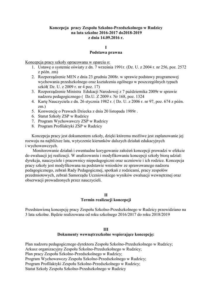 Koncepcja pracy Zespołu Szkolno-Przedszkolnego w Rudzicy na lata szkolne 2016-2017 do2018-2019 z dnia 14.09.2016 r. I Podstawa prawna Koncepcja pracy szkoły opracowana w oparciu o: 1. Ustawę o systemie oświaty z dn. 7 września 1991r. (Dz. U. z 2004 r. nr 256, poz. 2572 z późn. zm) 2. Rozporządzenie MEN z dnia 23 grudnia 2008r. w sprawie podstawy programowej wychowania przedszkolnego oraz kształcenia ogólnego w poszczególnych typach szkół( Dz. U. z 2009 r. nr 4 poz. 17) 3. Rozporządzenie Ministra Edukacji Narodowej z 7 października 2009r w sprawie nadzoru pedagogicznego ( Dz.U. Z 2009 r. Nr 168, poz. 1324 4. Kartę Nauczyciela z dn. 26 stycznia 1982 r. ( Dz. U. z 2006 r. nr 97, poz. 674 z późn. zm.) 5. Konwencję o Prawach Dziecka z dnia 20 listopada 1989r . 6. Statut Szkoły ZSP w Rudzicy 7. Program Wychowawczy ZSP w Rudzicy 8. Program Profilaktyki ZSP w Rudzicy Koncepcja pracy jest dokumentem szkoły, dzięki któremu możliwe jest zaplanowanie jej rozwoju na najbliższe lata, wytyczenie kierunków dalszych działań edukacyjnych i wychowawczych. Monitorowanie działań i ewentualne korygowanie założeń koncepcji prowadzi w efekcie do ewaluacji jej realizacji. W analizowaniu i modyfikowaniu koncepcji szkoły biorą udział: dyrekcja, nauczyciele i pracownicy niepedagogiczni oraz uczniowie i ich rodzice. Koncepcja pracy szkoły jest modyfikowana na podstawie wniosków ze sprawowanego nadzoru pedagogicznego, zebrań Rady Pedagogicznej, spotkań z rodzicami, pracy zespołów przedmiotowych, zebrań Samorządu Uczniowskiego wyników ewaluacji wewnętrznej oraz obserwacji prowadzonych przez nauczycieli. II Termin realizacji koncepcji Przedstawioną koncepcję pracy Zespołu Szkolno-Przedszkolnego w Rudzicy przewidziano na 3 lata szkolne. Będzie realizowana od roku szkolnego 2016/2017 do roku 2018/2019 III Dokumenty wewnątrzszkolne wspierające koncepcję: Plan nadzoru pedagogicznego dyrektora Zespołu Szkolno-Przedszkolnego w Rudzicy; Arkusz organizacyjny Zespołu Szkolno-Przedszkolnego w Rudzicy; Plan pracy Zespołu Szkolno-Przedszkolnego w Rudzicy; Program Wychowawczy Zespołu Szkolno-Przedszkolnego w Rudzicy; Program Profilaktyki Zespołu Szkolno-Przedszkolnego w Rudzicy; Statut Szkoły Zespołu Szkolno-Przedszkolnego w Rudzicy IV Misja i wizja Misja przedszkola: „Przedszkole drugim domem” Misja szkoły: „Uczymy się nie dla szkoły lecz dla życia” Wizja przedszkola i szkoły Przedszkole i szkoła wspierają rodzinę w procesie wychowania i nauczania, stwarzają dzieciom optymalne warunki do wszechstronnego i harmonijnego rozwoju w poczuciu bezpieczeństwa i poszanowania godności osobistej. Nasza placówka, respektując chrześcijański system wartości, kształtuje postawę uczciwości, szacunku, życzliwości, współpracy i otwartości w stosunku do innych ludzi i innych narodów. Wychowuje ucznia odpowiedzialnego, aktywnego, ciekawego świata, a jednocześnie dbającego o tradycje i pielęgnującego patriotyzm. Szkoła przygotowuje ucznia do dalszego kształcenia i funkcjonowania we współczesnym świecie. Dążymy do tego, aby nasza szkoła: - wyposażała uczniów w rzetelną wiedzę i umiejętności przydatne w różnych sytuacjach życiowych - umożliwiała rozwijanie zainteresowań i talentów - przygotowywała dzieci do odnoszenia sukcesów na miarę ich indywidualnych możliwości i radzenia sobie z trudnościami - podejmowała działania wychowawcze mające na celu eliminowanie zagrożeń i wzmacnianie właściwych zachowań - uczyła rozwiązywania konfliktów, niwelowała dyskryminację rówieśniczą wśród uczniów - kształtowała postawy patriotyczne, proekologiczne, zachowania prozdrowotne oraz wyrabiała czujność wobec zagrożeń dla zdrowia fizycznego i psychicznego - przygotowywała do uczestnictwa w życiu kulturalnym - stwarzała warunki do samorządnego działania uczniów - współpracowała z organizacjami i osobami aktywnymi w środowisku lokalnym - rozwijała samodzielność, obowiązkowość i umiejętność współpracy w grupie - uczyła korzystania z najnowszych zdobyczy techniki informacyjnej i informatycznej - w planowaniu pracy uwzględniała opinie i oczekiwania rodziców, uczniów i nauczycieli Szczegółowe cele przedszkola: - wspomaganie dzieci w rozwijaniu uzdolnień oraz kształtowanie czynności intelektualnych potrzebnych im w codziennych sytuacjach i w dalszej edukacji, - budowanie systemu wartości, w tym wychowywanie dzieci tak, żeby lepiej orientowały się w tym co dobre, a co złe, - kształtowanie u dzieci odporności emocjonalnej koniecznej do racjonalnego radzenia sobie w nowych i trudnych sytuacjach, w tym także do łagodnego znoszenia stresów i porażek, rozwijanie umiejętności społecznych dzieci, które są niezbędne w poprawnych relacjach z dziećmi i dorosłymi, - stwarzanie warunków sprzyjających wspólnej i zgodnej zabawie oraz nauce dzieciom o zróżnicowanych możliwościach fizycznych i intelektualnych, - troska o zdrowie dzieci i ich sprawność fizyczną, zachęcanie do uczestnictwa w zabawach i grach sportowych, - budowanie dziecięcej wiedzy o świecie społecznym, przyrodniczym i technicznym oraz rozwijanie umiejętności prezentowania swoich przemyśleń w sposób zrozumiały dla innych, - wprowadzenie dzieci w świat wartości estetycznych i rozwijanie umiejętności - wypowiadania się poprzez muzykę, małe formy teatralne oraz sztuki plastyczne, - kształtowanie u dzieci poczucia przynależności społecznej ( do rodziny, grupy rówieśniczej i wspólnoty narodowej) oraz postawy patriotycznej, - zapewnienie dzieciom lepszych szans edukacyjnych poprzez wspieranie ich ciekawości, aktywności i samodzielności, a także kształtowanie tych wiadomości umiejętności, które są ważne w edukacji szkolnej. Absolwent naszego przedszkola powinien osiągnąć dojrzałość szkolną: znać zasady właściwego zachowania, być samodzielny w zakresie samoobsługi, współpracować w