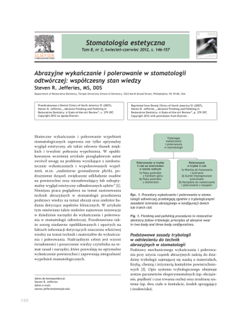 Stomatologia estetyczna Tom 8, nr 2, kwiecień-czerwiec 2012, s. 146-157 Abrazyjne wykańczanie i polerowanie w stomatologii odtwórczej: współczesny stan wiedzy Steven R. Jefferies, MS, DDS Department of Restorative Dentistry, Temple University School of Dentistry, 3223 North Broad Street, Philadelphia, PA 19140, USA Przedrukowano z Dental Clinics of North America 51 (2007), Steven R. Jefferies „ Abrasive Finishing and Polishing in Restorative Dentistry: A State-of-the-Art Review”, s. 379–397, Copyright 2012 za zgodą Elsevier. Skuteczne wykańczanie i polerowanie wypełnień stomatologicznych zapewnia nie tylko optymalny wygląd estetyczny, ale także zdrowie tkanek miękkich i trwałość pobrzeża wypełnienia. W opublikowanym wcześniej artykule przeglądowym autor zwrócił uwagę na problemy wynikające z niedostatecznie wykończonych i wypolerowanych wypełnień, m.in. „nadmierne gromadzenie płytki, podrażnienie dziąseł, zwiększone odkładanie osadów na powierzchni oraz niezadowalający lub suboptymalny wygląd estetyczny odbudowanych zębów” [1]. Niniejsza praca poglądowa na temat zastosowania technik abrazyjnych w stomatologii przedstawia podstawy wiedzy na temat abrazji oraz niektóre badania dotyczące aspektów klinicznych. W artykule tym omówiono także niektóre najnowsze innowacje w dziedzinie narzędzi do wykańczania i polerowania w stomatologii odtwórczej. Przedstawiono także szereg niedawno opublikowanych i opartych na faktach informacji dotyczących znaczenia właściwej wiedzy na temat technik i materiałów do wykańczania i polerowania. Nadrzędnym celem jest wzrost świadomości i poszerzenie wiedzy czytelnika na temat zasad i narzędzi, które pozwalają na optymalne wykończenie powierzchni i zapewniają integralność wypełnień stomatologicznych. Adres do korespondencji: Steven R. Jefferies Adres e-mail: [email protected] 146 Reprinted from Dental Clinics of North America 51 (2007), Steven R. Jefferies „ Abrasive Finishing and Polishing in Restorative Dentistry: A State-of-the-Art Review”, p. 379–397, Copyright 2012 with permission from Elsevier. Trybologia wykańczania i polerowania w stomatologii Polerowanie w trybie 3 ciał ze ścierniwem w stanie wolnym 1) Pasty polerskie z tlenkiem glinu 2) Pasty polerskie z diamentem Polerowanie w trybie 2 ciał 1) Wiertła do frezowania i ścierania 2) Gumki impregnowane ścierniwem 3) Narzędzia do wykańczania i polerowania z nasypem Ryc. 1. Procedury wykańczania i polerowania w stomatologii odtwórczej przebiegają zgodnie z trybologicznymi zasadami ścierania abrazyjnego w konfiguracji dwóch lub trzech ciał. Fig. 1. Finishing and polishing procedures in restorative dentistry follow tribiologic principles of abrasive wear in two-body and three-body configurations. Podstawowe zasady trybologii w odniesieniu do technik abrazyjnych w stomatologii Podstawy mechanicznego wykańczania i polerowania przy użyciu cząstek abrazyjnych należą do dziedziny trybologii zajmującej się nauką o materiałach, fizyką, chemią i inżynierią kontaktów powierzchniowych [2]. Opis systemu trybologicznego obejmuje zestaw parametrów eksperymentalnych (np. obciążenie, prędkość i czas trwania ruchu) oraz strukturę systemu (np. dwa ciała w kontakcie, środek sprzęgający i środowisko). Narzędzia, materiały i procedury wykańczania oraz polerowania mają na celu wywołanie zamierzonego, wybiórczego i kontrolowanego ścierania powierzchni odtwórczych materiałów stomatologicznych. Ścieranie definiuje się jako zjawisko kumulacyjnego niszczenia powierzchni, w ramach którego dochodzi do usuwania materiału w postaci drobnych cząstek, głównie na skutek procesów mechanicznych. Mechanizm ścierania polega na transferze energii wraz z usuwaniem lub przemieszczaniem materiału. Cztery główne mechanizmy ścierania to adhezja, abrazja, zmęczenie powierzchniowe i reakcje trybochemiczne. W przypadku polerowania z użyciem cząstek abrazyjnych podstawowym mechanizmem jest ścieranie abrazyjne, ale możliwe są także inne mechanizmy. Należą do nich zmęczenie powierzchniowe oraz powstawanie rowków lub zarysowań, którym w niektórych przypadkach towarzyszą pęknięcia Hertza. W niniejszym artykule zastosowano klasyfikację trybów abrazyjnego ścierania opartą na najszerzej przyjętych terminach. Są to abrazja dwóch ciał i abrazja trzech ciał. Terminy te ilustrują sytuacje eksperymentalne, z jakimi spotykamy się podczas wykańczania i polerowania, co przedstawiono na rycinie 1. W trybie dwóch ciał cząstki abrazyjne są mocno przytwierdzone do substratu (Ryc. 1). W trybie abrazji trzech ciał wolne (lub luźno osadzone) cząstki tworzą zawiesinę pomiędzy powierzchnią polerowanego materiału i płaskim substratem polerskim (Ryc. 1). Wolne cząstki w trybie trzech ciał może stanowić celowo zastosowany środek ścierny lub drobinki odczepione od trącej powierzchni. Większość rozwiązań do wykańczania i polerowania w stomatologii działa w trybie dwóch ciał. Jednak dentyści, higienistki i technicy dentystyczni wykorzystują tryb abrazji trzech ciał, stosując dodatkowy środek ścierny, na przykład pasty profilaktyczne/polerskie. Ścieranie abrazyjne trzech ciał ma miejsce wtedy, kiedy swobodne cząstki poruszają się pomiędzy powierzchnią materiału i narzędzia polerskiego. Dzieje się tak w przypadku zamierzonego zastosowania środka ściernego, który ma przemieszczać się po powierzchni substratu polerskiego, jak również podczas ostatniego etapu polerowania, kiedy stosuje się bardzo drobne ścierniwo na miękkich, nawilżonych krążkach. Tryb trzech ciał może także mieć miejsce wtedy, kiedy dochodzi do odrywania drobnych fragmentów materiału od polerowanej substancji i ich uwięźnięcia lub krążenia w strefie pomiędzy dwoma pierwszymi ciałami. Objawami ścierania abrazyjnego są zmiana stopnia chropowatości powierzchni na skutek usuwa- nia 