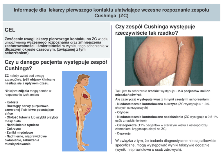 Informacje dla lekarzy pierwszego kontaktu ułatwiaj ce wczesne rozpoznanie zespołu Cushinga (ZC) CEL Czy zespół Cushinga wyst puje rzeczywi cie tak rzadko? Zwrócenie uwagi lekarzy pierwszego kontaktu na ZC w celu umo liwienia wczesnego rozpoznania oraz zmniejszenia zachorowalno ci i miertelno ci w wyniku tego schorzenia w dłu szym okresie czasowym. (zwi zanej z tym schorzeniem) Czy u danego pacjenta wyst puje zespół Cushinga? ZC nale y wzi pod uwag szczególnie, je li objawy kliniczne nasilaj si z upływem czasu. Niniejsze zdj cia mog pomóc w rozpoznaniu tych zmian: - Kobieta - Rozst py barwy purpurowoczerwonej i/lub łatwo powstaj ce si ce - Otyło tułowia lub szybki przybór masy ciała - Nadci nienie t tnicze - Cukrzyca - Zaniki mi niowe - Nadmierne, nieprawidłowe owłosienie, zaburzenia miesi czkowania Tak, jest to schorzenie rzadkie: wyst puje u 2-3 pacjentów /milion mieszka ców/rok. Ale zazwyczaj wyst puje wraz z innymi cz stymi schorzeniami: - Niedostatecznie kontrolowana cukrzyca (ZC wyst puje u 1-3% chorych cukrzycowych) - Otyło - Niedostatecznie kontrolowane nadci nienie (ZC wyst puje u 0,5-1% osób z nadci nieniem) - Osteoporoza (11% pacjentów w starszym wieku z osteoporoz i złamaniami kr gosłupa cierpi na ZC) - Depresja W zwi zku z tym, e badania diagnostyczne nie s całkowicie specyficzne, mog wyst powa wyniki fałszywie dodatnie (wyniki nieprawidłowe u osób zdrowych). Informacje dla lekarzy pierwszego kontaktu ułatwiaj ce wczesne rozpoznanie zespołu Cushinga (ZC) Czy ZC mo na przeoczy ? „Powa ne podejrzenie” je li: Tak! Jakie konsekwencje ma pó ne rozpoznanie? - Obni enie jako ci ycia - Wy sze ryzyko chorób sercowonaczyniowych (w tym kardiopatii niedokrwiennej, zatoru t tnicy płucnej, udaru mózgu i zakrzepicy ył gł bokich) - Zmniejszenie masy kostnej (prowadz ce do złama ) - Przyrost tkanki tłuszczowej (powoduj cy otyło , szczególnie w rejonie brzucha) - Zwi kszenie miertelno ci (4-5 krotnie w porównaniu z populacj ogóln ) Po odstawieniu glikokortykoidów egzogennych (w tym podawanych w formie wstrzykni , kropli do oczu lub nosa, przezskórnie lub doodbytniczo) nadal wyst puj : - Liczne i post puj ce objawy ZC: łatwo powstaj ce si ce, gromadzenie si tkanki tłuszczowej na twarzy (tzw. twarz ksi ycowata), osłabienie mi ni proksymalnych, rozst py (szczególnie purpurowo-czerwone i o szeroko ci > 1 cm) - Incidentaloma nadnerczy (przypadkowo stwierdzony guz nadnercza) - Osteoporoza na nieznanym podło u lub nadci nienie t tnicze nietypowe dla danej grupy wiekowej. Jak mo na potwierdzi rozpoznanie ZC? Wykonuj c test diagnostyczny o wysokim stopniu dokładno ci: a) Dobowe st enie wolnego kortyzolu w moczu, przynajmniej dwukrotnie (powinno by w normie) b) St enie kortyzolu w linie o północy (materiał mo na pobra w domu za pomoc niewielkiego, specjalnie zaprojektowanego s czka - SalivetteR - który pacjent prze uwa przez 2-3 min., jego termin wa no ci wynosi kilka dni –mo na przesła do laboratorium poczt ). c) Test hamowania z 1 mg deksametazonu (podanie w godz. 23:0024:00 i pobranie krwi do badania st enia kortyzolu w godz. 8:00-9:00; z wynikiem < 2 mcg/L=55 nmol/L – w normie) Informacje dla lekarzy pierwszego kontaktu ułatwiaj ce wczesne rozpoznanie zespołu Cushinga (ZC) Je li którykolwiek wynik odbiega od normy, wyst puj niezgodno ci lub w tpliwo ci: pacjenta nale y skierowa do endokrynologa. ADEN Z TESTÓW NIE JEST IDEALNY i nie jest całkowicie specyficzny, przez co mog wyst powa wyniki fałszywie dodatnie. - Specyficzno - Czuło : zdolno : zdolno do wykluczenia choroby u osoby zdrowej. do wykrycia choroby u osoby chorej. Wraz ze wzrostem czuło ci testu, maleje liczba wyników negatywnych u osób chorych (wyniki fałszywie ujemne). Wraz ze wzrostem specyficzno ci, maleje liczba wyników dodatnich u osób zdrowych (wyniki fałszywie dodatnie). Populacja ogólna WYNIK TESTU Populacja chora Populacja zdrowa Brak choroby Fałszywie ujemny OK Choroba OK Fałszywie dodatni Czy ZC mo na łatwo wykluczy ? Je li wyniki s w normie i zgodne: nie s wymagane dalsze badania i mo na wykluczy ZC. ZC mo e tak e mie przebieg cykliczny, jednak zazwyczaj przebiega post puj co, w przypadku w tpliwo ci nale y powtórzy testy po upływie 6 miesi cy. Populacje specjalne/czynniki mog ce utrudnia rozpoznanie ZC Szereg schorze i stanów powoduje podwy szenie st enia kortyzolu i objawy kliniczne podobne do objawów zespołu Cushinga, pomimo, e nie wyst puje on u pacjenta: Depresja i inne choroby psychiczne Niedostatecznie kontrolowana cukrzyca Incidentaloma nadnerczy Otyło zaawansowana Alkoholizm Ci a Padaczka Niewydolno nerek SC o przebiegu cyklicznym Podejrzenie ZC u dzieci w nast. przypadkach: - Przy malej cym perecentylu wzrostu ro nie ci - Otyło nie jest wynikiem spowolnienia wzrostu. Autorzy: Dr Susan Webb i Alicia Santos Tłumaczenie sprawdzone: Prof Anna A Kasperlik-Zaluska, dr Piotr Zdunowski Przy współpracy z ERCUSYN (www.ercusyn.eu) Ilustracje: Javi Ruiz (www.ilustradorfreelance.com) ar ciała.