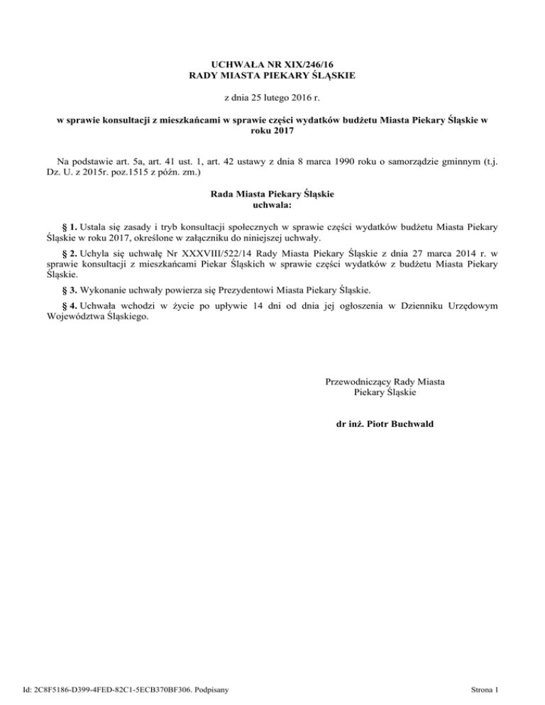 UCHWAŁA NR XIX/246/16 RADY MIASTA PIEKARY ŚLĄSKIE z dnia 25 lutego 2016 r. w sprawie konsultacji z mieszkańcami w sprawie części wydatków budżetu Miasta Piekary Śląskie w roku 2017 Na podstawie art. 5a, art. 41 ust. 1, art. 42 ustawy z dnia 8 marca 1990 roku o samorządzie gminnym (t.j. Dz. U. z 2015r. poz.1515 z późn. zm.) Rada Miasta Piekary Śląskie uchwala: § 1. Ustala się zasady i tryb konsultacji społecznych w sprawie części wydatków budżetu Miasta Piekary Śląskie w roku 2017, określone w załączniku do niniejszej uchwały. § 2. Uchyla się uchwałę Nr XXXVIII/522/14 Rady Miasta Piekary Śląskie z dnia 27 marca 2014 r. w sprawie konsultacji z mieszkańcami Piekar Śląskich w sprawie części wydatków z budżetu Miasta Piekary Śląskie. § 3. Wykonanie uchwały powierza się Prezydentowi Miasta Piekary Śląskie. § 4. Uchwała wchodzi w życie po upływie 14 dni od dnia jej ogłoszenia w Dzienniku Urzędowym Województwa Śląskiego. Przewodniczący Rady Miasta Piekary Śląskie dr inż. Piotr Buchwald Id: 2C8F5186-D399-4FED-82C1-5ECB370BF306. Podpisany Strona 1 Załącznik do Uchwały Nr XIX/246/16 Rady Miasta Piekary Śląskie z dnia 25 lutego 2016 r. Zasady i tryb konsultacji społecznych w sprawie części wydatków budżetu Miasta Piekary Śląskie w roku 2017 „Budżet Obywatelski 2017” Słownik pojęć: Ilekroć w niniejszym Załączniku jest mowa o: 1) Mieście – należy przez to rozumieć Miasto Piekary Śląskie; 2) mieszkańcach - należy przez to rozumieć osoby zamieszkujące na terenie miasta Piekary Śląskie, w rozumieniu art. 25-27 ustawy z dnia 23 kwietnia 1964 r. – Kodeks cywilny (t.j. Dz. U. z 2014 poz. 121 z późn. zm.); 3) Budżecie Obywatelskim 2017, należy przez to rozumieć część wydatków budżetu Miasta Piekary Śląskie; 4) Prezydencie – należy przez to rozumieć Prezydenta Miasta Piekary Śląskie; 5) Radzie – należy przez to rozumieć Radę Miasta Piekary Śląskie; 6) okręgu – należy przez to rozumieć wyodrębniony obszar Miasta Piekary Śląskie; 7) Punkcie Informacyjnym Budżetu Obywatelskiego – należy przez to rozumieć określone Zarządzeniem Prezydenta Miasta miejsca przekazywania informacji dot. "Budżetu Obywatelskiego 2017" ; 8) projekcie ponadlokalnym – należy przez to rozumieć projekt obejmujący więcej niż 1 okręg. Rozdział 1. Postanowienia ogólne § 1. Budżet Obywatelski 2017 realizowany jest w wyniku procesu obejmującego bezpośrednią inicjatywę obywatelską w zakresie zgłaszania i konsultowania projektów (zadań), finansowanych z wydzielonej części wydatków z budżetu Miasta w roku 2017. § 2. 1. Ze środków Budżetu Obywatelskiego 2017 finansowane są projekty zgłaszane przez mieszkańców, należące do zadań własnych Miasta, z zastrzeżeniem zapisów § 11. 2. Realizacja zadań w ramach Budżetu Obywatelskiego 2017 powinna odbyć się w ciągu roku budżetowego 2017, przy czym w uzasadnionych przypadkach możliwe jest wydłużenie realizacji zadania do dnia 30 czerwca 2018r., na zasadach określonych ustawą o finansach publicznych z dnia 27 sierpnia 2009 r. (t.j. Dz. U. z 2013 poz. 885 z późn. zm.). 3. W ramach Budżetu Obywatelskiego 2017 mogą być proponowane projekty o charakterze lokalnym, które dotyczą przede wszystkim mieszkańców okręgów wskazanych w Załączniku nr 1 do niniejszych Zasad lub o charakterze ponadlokalnym dotyczące potrzeb mieszkańców więcej niż jednego okręgu. Rozdział 2. Terytorialny podział środków § 3. 1. Kwota na projekty w danym okręgu jest sumą dwóch kwot; - stałej – wynoszącej 50 000 zł na każdy okręg - zmiennej – będącej iloczynem liczby mieszkańców danego okręgu i kwoty 29 złotych. 2. Kwoty na projekty w okręgach podane są w Załączniku nr 2 do niniejszych Zasad. 3. Kwota na projekty w danym okręgu może być przeznaczona na jeden lub kilka projektów zgodnie z wynikiem konsultacji. Id: 2C8F5186-D399-4FED-82C1-5ECB370BF306. Podpisany Strona 1 § 4. 1. W przypadku braku projektów zakwalifikowanych do realizacji lub nierozdysponowania wszystkich środków finansowych, przeznaczonych dla projektów w danym okręgu istnieje możliwość przesunięcia niewykorzystanych środków finansowych do okręgów o największej frekwencji w głosowaniu lub rozdysponowania na projekty, którym brakuje części środków, aby zostały zrealizowane. 2. Decyzje w powyższych przypadkach podejmuje Prezydent. 3. Projekty ponadlokalne muszą być zgłoszone w każdym z okręgów których dotyczą z podaniem szacunkowego kosztu całości projektu i podziałem kosztów na okręgi. Rozdział 3. Zgłaszanie propozycji zadań § 5. 1. Prezydent zarządzeniem ustala harmonogram Budżetu Obywatelskiego 2017, który obejmuje m.in.: 1) termin i zasady zgłaszania propozycji projektów; 2) termin weryfikacji i opiniowania zgłoszonych projektów; 3) termin i zasady publicznej prezentacji zgłoszonych projektów; 4) termin i zasady głosowania mieszkańców na zakwalifikowane projekty. 2. Ogłoszenie listy projektów do realizacji, wybranych przez mieszkańców w wyniku głosowania, następuje w formie zarządzenia Prezydenta. 3. Wybrane projekty prezentowane są na sesji Rady Miasta. § 6. 1. Propozycje projektów do Budżetu Obywatelskiego 2017 może składać każdy mieszkaniec. 2. Propozycje projektu o charakterze lokalnym mogą zgłaszać jedynie mieszkańcy tego okręgu, którego dotyczy dany projekt. Projekty ponadlokalne może zgłaszać mieszkaniec każdego z okręgów którego dotyczy projekt. 3. Propozycja projektu musi zostać poparta pisemnie na formularzu przez co najmniej 15 mieszkańców danego okręgu. 4. Propozycja projektu musi zawierać: 1) imię i nazwisko, adres zamieszkania, dane kontaktowe (adres e - mail, nr telefonu) wnioskującego, 2) tytuł projektu, lokalizację projektu, opis projektu, szacunkowy koszt projektu, uzasadnienie i cel realizacji projektu, 3) listę co najmniej 15 mieszkańc