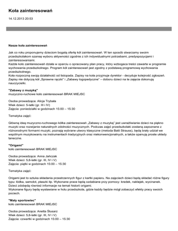 Koła zainteresowań 14.12.2013 20:53 Nasze koła zainteresowań Jak co roku proponujemy dzieciom bogatą ofertę kół zainteresowań. W ten sposób stwarzamy swoim przedszkolakom szansę wyboru aktywności zgodnie z ich indywidualnymi potrzebami, predyspozycjami i zainteresowaniami. Każde koło zainteresowań działa w oparciu o opracowany plan pracy, który wzbogaca treści zawarte w programie wychowania przedszkolnego. Program kół zainteresowań jest zgodny z podstawą programową wychowania przedszkolnego. Koła rozpoczną swoją działalność od listopada. Zapisy na koła przyjmuje dyrektor - decyduje kolejność zgłoszeń. Zapisy nie dotyczą kół „Sprawne rączki” i „Zabawy logopedyczne” – doboru dzieci na te zajęcia dokonują nauczycielki. "Zabawy z muzyką" muzyczno-ruchowe koło zainteresowań BRAK MIEJSC Osoba prowadząca: Alicja Trybała Wiek dzieci: 5-latki (gr. III i IV) Zajęcia: poniedziałki w godzinach 15:00 – 15:30 Tematyka zajęć: Główną ideą muzyczno-ruchowego kółka zainteresowań „Zabawy z muzyką” jest uwrażliwianie dzieci na piękno muzyki oraz rozwijanie naturalnych zdolności muzycznych. Podczas zajęć przedszkolaki zostaną zapoznane z różnorodnymi formami muzyki, poznają wybrane utwory klasyczne (metoda Batii Strauss), będą brały udział we wspólnym muzykowaniu na instrumentach tradycyjnych oraz niekonwencjonalnych, a także opanują proste układy taneczne. "Origami" koło zainteresowań BRAK MIEJSC Osoba prowadząca: Anna Jańczak Wiek dzieci: 5,6-latki (gr. III, IV i V) Zajęcia: piątki w godzinach 15:00 – 15:30 Tematyka zajęć: Origami jest to sztuka składania przestrzennych figur z kartki papieru. Na zajęciach dzieci będą składać różne figury typu: łódka, samolot, ptaszki itp. Wykonane prace będą ozdabiane przy pomocy: kredek, naklejek, wycinanek. Dzieci zdobędą również informacje na temat historii origami. Wykonane figury będą wystawiane w holu przedszkola, gdzie każdy będzie mógł zobaczyć efekty pracy swoich pociech. "Mały sportowiec" koło zainteresowań BRAK MIEJSC Osoba prowadząca: Anetta Ślusarz Wiek dzieci: 5,6-latki (gr. III, IV i V) Zajęcia: czwartki w godzinach 15:00 – 15:30 Tematyka zajęć: Na zajęciach z koła sportowego dzieci będą rozwijać ogólną sprawność fizyczną. Przeprowadzenie ćwiczeń przy muzyce sprzyjać będzie umuzykalnieniu dzieci – rozwijać ich poczucie rytmu i pamięć muzyczno – ruchową. W trakcie zajęć dziecko będzie rozwijać także cechy charakteru, jak: odwaga, samodzielność i wytrwałość. "Zabawy teatralne" koło zainteresowań BRAK MIEJSC Osoba prowadząca: Edyta Frątczak Wiek dzieci: 5,6 –latki (gr. III ,IV i V) Zajęcia: czwartki w godzinach 15:00 – 15:30 Tematyka zajęć: Cele i główne zadania: • Poznawanie różnych form teatralnych, • Odkrywanie własnych możliwości i uzdolnień artystycznych, • Rozwijanie zainteresowań teatrem i sztuką aktorską, • Stymulowanie rozwoju i inspirowanie twórczych działań wychowanków, • Nabywanie doświadczeń zarówno w sposób werbalny jak i nie werbalny, • Uwrażliwianie na piękno słowa mówionego, • Rozwijanie aktywności twórczej w zakresie słowa mówionego, • Kształcenie i wzbogacanie własnej pomysłowości, inwencji twórczej oraz wyobraźni w różnych formach aktywności, • Bogacenie czynnego słownictwa dzieci i uściślenie pojęć związanych z działalnością teatralną, • Rozwijanie umiejętności przedstawiania poznanych utworów za pomocą gestów, mimiki i ruchu, • Pobudzanie zainteresowań czytelniczych, jako źródła wiedzy i przeżyć, • Rozwijanie umiejętności operowania głosem pod względem intonacji. Głównym celem kółka teatralnego jest zapoznanie dziecka ze sztuką teatralną, poznawanie środków wyrazu artystycznego, stosowanych w teatrze, kształcenie umiejętności dramatycznych podczas zabaw twórczych. Wprowadzenie gry aktorskiej w inscenizacjach i widowiskach teatralnych zakończonych występem przed publicznością. "Mali ratownicy" koło zainteresowań BRAK MIEJSC Osoba prowadząca: Dorota Perkowska Wiek dzieci: 5,6-latki (gr. III, IV i V) Zajęcia: wtorki w godzinach 15:00 – 15:30 Tematyka zajęć: Koło „Mali Ratownicy” ma na celu nauczenie najmłodszych, by nie przechodzili bezczynnie obok ofiar wypadków i potencjalnie niebezpiecznych zdarzeń. Program dotyczy pierwszej pomocy, której udzielić może nawet dziecko. Najmłodsi przekonają się, że w różnych sytuacjach czasem jeden gest wystarczy, aby pomóc, nie narażając swojego bezpieczeństwa. "Sprawne rączki" koło zainteresowań kształtujące sprawność manualną BRAK MIEJSC Osoba prowadząca: Barbara Rakowska Wiek dzieci: 5 –latki (gr. III, IV ) Zajęcia: piątki w godzinach 15:00 – 15:30 Tematyka zajęć: CELEM spotkań w ramach kółka jest: - rozwijanie sprawności manualnej; - rozwijanie koordynacji ruchowej i wzrokowo – ruchowej; - podwyższenie precyzji i szybkości ruchów docelowych; - utrwalanie prawidłowych nawyków ruchowych; - prawidłowe trzymanie przyboru do pisania; - przestrzeganie właściwego kierunku kreślenia i łączenia wzorów; - usprawnianie małych ruchów rąk: dłoni, nadgarstka, palców; - likwidowanie napięcia mięśniowego; - wyrabianie płynności i precyzji ruchów ręki; "Barwy i kreski" koło zainteresowań kształtujące sprawność manualną i poznawczą BRAK MIEJSC Osoba prowadząca: Mariola Zdanowicz Wiek dzieci: 4 –latki (gr. II) Zajęcia: środa w godzinach 15:00 – 15:30 Tematyka zajęć: Rozwijanie motoryki i mowy, pobudzanie emocji oraz rozwijanie procesów poznawczych u dzieci poprzez działalność plastyczną jako jedną z głównych form aktywności dziecka w wieku przedszkolnym. Tworząc swoje prace dzieci odzwierciedlać w niej będą wiedzę o świecie, a przede wszystkim bawić się będą materiałem plastycznym, kolorem i kreską. Koło przeznaczone dla dzieci 4 – le