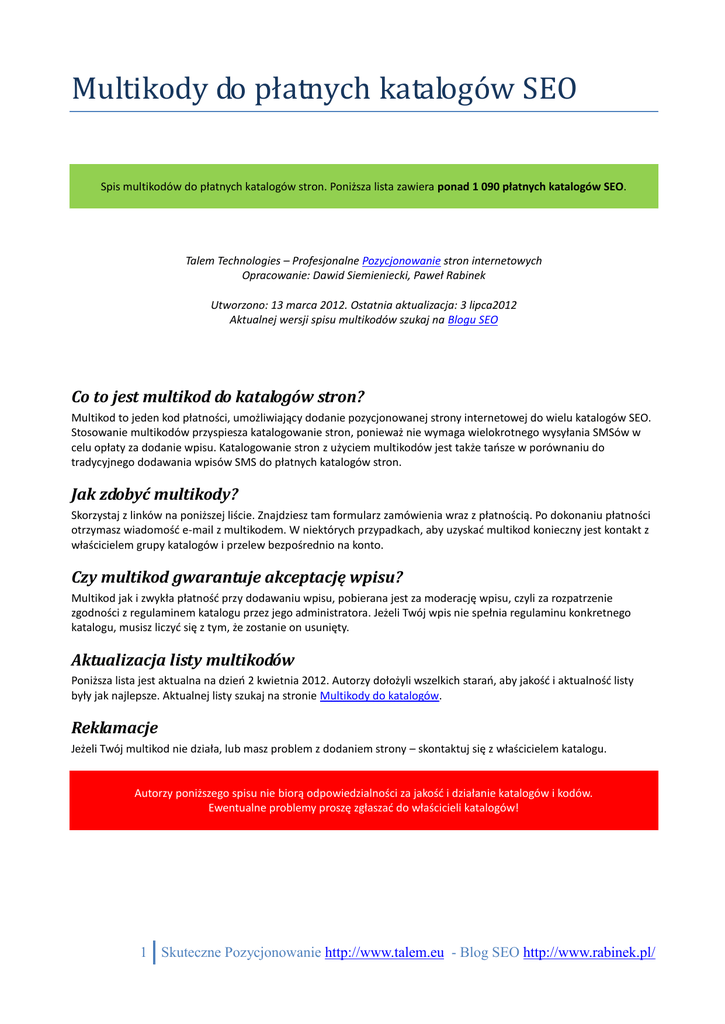 Multikody do płatnych katalogów SEO Spis multikodów do płatnych katalogów stron. Poniższa lista zawiera ponad 1 090 płatnych katalogów SEO. Talem Technologies – Profesjonalne Pozycjonowanie stron internetowych Opracowanie: Dawid Siemieniecki, Paweł Rabinek Utworzono: 13 marca 2012. Ostatnia aktualizacja: 3 lipca2012 Aktualnej wersji spisu multikodów szukaj na Blogu SEO Co to jest multikod do katalogów stron? Multikod to jeden kod płatności, umożliwiający dodanie pozycjonowanej strony internetowej do wielu katalogów SEO. Stosowanie multikodów przyspiesza katalogowanie stron, ponieważ nie wymaga wielokrotnego wysyłania SMSów w celu opłaty za dodanie wpisu. Katalogowanie stron z użyciem multikodów jest także tańsze w porównaniu do tradycyjnego dodawania wpisów SMS do płatnych katalogów stron. Jak zdobyć multikody? Skorzystaj z linków na poniższej liście. Znajdziesz tam formularz zamówienia wraz z płatnością. Po dokonaniu płatności otrzymasz wiadomość e-mail z multikodem. W niektórych przypadkach, aby uzyskać multikod konieczny jest kontakt z właścicielem grupy katalogów i przelew bezpośrednio na konto. Czy multikod gwarantuje akceptację wpisu? Multikod jak i zwykła płatność przy dodawaniu wpisu, pobierana jest za moderację wpisu, czyli za rozpatrzenie zgodności z regulaminem katalogu przez jego administratora. Jeżeli Twój wpis nie spełnia regulaminu konkretnego katalogu, musisz liczyć się z tym, że zostanie on usunięty. Aktualizacja listy multikodów Poniższa lista jest aktualna na dzień 2 kwietnia 2012. Autorzy dołożyli wszelkich starań, aby jakość i aktualność listy były jak najlepsze. Aktualnej listy szukaj na stronie Multikody do katalogów. Reklamacje Jeżeli Twój multikod nie działa, lub masz problem z dodaniem strony – skontaktuj się z właścicielem katalogu. Autorzy poniższego spisu nie biorą odpowiedzialności za jakość i działanie katalogów i kodów. Ewentualne problemy proszę zgłaszać do właścicieli katalogów! 1 Skuteczne Pozycjonowanie http://www.talem.eu - Blog SEO http://www.rabinek.pl/ Lista Multikodów Multikody Katalogi [szt] Cena [brutto] SEOKatalogi Kulfiego http://www.katalogi.clpik-studio.com 131 123 zł SEOKatalogi Generała (Pułkownika) http://www.katalogi.intelekt.net.pl 29 25 zł SEOKatalogi Reinera http://www.allemo.pl/ostatnie-wpisy 30 25 zł Multikody neonex http://allegro.pl/listing.php/user?us_id=12353389 200 49 zł SEOKatalogi Pandha http://seopudelek.pl/katalogi/334 12 - SEOKatalogi Silverta http://www.katalogi.projekteo.pl 39 25 zł SEOKatalogi ELTO http://seokatalogielto.pl/seokatalogi 50 29 zł Grupa katalogów LinkFan http://katalogi.linkfan.pl 22 15 zł Grupa IXS http://katalogi.ixs.pl 45 20 zł Grupa moje-katalogi.pl http://www.moje-katalogi.pl 196 30 zł Katalogi Posejdon http://katalogi.posejdon.org 9 10 zł Grupa Multikod.pl http://multikod.pl 20 19,70 zł 2 Skuteczne Pozycjonowanie http://www.talem.eu - Blog SEO http://www.rabinek.pl/ Katalogi Computer Best http://katalogi.computerbest.pl 40 18 zł Katalogi Design Graf http://www.katalogi.designgraf.pl 27 8 zł Katalogi Treecoola http://www.listakatalogow.eu 49 10 zł Katalogi Polseo http://www.polseo.com/seokatalogi.html 25 25 zł Katalogi Avsh http://www.katalogistron.avsh.pl/kup-multikody.html 17 7 zł Katalogi MT Solutions http://allegro.pl/listing.php/user?us_id=22717019 - - Grupa Dir Promo http://allegro.pl/listing.php/user?us_id=22496211 - - Grupa webks.pl http://katalogi.webks.pl/ 25 10 zł Grupa Remedia http://www.remedia.pl/seo-katalogi 124 40 zł Grupa Netbest http://listakatalogow.com.pl/ 27 15 zł Grupa Zbyszka http://www.spiskatalogow.reklamowa-agencja.pl/ 25 5 zł Grupa Katseo http://katseo.eu/ 12 20 zł Grupa Multikod.org http://www.multikod.org/ 18 50 zł 3 Skuteczne Pozycjonowanie http://www.talem.eu - Blog SEO http://www.rabinek.pl/ Sprawdź także: - Seoptimer.com - darmowe narzędzie do audytu SEO - Profesjonalny audyt SEO 4 Skuteczne Pozycjonowanie http://www.talem.eu - Blog SEO http://www.rabinek.pl/