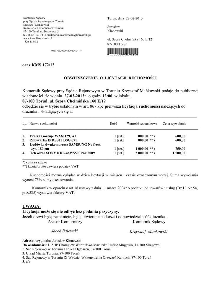 Komornik Sądowy przy Sądzie Rejonowym w Toruniu Krzysztof Mańkowski Kancelaria Komornicza w Toruniu 87-100 Toruń ul. Dworcowa 5 tel. 56 661 60 74 e-mail: [email protected] www.torun8komornik.pl Km 186/12 #MN *0020000167040*/0419/ Toruń, dnia 22-02-2013 Jarosław Klonowski ul. Szosa Chełmińska 160 E/12 87-100 Toruń *0020000167040* oraz KMS 172/12 OBWIESZCZENIE O LICYTACJI RUCHOMOŚCI Komornik Sądowy przy Sądzie Rejonowym w Toruniu Krzysztof Mańkowski podaje do publicznej wiadomości, że w dniu 27-03-2013r. o godz. 12:00 w lokalu: 87-100 Toruń, ul. Szosa Chełmińska 160 E/12 odbędzie się w trybie ustalonym w art. 867 kpc pierwsza licytacja ruchomości należących do dłużnika i składających się z: ________________________________________________________________________________________________ Lp. Nazwa ruchomości Ilość Wartość szacunkowa Cena wywołania _________________________________________________________________________________________________ 1. 2. 3. 4. Pralka Gorenje WA60129, A+ Zmywarka INDESIT DSG 051 Lodówka dwukomorowa SAMSUNG No frost, wys. 180 cm Telewizor SONY KDL-46W5500 rok 2009 1 [szt.] 1 [szt.] 800,00 **) 800,00 **) 600,00 600,00 1 [szt.] 1 [szt.] 1 000,00 **) 2 000,00 **) 750,00 1 500,00 _______________________________________________________________________________________________________________________ *) cena za sztukę **) kwota brutto zawiera podatek VAT Ruchomości można oglądać w dzień licytacji w miejscu i czasie oznaczonym wyżej. Suma wywołania wynosi 75% sumy oszacowania. Komornik w oparciu o art.18 ustawy z dnia 11 marca 2004r o podatku od towarów i usług (Dz.U. Nr 54, poz.535) wystawia faktury VAT. UWAGA: Licytacja może się nie odbyć bez podania przyczyny. Jeżeli drzwi będą zamknięte, będą otwierane na koszt i odpowiedzialność dłużnika. Asesor Komorniczy Komornik Sądowy Jacek Balewski Krzysztof Mańkowski Adresat oryginału: Jarosław Klonowski Do wiadomości: 1. ZHP Chorągiew Warmińsko-Mazurska Hufiec Mrągowo, 11-700 Mrągowo 2. Sąd Rejonowy w Toruniu Tablica Ogłoszeń, 87-100 Toruń 3. Urząd Miasta Torunia, 87-100 Toruń 4. Sąd Rejonowy w Toruniu IX Wydział Wykonywania Orzeczeń Karnych, 87-100 Toruń 5. a/a