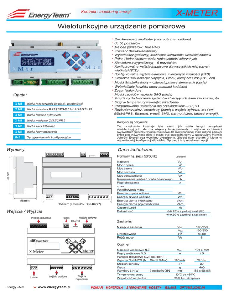 X-METER Kontrola i monitoring energii Wielofunkcyjne urządzenie pomiarowe Opcje: X M1 Moduł rozszerzenia pamięci I komunikacji X M2 Moduł adaptera RS232/RS485 lub USB/RS485 X M3 Moduł 8 wejść cyfrowych X M4 Moduł modemu GSM/GPRS X M5 Moduł sieci Ethernet X M6 Moduł Harmonicznych Es3 Oprogramowanie konfiguracyjne Dwukierunowy analizator (moc pobrana i oddana) do 50 pomiarów Metoda pomiarów: True RMS Pomiar cztero-kwadrantowy Wyświetlacz graficzny, możliwość ustawienia wielkości znaków Pełne i jednoznaczne wskazania wartości mierzonych Klawiatura z sygnalizacją – 6 przycisków Konfigurowalne wyjścia impulsowe dla wszystkich mierzonych wielkości (STD) Konfigurowalne wyjścia alarmowe mierzonych wielkości (STD) Graficzna wizualizacja: Napięcia, Prądu, Mocy oraz cos (z 3 dni) Moduł Strażnika Mocy – czterostopniowe sterowanie (opcja) Wyświetlanie kosztów mocy pobranej i oddanej Zegar i kalendarz Moduł zapadów napięcia SAG (opcja) Przydatny do tworzenia systemów zbierających dane z liczników, itp. Czujnik temperatury wewnątrz urządzenia Programowalne ustawienia dla przekładników – CT, VT Rozbudowywalny i modułowy (pamięć, wejścia cyfrowe, modem GSM/GPRS, Ethernet, e-mail, SMS, harmoniczne, jakość energii). Korzyści są oczywiste: To urządzenie kosztuje tyle samo jak wiele innych urządzeń wielofunkcyjnych ale ma większą funkcjonalność i większe możliwości (wyświetlacz graficzny, wyjścia impulsowe dla mocy pobranej, małe zużycie pamięci przez przechowywane dane) i może być przekształcony w rzeczywisty miernik Jakości Energii bez wymiany urządzenia. Zbuduj swój system X-Meter w odpowiedniej konfiguracji dla siebie. Sprawdź listę możliwych opcji. Wymiary: Dane techniczne: 90 mm Pomiary na sieci 50/60Hz 58 mm 154 mm (9 modułów DIN 46277) Wejścia / Wyjścia Wejścia impulsowe Rs485 Wyjścia cyfrowe Ethernet Jednostki Napięcie VAC Moc czynna W Moc bierna VAr Moc pozorna VA Moc odkształcona VA Równoważna wartość prądu 3-fazowego A Prąd obciążenia A cos Współczynnik mocy Energia czynna oddana Wh Energia czynna pobrana Wh VArh Energia bierna indukcyjna Energia bierna pojemnościowa VArh Hz Częstotliwość Dokładność +/-0.25% z pełnej skali (U,I) +/-0.50% z pełnej skali (inne) Zasilanie: Napięcie zasilania Częstotliwość Pobór mocy VAC VDC Hz VA 100-250 100-350 50-60 5 VAC A 100 o 400 /5 CONF ANN Ogólne: Meter X‐Meter 230Vac Energy Team Wejścia prądowe www.energyteam.pl Wejścia napięciowe POMIAR Napięcia wejściowe N.3 Prądy wejściowe N.3 Wyjścia impulsowe N.2 (akt./bier.) Wyjścia OptoMOS (N.1 Min N.1Max) Stopień ochrony Waga Wymiary L H W 9 modułów DIN Temperatura pracy Wilgotność względna KONTROLA STEROWANIE KOSZTY 100 mA 24 VDC IP 20 g 400 mm 154 x 90 x58 -10°C do +55°C 95% bez skraplania BILANS OPTYMALIZACJA Kontrola i monitoring energii OPIS POŁĄCZEŃ POŁĄCZENIA WEJŚĆ / WYJŚĆ SZEREGOWYCH M3 M4 M5 M6 Wejścia prądowe Przewód max.: Wejścia napięciowe Przewód max.: Wyjścia cyfrowe Przewód max.: RS485 Przewód max.: Wejścia cyfrowe Przewód max.: 2 ø 2 mm (16AWG) 2 ø 2.5 mm (14AWG) 2 ø 2.5 mm (14AWG) 2 ø 0.75 mm (18AWG) 2 ø 0.75 mm (18AWG) Belden 9841 2 ø 0.75 mm (18AWG) POŁĄCZENIE: PÓŁPOŚREDNIE 3-FAZOWE +NEUTRALNY POŁĄCZENIE: PÓŁPOŚREDNIE 3-FAZOWE POŁĄCZENIE: POŚREDNIE 3-FAZOWE +NEUTRALNY LINE LOAD POŁĄCZENIE: POŚREDNIE 3- FAZOWE Energy Team www.energyteam.pl POMIAR LOAD M2 Zasilanie Przewód max.: Wejścia napięciowe ODBIORNIK Wejścia prądowe 230VAC M1 POŁĄCZENIE: PÓŁPOŚREDNIE 1-FAZOWE M3 SIEĆ M2 M4 COM +12 V WEJŚCIE 8 WEJŚCIE 7 WEJŚCIE 6 WEJŚCIE 5 WEJŚCIE 4 WEJŚCIE 3 WEJŚCIE 2 WEJŚCIE 1 M5 ZWORKA MUSI BYĆ ZAŁOŻONA TYLKO NA PIERWSZYM I OSTATNIM URZĄDZENIU W SZEREGU (RS485). USUNĄĆ Z POZOSTAŁYCH. LINE M6 Wyjścia cyfrowe Ethernet COM WYJŚCIE 4 WYJŚCIE 3 WYJŚCIE 2 WYJŚCIE 1 Rs485 Wejścia cyfrowe M1 X-METER KONTROLA STEROWANIE KOSZTY BILANS OPTYMALIZACJA X-METER Kontrola i monitoring energii OPCJE XM1 Moduł rozszerzenia pamięci i komunikacji (moduł wewnętrzny) Ta opcja jest niezbędna do komunikacji urządzenia z programem ES3. Pozwala ona na znaczne zwiększenie pojemności pamięci, dzięki czemu urządzenie może rejestrować wszystkie zmierzone wartości do 250 dni. (Czas uśredniania 15min). Dla następujących wartości: napięcie sieciowe i fazowe, 3-fazowy prąd sieciowy, 3-fazowa moc czynna, 3-fazowa moc bierna, 3-fazowy współczynnik mocy). Ponadto, przez aktywowanie portu komunikacji RS485 możliwa jest komunikacja szeregowa między urządzeniami X-METER oraz z komputerem PC przy wykorzystaniu modułu konwertera RS232 lub USB. XM2 ADAPTER RS232/RS485 lub USB/RS485 (moduł zewnętrzny) Konwerter sygnałów RS232/RS485 (zasilanie 230VAC, moduł 4DIN) – umożliwia podłączenie komputera PC (wyposażonego w port komunikacyjny RS232) do systemu X-METER. Dostępna jest również wersja USB/RS485. Galwanicznie odizolowanie od USB, zapewniają maksymalną ochronę. XM3 Moduł 8 wejść cyfrowych (moduł wewnętrzny) Moduł 8-u wejść cyfrowych z własnym zasilaniem (12VDC). Może być używany do pozyskania informacji, kontroli i przetwarzania innych mediów: gazu, wody, powietrza oraz innych czujników. Ponadto, możliwe jest przechowywanie informacji z różnych kanałów przez sprawdzanie zapisanych logów używając konkretnego oprogramowania (nie dołączony). Ta funkcja jest dostępna jeżeli opcja XM1 jest aktywna. XM4 Moduł GSM/GPRS (moduł wewnętrzny) Modem GSM/GPRS wewnątrz urządzenia X-METER pozwala na wysyłanie wiadomości e-mail i SMS związanych z warunkami wielkości mierzonych, alarmami, skutkami pomiarów modułu XM3 (moduł 8 wejść). Wykorzystując ten moduł możemy zdalnie konfigurować system oraz wysyłać dane na strony Web zabezpieczonego serwera. Ta funkcja jest dostępna jeżeli opcja XM1 jest aktywna. XM5 Moduł Ethernet (moduł wewnętrzny) Moduł Ethernet z gniazdem RJ-45 