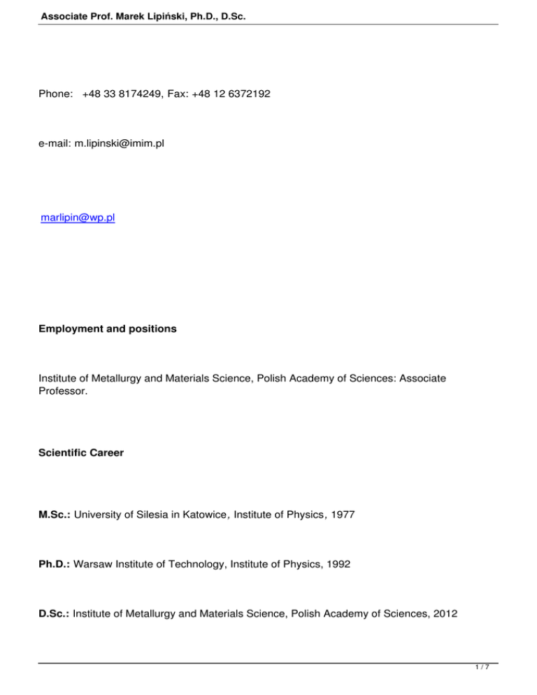 Associate Prof. Marek Lipiński, Ph.D., D.Sc.
