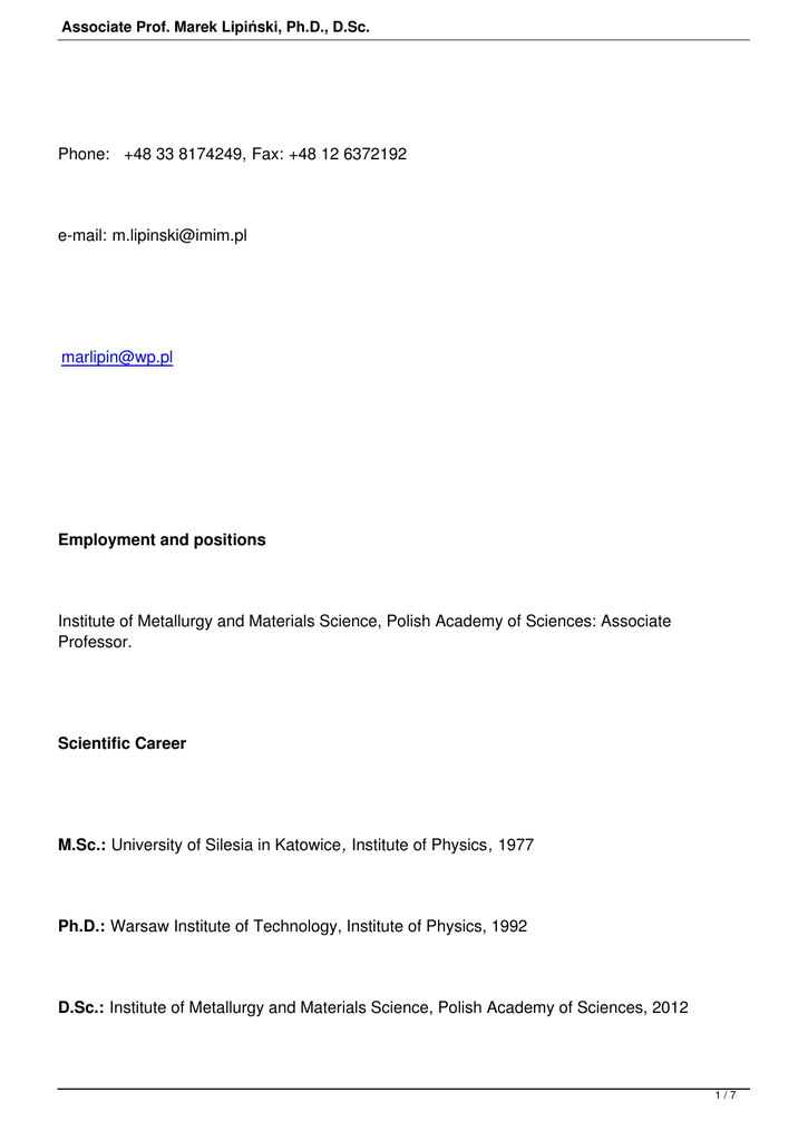 Associate Prof. Marek Lipiński, Ph.D., D.Sc. Phone: +48 33 8174249, Fax: +48 12 6372192 e-mail: [email protected] [email protected] Employment and positions Institute of Metallurgy and Materials Science, Polish Academy of Sciences: Associate Professor. Scientific Career M.Sc.: University of Silesia in Katowice, Institute of Physics, 1977 Ph.D.: Warsaw Institute of Technology, Institute of Physics, 1992 D.Sc.: Institute of Metallurgy and Materials Science, Polish Academy of Sciences, 2012 1/7 Associate Prof. Marek Lipiński, Ph.D., D.Sc. Scientific achievements 93 papers, among them: 44 papers in refereed journals and periodicals (26 of them citetd by the Institute for Scientific Information in Philadephia), 47 presentations during conferences, 2 books and chapters in books. The most relevant publications during last 5 years 1. M. Lipiński, Wpływ właściwości fizycznych warstw i obszarów przypowierzchniowych na parametry użytkowe krzemowego ogniwa słonecznego, monografia (Instytut Metalurgii i Inżynierii Materiałowej Polskiej Akademii Nauk, ISBN 978-83-60768-80-8) (2011) 1-188. 2. J. Ratajczak, K. Hejduk, M. Lipiński, T. Piotrowski, M. Płuska, A. Łaszcz, and A. Czerwinski, Study of silicon nanoparticles formation in silicon nitride, Solid State Phenomena, 186(2012) 66-69. 3. Z. Starowicz, M. Lipiński, K. Berent, R. Socha, K. Szczepanowicz , T. Kruk, Antireflection TiOx coating with plasmonic metal nanoparticles for silicon solar cells, Plasmonics, 8(2013) 41-43. 2/7 Associate Prof. Marek Lipiński, Ph.D., D.Sc. 4. M. Lipiński, T. Piotrowski, J. Ratajczak, K. Hejduk, B. Bierska-Piech, B. Jarząbek, Badania nansostruktur krzemowych w zastosowaniu do fotowoltaiki, Elektronika, 5(2013) 27-29 5. Z. Starowicz, M. Lipiński, K. Berent R. Socha, K. Szczepanowicz, T. Kruk, Antireflection TiOx Coating with Plasmonic Metal Nanoparticles for Silicon Solar Cells, Elektronika, 7(2013) 28-29 6. Z. Starowicz, M. Lipiński, R. P. Socha, K. Berent, G. Kulesza, P. Ozga, Photochemical silver nanoparticles deposition on sol-gel TiO for plasmonic properties utilization, Journal of sol-gel science and technology, 73(2015) 563-571. 7. M. Lipiński, G. Kulesza, Z. Starowicz, Obrazowanie luminescencyjne do charakteryzacji ogniw i modułów fotowoltaicznych, Elektronika, 8(2014) 52-54. Patents Patent no. 21397 for the invention:The method of crystalline silicon surface texturization, 27.01.2010. Prizes and awards 3/7 Associate Prof. Marek Lipiński, Ph.D., D.Sc. Siemens Special Award granted at the request of the Jury of 06.05.2013 for the habilitation thesis: " The influence of physical properties of the subsurface layers and areas on operational parameters of silicon solar cell ." Research Projects Projects from Ministry of Science and Higher Education Designing and production of functionally graded materials (Project No. PBZ-KBN 100/TO8-2003): Subject 1: Designing and technology elaboration of functionally graded materials for the application in fotonics and fuel cells, Task 2: Elaboration of technology of antireflection gradient coatings in silicon solar cells, IMMS PAS, task leader of task 2, 2004-2007 Neutron doped multicrystalline silicon applied for solar cells, (Project No. N508 04831/2569), IAE (Świerk), task leader, 2006-2008. The characterisation of the multicrystalline silicon modified with processes of gettering and passivation for the photoelectric cells applications, (Project No. N N515 088 433), participant, IET (Warsaw), 2007-2009 Elaboration of the passivation technology of crystallographic defects in polycrystalline silicon and silicon nano-particles creation by SiNx:H layers application to broaden spectral sensitivity of the photocells. (Project No. N N507 444234), IMMS PAS, supervisor, 2008-2010 4/7 Associate Prof. Marek Lipiński, Ph.D., D.Sc. Projects from National Centre for Science M. Lipiński-Investigation of influence of metal and semiconductor nanoparticles on opto-electronic properties of composite materials, Project funded under „OPUS", 2012/05/B/ST8/00087, IMIM PAS, supervisor, 2012-2016 Common research within the scientific network EKOENERGIA- New ecological and save technologies in energy production and conversion, IMP PAS, participant, 2006-2007 PV-TECH- Development of new technologies and research techniques for silicon solar cells, IMMS PAS, participant, 2008 International exchange programmes Application of macroporous silicon to silicon solar cells, Laboratoire de Chimie Metallurgique des Terres Rares, CNRS, Thiais, Francja, 2003-2005. Analyse et élaboration de couches de nitrure de silicium pour application photovoltaïques, Laboratoire Physique de la Matiere - I.N.S.A, Regional Project MIRA, Lyon, 2006 -2007 5/7 Associate Prof. Marek Lipiński, Ph.D., D.Sc. International projects Operational Programme Human Capital, co-financed by European Social Fund, Dissemination of Polish and world achievements in photovoltaics in the education process at high level (No. UDA-POKL.04.02.00-00-053/08-00), IMMS PAS, contractor, 2009-2010 Operational Programme Human Capital, co-financed by European Social Fund, Dissemination of Polish and world achievements in photovoltaics in the education process at high level - II Edition (No. UDA-POKL. 04.02.00-00-006/09-00), IMMS PAS, contractor, 2010-2011 Experience gained abroad French Government Scholarship: Laboratoire Physique du Solide et Energie Solaire, C.N.R.S, Valbonne, Laboratoire Physique de la Matiere, I.N.S.A, Lyon 1987-1988 (8 months) Laboratoire PHASE-CNRS, Strasbourg, Francja, 1992 (3 months) Some shorter visits: Laboratoire de Photoélectricité des Semiconducteurs, Univ.,Maresille, Francja, 1992 (2 weeks), Laboratoire PHASE- CNRS, Strasbourg, Francja, 1992 (2 weeks) Institut für Physikalische Elektronik, Universität Stuttgart, Stuttgart, Niemcy, 2007, (1 week) 6/7 Associate Prof. Marek Lipiński, Ph.D., D.Sc. Main scientific interest Solar cell device physics and technology, third generation photovoltaics, nanotec