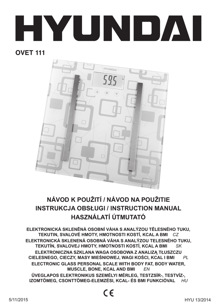 OVET 111 NÁVOD K POUŽITÍ / NÁVOD NA POUŽITIE INSTRUKCJA OBSŁUGI / INSTRUCTION MANUAL HASZNÁLATÍ ÚTMUTATÓ Elektronická skleněná osobní váha s analýzou tělesného tuku, tekutin, svalové hmoty, hmotnosti kostí, KCAL a BMI cz Elektronická sklenená osobná váha s analýzou telesného tuku, tekutín, svalovej hmoty, hmotnosti kostí, KCAL a BMI sk Elektroniczna szklana waga osobowa z analizą tłuszczu cielesnego, cieczy, masy mieśniowej, wagi kości, KCAL I BMI pl Electronic glass personal scale with body fat, body water, muscle, bone, KCAL aND BMI en Üveglapos elektronikus személyi mérleg, testzsír-, testvíz-, izomtömeg, csonttömeg-elemzési, KCAL- és BMI funkcióval hu 5/11/2015 HYU 13/2014 Vážený zákazníku, děkujeme Vám za zakoupení našeho produktu. Před uvedením tohoto přístroje do provozu si velmi pozorně přečtěte návod k obsluze a tento návod spolu se záručním listem, pokladním dokladem a podle možností i s obalem a vnitřním obsahem obalu dobře uschovejte. Všeobecné bezpečnostní pokyny • Používejte tento přístroj výlučně pro soukromou potřebu a pro stanovené účely. Není určen pro použití v lékařských zařízeních a komerční použití! • Chraňte ho před horkem, přímým slunečním zářením, vlhkostí (v žádném případě jej neponořujte do kapalin) a stykem s ostrými hranami. Nepoužívejte přístroj v případě, že máte vlhké ruce. Vyvarujte se styku s vodou. • Přístroj vypněte jestliže ho nebudete používat, nebo v případě poruchy. • Neopravujte přístroj vlastními silami, nýbrž vyhledejte autorizovaný servis. • Používejte jen originální příslušenství. • Respektujte, prosím, následující „Speciální bezpečnostní pokyny pro tento přístroj“. Speciální bezpečnostní pokyny pro tento přístroj • Přístroj používejte pouze v souladu s parametry uvedenými na štítku přístroje. • Přístroj nepokládejte na mokrá místa a vyvarujte váhu styku s vodou, může to poškodit elektroniku. • Povrch čistěte jen suchým hadříkem. Abyste předešli poškození přístroje, zabraňte styku přístroje s vodou a ani nepoužívejte čistící prostředky. • Váhu vždy používejte na tvrdém, rovném povrchu. NEPOUŽÍVEJTE ji na koberci. • NEPOUŽÍVEJTE váhu na mokré a kluzké podlaze. NESTOUPEJTE na okraj váhy. Měřící plocha váhy je kluzká v případě, že je mokrá. Udržujte ji v suchu! • Vždy se važte na stejném místě. Nerovná plocha může ovlivňovat údaje. • Vždy se važte bez oděvů, bez obuvi a před jídlem. Ideální čas pro vážení je hned po ránu. • Vaše váha zaokrouhluje naměřenou hodnotu nahoru nebo dolů k nebližším s rozdělením 100g. • Pokud nebudete váhu delší dobu používat, vyjměte baterie. • Mějte na zřeteli, že údaje, které byly zjištěny na této váze, jsou pouze přibližné a nepřesné ve srovnání s výsledky skutečných medicínských analýz. Přesné určení biometrických charakteristik může určit pouze lékaž pomocí medicínských metod. • Udržujte baterie a váhy mimo dosah dětí a nesvéprávných osob. Osoba, která spolkne baterie, musí okamžitě vyhledat lékařskou pomoc. • Nepoužívejte v průběhu těhotenství. • Nepřetěžujte spotřebič větší váhou, než je maximální kapacita váhy! Zabráníte tím poškození přístroje. • Váhu nepoužívejte, pokud používáte některé z následujících zařízení: kardiostimulátor, elektrokardiograf a/nebo jiné zdravotní zařízení implantované do těla nebo používané jako podpora. • Naměřený tělesný tuk a objem vody slouží pouze pro reference. Způsob dosažení ideální úrovně tělesného tuku nebo dietu vždy konzultujte s lékařem. • Pro zajištění přesnosti měření NEPOUŽÍVEJTE váhu v prostředí se silným elektromagnetickým polem. • NEPOUŽÍVEJTE váhu na místech se silnými otřesy, neskákejte na ní. Při měření stůjte na váze klidně. • Přístroj nepouštějte z výšky na zem, pokládejte. Vyvaruj přístroj nárazům a nešetrným zacházením. Váha obsahuje citlivé přesné měřící zařízení. • Děti a osoby se sníženými fyzickými, smyslovými či mentálními schopnostmi mohou váhu obsluhovat, pokud jsou pod dozorem. • Na děti by se mělo dohlížet, aby se zajistilo, že si nebudou se spotřebičem hrát. 2 / 35 CZ Popis ovládacích prvků P2 P1 P6 P6 P3 P5 P1. Jednotka váhy P2. Displej P3. Skleněná plocha P4. Měřící elektrody P5. Tlačítko SET - zapnutí a nastavování P6. Tlačítka UP a DOWN - tlačítka pro výběr P4 Zobrazované údaje na displeji P1 ...P0 číslo paměti muž žena Fat Underfat Healthy Overfat Obese TBW KCAL obsah svalové hmoty (%) obsah hmotnosti kostí (%) obsah tělesného tuku (%) podváha zdravý nadváha obezita obsah vody v těle (%) optimální energetická spotřeba Specifikace Rozsah měření: Měřící rozdělení při měření hmotnosti: Měřící rozdělení při měření vody: Měřící rozdělení při měření tuku: Rozsah věku měřené osoby: Jednoty výšky: Rozsah výšky osob: 180 kg (kilogram), 28 st (stone), 396 lb (libra) 0,1 kg, 0,2 lb, 1/4 st 0,1 % 0,1 % 6 - 100 let cm / ft-in 80 - 220 cm 3 / 35 Pokyny k použití Než začnete • Odstraňte izolační pásek z kontaktů baterie před prvním použitím. • Aktivujte váhu, vyčkejte až se na váze objeví „0.0“. Poté zvolte jednotku vážení (KG/ST/LB) pomocí tlačítek UP a DOWN. • Umístěte váhu na hladký a rovný povrch pro zajištění přesnosti. Měření tělesné hmotnosti Váhu můžete používat jen pro měření hmotnosti. Jde o základní režim a nebude prováděna analýza ostatních hodnot. 1) Postavte sa na váhu, tím se váha automaticky zapne. Nehýbejte sa a počkejte na zvážení. Potom sa na displeji zobrazí naměřená hmotnost a z