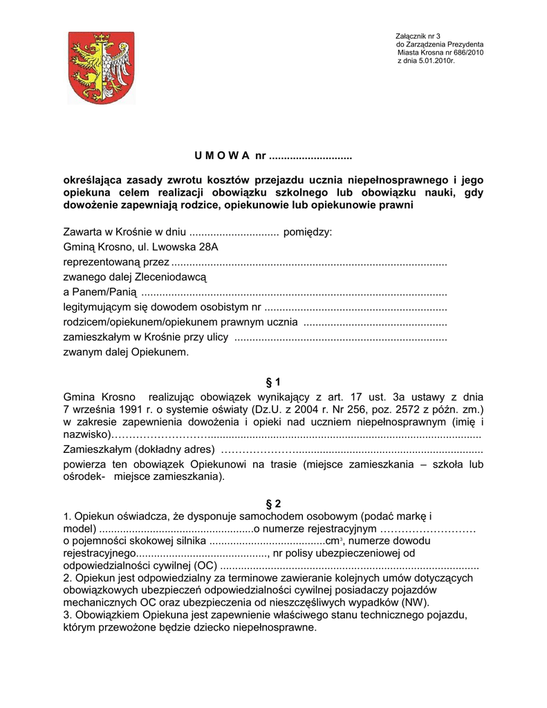 Załącznik nr 3 do Zarządzenia Prezydenta Miasta Krosna nr 686/2010 z dnia 5.01.2010r. U M O W A nr ............................ określająca zasady zwrotu kosztów przejazdu ucznia niepełnosprawnego i jego opiekuna celem realizacji obowiązku szkolnego lub obowiązku nauki, gdy dowożenie zapewniają rodzice, opiekunowie lub opiekunowie prawni Zawarta w Krośnie w dniu .............................. pomiędzy: Gminą Krosno, ul. Lwowska 28A reprezentowaną przez ............................................................................................ zwanego dalej Zleceniodawcą a Panem/Panią ...................................................................................................... legitymującym się dowodem osobistym nr ............................................................. rodzicem/opiekunem/opiekunem prawnym ucznia ................................................ zamieszkałym w Krośnie przy ulicy ....................................................................... zwanym dalej Opiekunem. §1 Gmina Krosno realizując obowiązek wynikający z art. 17 ust. 3a ustawy z dnia 7 września 1991 r. o systemie oświaty (Dz.U. z 2004 r. Nr 256, poz. 2572 z późn. zm.) w zakresie zapewnienia dowożenia i opieki nad uczniem niepełnosprawnym (imię i nazwisko)………………………............................................................................................ Zamieszkałym (dokładny adres) …………………............................................................... powierza ten obowiązek Opiekunowi na trasie (miejsce zamieszkania – szkoła lub ośrodek- miejsce zamieszkania). §2 1. Opiekun oświadcza, że dysponuje samochodem osobowym (podać markę i model) ....................................................o numerze rejestracyjnym ……………………… o pojemności skokowej silnika .......................................cm 3, numerze dowodu rejestracyjnego............................................, nr polisy ubezpieczeniowej od odpowiedzialności cywilnej (OC) ....................................................................................... 2. Opiekun jest odpowiedzialny za terminowe zawieranie kolejnych umów dotyczących obowiązkowych ubezpieczeń odpowiedzialności cywilnej posiadaczy pojazdów mechanicznych OC oraz ubezpieczenia od nieszczęśliwych wypadków (NW). 3. Obowiązkiem Opiekuna jest zapewnienie właściwego stanu technicznego pojazdu, którym przewożone będzie dziecko niepełnosprawne. §3 1. Wysokość miesięcznej kwoty zwrotu kosztów przejazdu ucznia obliczana jest jako iloczyn: podwójnej odległości z miejsca zamieszkania do szkoły lub ośrodka, stawki za kilometr przebiegu i liczby dni obecności ucznia w szkole lub ośrodku w miesiącu rozliczeniowym. 2. Wysokość stawki za kilometr przebiegu pojazdu została określona na podstawie Zarządzenia Prezydenta Miasta Krosna Nr 34/07 z dnia 8 luty 2007r. w sprawie ustalenia wysokości stawki za 1 kilometr przebiegu za przejazd w podróży służbowej na obszarze kraju, odbywanej samochodem osobowym nie będącym własnością pracodawcy*: a) w przypadku samochodu o pojemności skokowej silnika do 900 cm 3 – 0,25 zł, b) w przypadku samochodu o pojemności skokowej silnika powyżej 900 cm3 – 0,37 zł. 3. Odległość z domu dziecka do szkoły(ośrodka) wynosi….............km. (najkrótsza droga od miejsca zamieszkania do szkoły lub ośrodka). §5 Opiekun ucznia niepełnosprawnego składa w Wydziale Edukacji, Rachunek o zwrot kosztów przejazdu samochodem osobowym ucznia niepełnosprawnego oraz jego rodzica/opiekuna/opiekuna prawnego do szkoły lub ośrodka wraz z poświadczeniem przez dyrektora szkoły (ośrodka) lub uprawnionej przez niego osoby ilości dni obecności dziecka w szkole(ośrodku), którego wzór stanowi załącznik do niniejszej umowy, nie później niż do 10 dnia miesiąca następującego po miesiącu, w którym realizowano dowóz ucznia. §6 Przekazanie na rachunek bankowy Opiekuna (nazwa banku)……………………………… (nr rachunku) .…................................................................................................................ środków finansowych z tytułu zwrotu kosztów przejazdu ucznia, o którym mowa w § 1 następuje nie później niż po 14 dniach od złożenia rachunku i poświadczenia ze szkoły o frekwencji ucznia w danym miesiącu. §7 Zwrot kosztów przejazdu nie przysługuje za dni nieobecności ucznia w szkole lub ośrodku. §8 Kwota o której mowa w § 3 ust. 1 nie podlega opodatkowaniu na podstawie art. 21 ust. 1 pkt 40c ustawy z dnia 26 lipca 1991 r. o podatku dochodowym od osób fizycznych (Dz.U. z 2000 r. Nr 14, poz. 176 z późn. zm.) §9 Umowa zostaje zawarta na czas określony od dnia ........................................... do dnia ................................ tj. czas trwania zajęć szkolnych w roku szkolnym ............... Każdej ze stron przysługuje prawo jej rozwiązania za uprzednim dwutygodniowym wypowiedzeniem, które kończyć się będzie ostatniego dnia miesiąca. § 10 Umowę sporządzono w dwóch jednobrzmiących egzemplarzach, po jednym dla każdej ze stron. § 11 Wszelkie zmiany wymagają formy pisemnej pod rygorem nieważności. § 12 Spory wynikające z realizacji niniejszej umowy rozstrzygane będą w formie wzajemnych negocjacji. § 13 W sprawach nie unormowanych niniejszą umową mają zastosowanie przepisy Kodeksu Cywilnego i ustawy o systemie oświaty. ............................................. ( Podpis Opiekuna) ............................................. (Podpis Zleceniodawcy) * wysokość stawki za 1 kilometr może się zmienić, w przypadku zmiany Zarządzenia Prezydenta Miasta Krosna Załącznik do umowy ......................................................................... Nazwisko i imię rodzica, opiekuna, opiekuna prawnego ......................................................................... adres ...........