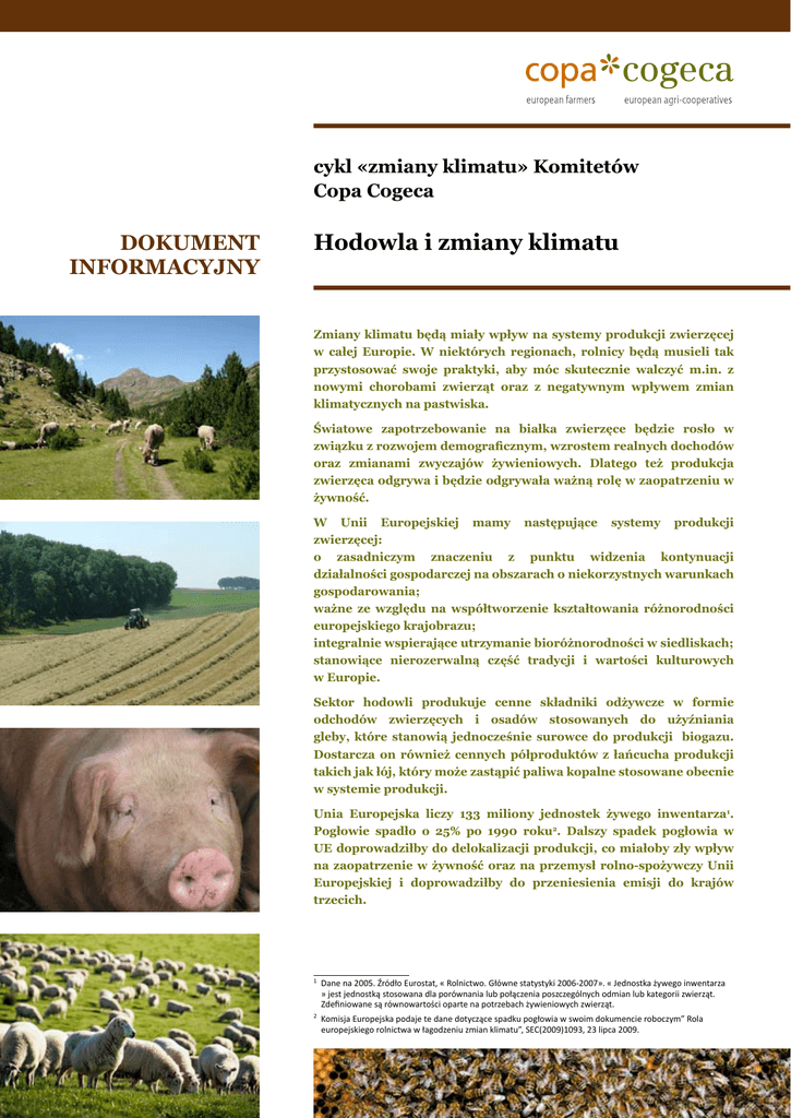 cykl «zmiany klimatu» Komitetów Copa Cogeca DOKUMENT INFORMACYJNY Hodowla i zmiany klimatu Zmiany klimatu będą miały wpływ na systemy produkcji zwierzęcej w całej Europie. W niektórych regionach, rolnicy będą musieli tak przystosować swoje praktyki, aby móc skutecznie walczyć m.in. z nowymi chorobami zwierząt oraz z negatywnym wpływem zmian klimatycznych na pastwiska. Światowe zapotrzebowanie na białka zwierzęce będzie rosło w związku z rozwojem demograficznym, wzrostem realnych dochodów oraz zmianami zwyczajów żywieniowych. Dlatego też produkcja zwierzęca odgrywa i będzie odgrywała ważną rolę w zaopatrzeniu w żywność. W Unii Europejskiej mamy następujące systemy produkcji zwierzęcej: o zasadniczym znaczeniu z punktu widzenia kontynuacji działalności gospodarczej na obszarach o niekorzystnych warunkach gospodarowania; ważne ze względu na współtworzenie kształtowania różnorodności europejskiego krajobrazu; integralnie wspierające utrzymanie bioróżnorodności w siedliskach; stanowiące nierozerwalną część tradycji i wartości kulturowych w Europie. Sektor hodowli produkuje cenne składniki odżywcze w formie odchodów zwierzęcych i osadów stosowanych do użyźniania gleby, które stanowią jednocześnie surowce do produkcji biogazu. Dostarcza on również cennych półproduktów z łańcucha produkcji takich jak łój, który może zastąpić paliwa kopalne stosowane obecnie w systemie produkcji. Unia Europejska liczy 133 miliony jednostek żywego inwentarza1. Pogłowie spadło o 25% po 1990 roku2. Dalszy spadek pogłowia w UE doprowadziłby do delokalizacji produkcji, co miałoby zły wpływ na zaopatrzenie w żywność oraz na przemysł rolno-spożywczy Unii Europejskiej i doprowadziłby do przeniesienia emisji do krajów trzecich. 1 Dane na 2005. Źródło Eurostat, « Rolnictwo. Główne statystyki 2006-2007». « Jednostka żywego inwentarza » jest jednostką stosowana dla porównania lub połączenia poszczególnych odmian lub kategorii zwierząt. Zdefiniowane są równowartości oparte na potrzebach żywieniowych zwierząt. 2 Komisja Europejska podaje te dane dotyczące spadku pogłowia w swoim dokumencie roboczym” Rola europejskiego rolnictwa w łagodzeniu zmian klimatu”, SEC(2009)1093, 23 lipca 2009. Wykres 1: wentylacja całości emisji gazów cieplarnianych i udział rolnictwa w UE-27 w 2007 roku (emisje wliczane w hodowlę) 0,2% 8,5% 2,8% 9,2% 31% 48% 79,3% 11% Stosowanie rozpuszczalników i innych produktów 10% Procesy przemysłowe CH4 pochodzący z fermetacji jelitowej Odpady CH4 pochodzący z zarządzania odhodami hodowli Rolnictwo N2O pochodzący z zarządzania odchodami Konsumpcja energii (włącznie z transportem) N2O pochodzący z ziemi rolnych Specyfika emisji gazów cieplarnianych sektora hodowli Profil emisji gazów cieplarnianych (GHG) produkcji zwierzęcej różni się znacznie od profilu innych sektorów, takich jak transport. Emisje pochodzą z naturalnie zmiennych procesów biologicznych, które są bardzo liczne i złożone. Możliwości zarządzania takimi złożonymi emisjami uzależnionymi od procesów biologicznych są ograniczone. Emisje metanu (CH4) generowane są przez fermentację jelitową3 przeżuwaczy i przez odchody zwierzęce, podczas gdy rozpylanie nawozów, ekologicznych lub nie, może prowadzić do emisji podtlenku azotu (N2O). Wpływ oraz opcje redukcji emisji, poprzez środki łagodzenia, tych dwóch gazów cieplarnianych, odpowiednio 21 i 310 razy silniejszych niż CO2 w zakresie ocieplania się klimatu4, stanowi bardzo duże wyzwanie dla rolnictwa. Źródło: ekstrapolacja na podstawie danych z raportu technicznego 4/2009 AEE ●● W 2007 roku rolnictwo było odpowiedzialne za 9,2% całkowitej emisji gazów cieplarnianych w UE-27 w (wykres 1) powodując uwolnienie ok. 462 Mt wyrażona w ekwiwalencie CO2. Wykres 2: proporcja emisji dla poszczególnych gazów cieplarnianych w UE-27 w 2006 roku (z wyłączeniem LULUCF) 100% 82,8% 80% ●● Rolnictwo przyczynia się do całkowitej unijnej emisji gazów cieplarnianych w wymiarze 4,2% metanu i 5% (wykres 2). 60% 40% 20% 0% 0% CO2 8,2% 4,2% 7,6% 5,0% CH4 1,6% Postęp sektora w redukcji emisji gazów cieplarnianych. 0% ●● Gazy cieplarniane emitowane przez rolnictwo (włącznie z hodowlą) spadły o 117 Mt5 w ekwiwalencie CO2, co stanowi redukcję o 20% w latach 1990 - 2007 w UE-27 (wykres 3)6. N2O gaz fluorowany Rozłożenie emisji gazów cieplarnianych w UE-27 w 2006 roku Proporcja emisji gazów cieplarnianych pochodzenia rolnego ●● W latach 1999 - 2007, emisje już znacznie spadły dzięki: Źródło: ekstrapolacja w oparciu o dane AEE (bilans emisji gazów cieplarnianych państw członkowskich UE) o skutecznemu wykorzystaniu nawozów i odchodów zwierzęcych (21%), o redukcji pogłowia (25%), o ostatnim reformom strukturalnym WPR (zasada wzajemnej zgodności, płatności bezpośrednie, środki rozwoju obszarów wiejskich), Wykres 3: zmiany, na sektor, emisje gazów cieplarnianych w UE-27, 1990-2006 Emisje ogolem Energia (poza sektorem transportu) -7,7 % Transport Procesy przemyslowe Rolnictwo o progresywnemu środowiskowej. -11,2 % 27,4 % polityki rolnej -20,1 % 79,8 % -60%-40%-20% 0% 20% 40% 60% 80%100% Źródło: AEE, tendencje emisji gazów cieplarnianych - ewaluacja (marzec 2009) i ●● Utrzymanie systemów opartych na trwałych użytkach zielonych pozwala na uniknięcie opuszczania ziemi; powierzchnie te pełnią rolę biotopów obniżających zawartość dwutlenku węgla. Trwałe łąki stanowią 31% całkowitej powierzchni rolnej UE-27, so stanowi wzrost o 5,9% w ciągu ostatnich lat7. -12,8 % Odpady -31,5 % Lotnictwo i miedzynarodowy trasport morski wdrażaniu 3 Proces pozwalający przeżuwaczom na trawienie celulozy. 4 Aby porównać gazy cieplarniane pod względem ich potencjału ocieplania klimatu, są one zaksięgowane jako « ekwiwalent CO2 ». Oznacza to, że emisje miliona ton metrycznych metanu lub podtlenk