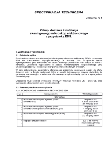 SPECYFIKACJA TECHNICZNA Załącznik nr 1 Zakup, dostawa i instalacja skaningowego mikroskop elektronowego z przystawką EDS. 1. WYMAGANIA TECHNICZNE 1.1. Założenia ogólne Przedmiotem zakupu oraz dostawy jest skaningowy mikroskop elektronowy SEM z przystawką EDS dla Laboratorium Międzyuczelnianego w Stalowej Woli. Urządzenie będzie wykorzystywane, jako stanowisko do badań morfologii powierzchni ciał stałych w mikro- i nanoskali. Dodatkowe wyposażenie w postaci mikroanalizatora rentgenowskiego EDS umożliwia jakościowy i ilościowy pomiar pierwiastków w badanych próbkach. W celu potwierdzenia, parametrów oferowanego przedmiotu zamówienia należy do oferty dołączyć opisy w formie papierowej, które w sposób jednoznaczny pozwolą stwierdzić, że parametry eksploatacyjno – techniczne oferowanego urządzenia będą zgodne z wymaganiami Zamawiającego. Urządzenie musi spełniać wymagania dyrektywy "Nowego Podejścia UE” - znak CE, oraz wymagania odpowiednich norm przedmiotowych. 1.2. Parametry techniczne urządzenia 1.2.1. PODSTAWOWE WYMAGANIA TECHNICZNE SEM Lp. Nazwa parametru Mikroskop 1 Rozdzielczość w trybie wysokiej próżni . (detektor SE) 2 Rozdzielczość w trybie wysokiej próżni . (detektor wewnątrz soczewki obiektywu) SE 3 Rozdzielczość w trybie zmiennej próżni (BSE) . 4 Napięcie przyspieszające . Wielkość parametru nie gorsza niż 1.2 nm przy 30 kV 2.5 nm przy 3 kV nie gorsza niż 1 nm przy 30 kV 2nm przy 3 kV nie gorsza niż 2.0 nm przy 30 kV 200 V do 30 kV z możliwością płynnej regulacji Lp. Nazwa parametru 5 Prąd próbki . Wielkość parametru nie gorszy niż 1pA do 200 nA 6 Powiększenia . od 2 do 1.000.000 razy 7 Komora mikroskopu . min. 12 wolnych portów do zainstalowania detektorów i urządzeń Stolik mikroskopowy 8 Zautomatyzowany we wszystkich osiach . X: minimum. 130 mm TAK 9 Detektor SE z kryształem YAG . TAK 1 BSE z kryształem YAG. Detektor na ruchomym ramieniu 0 pozwalającym na wysunięcie detektora z komory. Detektor . wyposażony w podwójny scyntylator. TAK 1 Detektor SE do pracy w trybie zmiennej próżni 1 . TAK 1 Detektor wewnątrz soczewki obiektywu przeznaczony do 2 obrazowania SE . TAK 1 Detektor wewnątrz soczewki obiektywu przeznaczony do 3 obrazowania BSE . TAK 1 Detektor EDS, typu SDD (silicon drift detector), bez 4 chłodzenia ciekłym azotem . TAK 1 Minimalna powierzchnia aktywna okienka detektora 5 . ≥ 70 mm2, Y: minimum. 130 mm Z: minimum. 100 mm Pochylanie: minimum od -30 o do +90o Rotacja: 3600 Detektory 1 Minimalna, gwarantowana rozdzielczość detektora dla linii 6 Mn K-alfa . 127 eV (zgodnie z ISO 15632 2012) Lp. Nazwa parametru Wielkość parametru 1 Minimalna, gwarantowana rozdzielczość detektora dla linii 7 F K-alfa . 64 eV (zgodnie z ISO 15632 2012) 1 Minimalna, gwarantowana rozdzielczość detektora dla linii 8 C K-alfa: . 56 eV (zgodnie z ISO 15632 2012) 1 Gwarantowana stabilność detektora: zmiana rozdzielczości i 9 pozycji piku mniejsza niż 1 eV przez mianie zliczeń od 1000 . do 100 000 zliczeń na sekundę. TAK 2 Detektor EDS, typu SDD (silicon drift detector), bez 0 chłodzenia ciekłym azotem, minimalna powierzchnia 2 . aktywna okienka detektora ≥ 10 mm TAK Optyka mikroskopu 2 Soczewki elektronowe pozwalające na płynne przełączanie 1 się między trybami pracy umożliwiającymi: . - obserwacje ze zwiększoną głębią ostrości TAK 2 2 . TAK 2 3 . - obserwacje z powiększonym polem widzenia - pochylanie wiązki elektronowej (osi skanowania) o zadany (regulowany) kąt w celu uzyskiwania obrazów stereoskopowych wykorzystywanych do rekonstrukcji 3D obserwowanych powierzchni. Kolumna mikroskopu nie zawiera żadnych mechanicznych elementów wymagających centrowania. Efektywna średnica wiązki elektronowej jest regulowana elektromagnetycznie w sposób ciągły przy pomocy dedykowanej soczewki elektronowej. Automatyczne centrowanie wszystkich elementów optyki elektronowej. TAK Dodatkowe wyposażenie mikroskopu 2 Kamera podglądu komory 4 . TAK 2 Układ pomiaru prądu próbki 5 . TAK 2 Układ wykrywania kontaktu próbki z elementami komory, 6 który ostrzega sygnałem dźwiękowym oraz blokuje dalszy . ruch stolika mikroskopu. TAK 2 Układ wyhamowywania wiązki elektronowej (Beam 7 Deceleration), który umożliwia uzyskiwanie . wysokorozdzielczych obrazów przy niskich energiach wiązki TAK padającej na próbki. Lp. Nazwa parametru Wielkość parametru 2 Urządzenie typu Plasma Cleaner zintegrowane z 8 mikroskopem skaningowym przeznaczone do czyszczenia . komory i powierzchni próbek. TAK 2 Pneumatyczny układ zawieszenia kolumny 9 . TAK System próżniowy poniżej 9×10-3 Pa 3 Próżnia robocza 0 . 3 Tryb zmiennej próżni 1 . w zakresie co najmniej od 7 do 500 Pa. 3 Brak chłodzenia cieczowego w układzie próżniowym i 2 elektronooptycznym. . TAK 3 Pompa turbomolekularną, 3 pompa wstępną bezolejową typu scroll, . dwie pompy jonowe. TAK Obsługa mikroskopu 3 Zapis obrazów: 8192×8192 pikseli w postaci plików bmp, 4 tiff, JPG, jpeg2000, GIF, PNG. . Możliwość zapisu z rozdzielczością 16384×16384 pikseli , TAK 3 Komputer PC w konfiguracji ZALECANEJ przez producenta 5 z dwoma monitorami LCD o przekątnej minimum 24 cale, . panel sterujący TAK 16 bit. Oprogramowanie 3 Oprogramowanie mikroskopu umożliwiające pomiary i 6 przetwarzanie obrazów. . 3 Podstawowe oprogramowanie biurowe: arkusz kalkulacyjny 7 i edytor tekstu, z możliwością pełnej edycji dokumentów w . formatach .xlsx i .docx, z możliwością bezpośredniego TAK TAK w języku polskim zapisu do formatu .pdf 3 Możliwość nakładania na siebie sygnałów z dwóch 8 detektorów z możliwością określenia udziału sygnału z . poszczególnych detektorów w obrazie składanym. TAK Lp. Nazwa parametru Wielkość parametru 3 Oprogramowanie detektora EDS powinno umożliwić: 9 • jakościową i ilościową analizę w punkcie oraz dowolmnym obszarze nieregularnym zdefiniowanym . TAK 4 0 . TAK 4 1 . 4 2 . 4