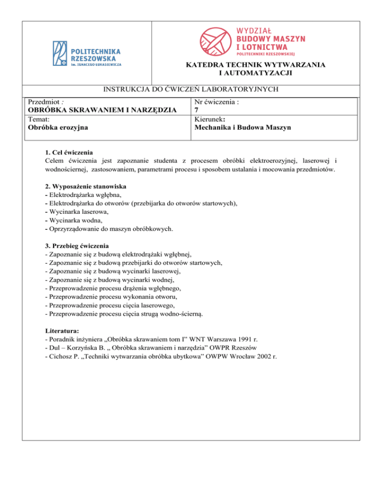 KATEDRA TECHNIK WYTWARZANIA I AUTOMATYZACJI INSTRUKCJA DO ĆWICZEŃ LABORATORYJNYCH Przedmiot : OBRÓBKA SKRAWANIEM I NARZĘDZIA Temat: Obróbka erozyjna Nr ćwiczenia : 7 Kierunek: Mechanika i Budowa Maszyn 1. Cel ćwiczenia Celem ćwiczenia jest zapoznanie studenta z procesem obróbki elektroerozyjnej, laserowej i wodnościernej, zastosowaniem, parametrami procesu i sposobem ustalania i mocowania przedmiotów. 2. Wyposażenie stanowiska - Elektrodrążarka wgłębna, - Elektrodrążarka do otworów (przebijarka do otworów startowych), - Wycinarka laserowa, - Wycinarka wodna, - Oprzyrządowanie do maszyn obróbkowych. 3. Przebieg ćwiczenia - Zapoznanie się z budową elektrodrążaki wgłębnej, - Zapoznanie się z budową przebijarki do otworów startowych, - Zapoznanie się z budową wycinarki laserowej, - Zapoznanie się z budową wycinarki wodnej, - Przeprowadzenie procesu drążenia wgłębnego, - Przeprowadzenie procesu wykonania otworu, - Przeprowadzenie procesu cięcia laserowego, - Przeprowadzenie procesu cięcia strugą wodno-ścierną. Literatura: - Poradnik inżyniera „Obróbka skrawaniem tom I” WNT Warszawa 1991 r. - Dul – Korzyńska B. „ Obróbka skrawaniem i narzędzia” OWPR Rzeszów - Cichosz P. „Techniki wytwarzania obróbka ubytkowa” OWPW Wrocław 2002 r. 1. Wprowadzenie. Obróbka elektroerozyjna, laserowa i wodno-ścierna należą do grupy procesów obróbki erozyjnej, o niekonwencjonalnym sposobie kształtowania przedmiotu obrabianego. Materiał zostaje rozdzielony poprzez zjawisko fizyczne bez bezpośredniego udziału narzędzia obróbkowego, czyli np. za pomocą wyładowania elektrycznego w cieczy dielektrycznej, za pomocą skoncentrowanej wiązki laserowej z gazem ochronnym bądź za pomocą sprężonego strumienia wody i proszku ściernego. 2. Obróbka elektroerozyjna. W procesie obróbki elektroerozyjnej możemy wyróżnić następujące techniki kształtowania: Elektrodrążenie (EDM, Electric discharge Machining). Cięcie drutem (WEDM, Wire Electric discharge Machining). Wiercenie elektroerozyjne (Przebijanie otworów). Elektrodrążenie. Elektrodrążenie jest procesem obróbki elektroerozyjnej, w którym ubytek materiału odbywa się poprzez wyładowania elektryczne pomiędzy elektrodą roboczą, a przedmiotem obrabianym. Kształt i geometria uzyskana po obróbce zależy głównie od geometrii narzędzia (elektrody roboczej). Na rys. 1 przedstawiono przebieg pojedynczego wyładowania elektrycznego pomiędzy elektrodą, a przedmiotem obrabianym. Rys. 1. Przebieg pojedynczego wyładowania w czasie procesu obróbki elektroerozyjnej. Przebieg pojedynczego wyładowania jest następujący: a) Przed przebiciem: w pierwszym etapie pomiędzy elektrodą a przedmiotem obrabianym zostaje przyłożone napięcie o zadanej wartości granicznej Ug. Elektroda robocza przemieszcza się w kierunku przedmiotu w wyniku tego przemieszczania pomiędzy elektrodą, a przedmiotem następuje wzrost pola elektrycznego. W miejscach, gdzie natężenie pola elektrycznego jest największe, następuje koncentracja zanieczyszczeń występujących w cieczy, które w konsekwencji prowadzą do obniżenia wytrzymałości elektrycznej w szczelinie roboczej. b) Przebicie: w wyniku osłabienia wytrzymałości elektrycznej w szczelnie roboczej pomiędzy elektrodą, a przedmiotem obrabianym następuje przebicie elektryczne podczas którego następuje gwałtowny spadek napięcia i wzrost prądu elektrycznego. W wyniku tego zjawiska następuje jonizacja ośrodka i utworzenie kanału plazmy. c) Wyładowanie: w czasie wyładowania utrzymująca się wartość prądu zapewnia bombardowanie jonami i elektronami powierzchnię przedmiotu i elektrody roboczej. W wyniku takiego bombardowania następuje gwałtowny wzrost temperatury, topnienie, a nawet odparowanie cząstek materiału obrabianego. d) Koniec wyładowania: pod koniec wyładowania następuje gwałtowny spadek prądu przewodzenia, co prowadzi do zaniku kanału plazmy i wybuchu w wyniku zmian ciśnienia wokół wyładowania. e) Po wyładowaniu: następuje wypłukanie stopionego materiału i dejonizacja szczeliny roboczej. Proces elektrodrążenia jest najczęstszym sposobem kształtowania materiałów trudno obrabialnych, materiałów po obróbce cieplnej i cieplno-chemicznej oraz wyrobów o skomplikowanych kształtach, gdzie możliwość obróbki metodami konwencjonalnymi za pomocą frezowania, toczenia, wiercenia jest utrudniona bądź nawet niemożliwa. Na rys. 2 przedstawiono przykłady wykonywania przedmiotów metodą elektrodrążenia. Rys. 2 Przykłady wykonania przedmiotów metodą drążenia. Narzędzia Narzędziem podczas procesu drążenia jest elektroda. Kształt oraz wielkość elektrody jest uzależniona od pożądanego kształtu wyrobu. Materiałem stosowanym na elektrodę może być każdy materiał, który przewodzi prąd, natomiast do najczęstszych stosowanych materiałów na elektrody robocze zalicza się: miedź elektrolityczna, grafit, mosiądz, żeliwo, stopy cyny lub kompozyty. Miedź elektrolityczna charakteryzuje się bardzo dobrymi właściwościami elektrycznymi oraz łatwością kształtowania, natomiast grafit jest materiałem bardzo kruchym, o bardzo dobrych właściwościach elektrycznych. Wykonywanie elektrod grafitowych odbywa się na specjalnie przystosowanych do tego centrach obróbczych wyposażonych w systemy odprowadzania pyłu grafitowego. Największą zaletą elektrod grafitowych jest możliwość wykonania elektrod bardzo długich o małym przekroju poprzecznym. Na rys. 3 pokazano przykład wykonania elektrody miedzianej i grafitowej. Rys 3. Przykłady elektrod: z grafitu, miedzi. Generatory impulsów elektrycznych. Do wytarzania impulsów prądowych prowadzących do wyładowań elektrycznych stosuje się generatory. Sposób ich działania jest podstawą klasyfikacji odmian obróbki elektroerozyjnej na obróbkę elektroiskrową i obróbkę elektroimpulsową. Wyróżniamy dwa podstawowe typy gen