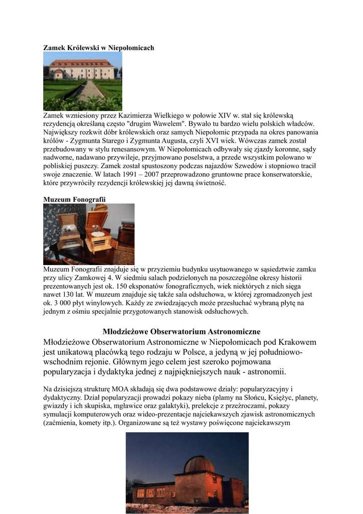 Zamek Królewski w Niepołomicach Zamek wzniesiony przez Kazimierza Wielkiego w połowie XIV w. stał się królewską rezydencją określaną często "drugim Wawelem". Bywało tu bardzo wielu polskich władców. Największy rozkwit dóbr królewskich oraz samych Niepołomic przypada na okres panowania królów - Zygmunta Starego i Zygmunta Augusta, czyli XVI wiek. Wówczas zamek został przebudowany w stylu renesansowym. W Niepołomicach odbywały się zjazdy koronne, sądy nadworne, nadawano przywileje, przyjmowano poselstwa, a przede wszystkim polowano w pobliskiej puszczy. Zamek został spustoszony podczas najazdów Szwedów i stopniowo tracił swoje znaczenie. W latach 1991 – 2007 przeprowadzono gruntowne prace konserwatorskie, które przywróciły rezydencji królewskiej jej dawną świetność. Muzeum Fonografii Muzeum Fonografii znajduje się w przyziemiu budynku usytuowanego w sąsiedztwie zamku przy ulicy Zamkowej 4. W siedmiu salach podzielonych na poszczególne okresy historii prezentowanych jest ok. 150 eksponatów fonograficznych, wiek niektórych z nich sięga nawet 130 lat. W muzeum znajduje się także sala odsłuchowa, w której zgromadzonych jest ok. 3 000 płyt winylowych. Każdy ze zwiedzających może przesłuchać wybraną płytę na jednym z ośmiu specjalnie przygotowanych stanowisk odsłuchowych. Młodzieżowe Obserwatorium Astronomiczne Młodzieżowe Obserwatorium Astronomiczne w Niepołomicach pod Krakowem jest unikatową placówką tego rodzaju w Polsce, a jedyną w jej południowowschodnim rejonie. Głównym jego celem jest szeroko pojmowana popularyzacja i dydaktyka jednej z najpiękniejszych nauk - astronomii. Na dzisiejszą strukturę MOA składają się dwa podstawowe działy: popularyzacyjny i dydaktyczny. Dział popularyzacji prowadzi pokazy nieba (plamy na Słońcu, Księżyc, planety, gwiazdy i ich skupiska, mgławice oraz galaktyki), prelekcje z przeźroczami, pokazy symulacji komputerowych oraz wideo-prezentacje najciekawszych zjawisk astronomicznych (zaćmienia, komety itp.). Organizowane są też wystawy poświęcone najciekawszym obserwacjom oraz masowe pokazy najważniejszych zjawisk na niebie. Działa biblioteka i czytelnia udostępniająca specjalistyczną literaturę z tej dziedziny i czasopisma a na miejscu można skorzystać z oprogramowania komputerowego w tym z komputerowych katalogów i atlasów nieba. Raz w miesiącu w piątkowe wieczory odbywają się odczyty popularnonaukowe. Dział dydaktyczny obejmuje 8 pracowni w tym pracownię astronomiczną oraz komputerową. Pracownia astronomiczna zrzesza młodzież zainteresowaną astronomią z dość dużego obszaru (Niepołomice, Kraków i okolice, Bochnia oraz Tarnów). Na zajęciach kół astronomicznych młodzież ma możliwość zapoznania się z podstawami wiedzy o Wszechświecie oraz z metodologią współczesnej nauki. Znakomite rezultaty można osiągnąć dzięki możliwości połączenia teorii z praktyką. Uczniowie mogą nie tylko na własne oczy zobaczyć przy pomocy teleskopu najważniejsze obiekty w naszym Układzie Słonecznym ale również mogą obserwować niezwykłe zjawiska na gwiaździstym niebie.