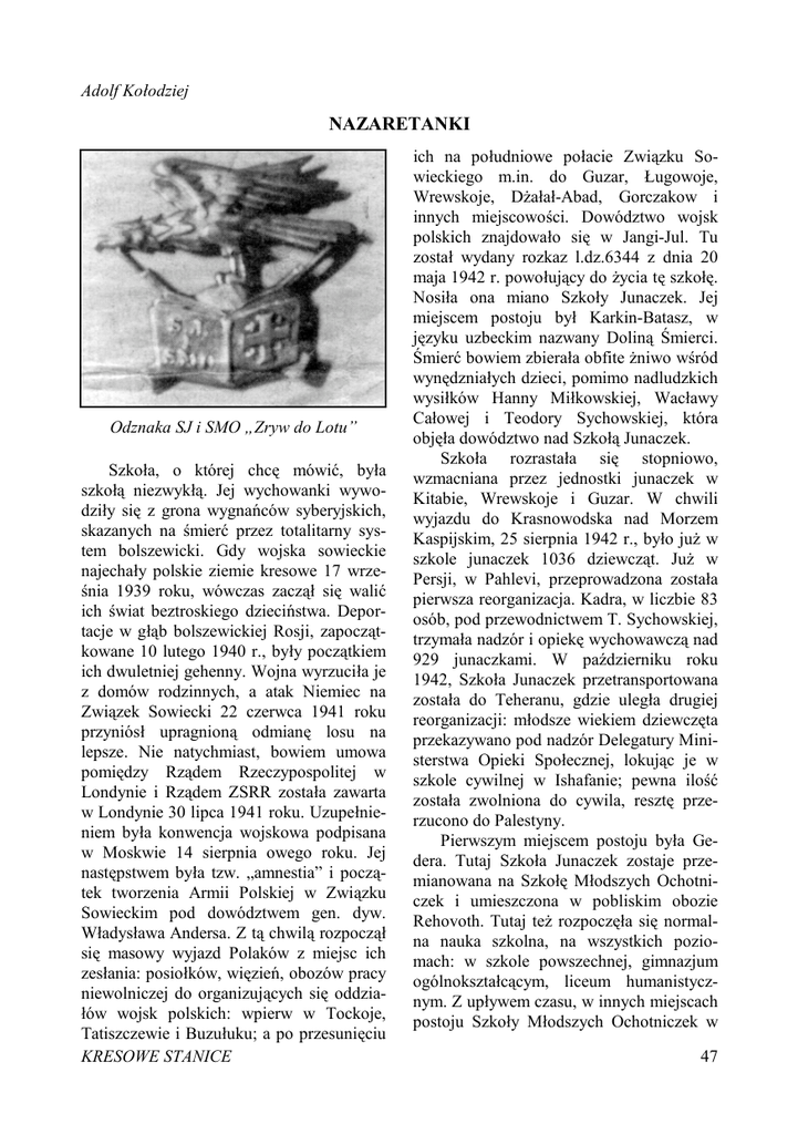 Adolf Kołodziej NAZARETANKI Odznaka SJ i SMO „Zryw do Lotu” Szkoła, o której chcę mówić, była szkołą niezwykłą. Jej wychowanki wywodziły się z grona wygnańców syberyjskich, skazanych na śmierć przez totalitarny system bolszewicki. Gdy wojska sowieckie najechały polskie ziemie kresowe 17 września 1939 roku, wówczas zaczął się walić ich świat beztroskiego dzieciństwa. Deportacje w głąb bolszewickiej Rosji, zapoczątkowane 10 lutego 1940 r., były początkiem ich dwuletniej gehenny. Wojna wyrzuciła je z domów rodzinnych, a atak Niemiec na Związek Sowiecki 22 czerwca 1941 roku przyniósł upragnioną odmianę losu na lepsze. Nie natychmiast, bowiem umowa pomiędzy Rządem Rzeczypospolitej w Londynie i Rządem ZSRR została zawarta w Londynie 30 lipca 1941 roku. Uzupełnieniem była konwencja wojskowa podpisana w Moskwie 14 sierpnia owego roku. Jej następstwem była tzw. „amnestia” i początek tworzenia Armii Polskiej w Związku Sowieckim pod dowództwem gen. dyw. Władysława Andersa. Z tą chwilą rozpoczął się masowy wyjazd Polaków z miejsc ich zesłania: posiołków, więzień, obozów pracy niewolniczej do organizujących się oddziałów wojsk polskich: wpierw w Tockoje, Tatiszczewie i Buzułuku; a po przesunięciu KRESOWE STANICE ich na południowe połacie Związku Sowieckiego m.in. do Guzar, Ługowoje, Wrewskoje, Dżałał-Abad, Gorczakow i innych miejscowości. Dowództwo wojsk polskich znajdowało się w Jangi-Jul. Tu został wydany rozkaz l.dz.6344 z dnia 20 maja 1942 r. powołujący do życia tę szkołę. Nosiła ona miano Szkoły Junaczek. Jej miejscem postoju był Karkin-Batasz, w języku uzbeckim nazwany Doliną Śmierci. Śmierć bowiem zbierała obfite żniwo wśród wynędzniałych dzieci, pomimo nadludzkich wysiłków Hanny Miłkowskiej, Wacławy Całowej i Teodory Sychowskiej, która objęła dowództwo nad Szkołą Junaczek. Szkoła rozrastała się stopniowo, wzmacniana przez jednostki junaczek w Kitabie, Wrewskoje i Guzar. W chwili wyjazdu do Krasnowodska nad Morzem Kaspijskim, 25 sierpnia 1942 r., było już w szkole junaczek 1036 dziewcząt. Już w Persji, w Pahlevi, przeprowadzona została pierwsza reorganizacja. Kadra, w liczbie 83 osób, pod przewodnictwem T. Sychowskiej, trzymała nadzór i opiekę wychowawczą nad 929 junaczkami. W październiku roku 1942, Szkoła Junaczek przetransportowana została do Teheranu, gdzie uległa drugiej reorganizacji: młodsze wiekiem dziewczęta przekazywano pod nadzór Delegatury Ministerstwa Opieki Społecznej, lokując je w szkole cywilnej w Ishafanie; pewna ilość została zwolniona do cywila, resztę przerzucono do Palestyny. Pierwszym miejscem postoju była Gedera. Tutaj Szkoła Junaczek zostaje przemianowana na Szkołę Młodszych Ochotniczek i umieszczona w pobliskim obozie Rehovoth. Tutaj też rozpoczęła się normalna nauka szkolna, na wszystkich poziomach: w szkole powszechnej, gimnazjum ogólnokształcącym, liceum humanistycznym. Z upływem czasu, w innych miejscach postoju Szkoły Młodszych Ochotniczek w 47 N.W. gen Sosnkowski wizytuje SMO.Nazaret Quastinie, Jeninie i Nazarecie organizowane zostają: Gimnazjum Kupieckie, II Gimnazjum Ogólnokształcące, Liceum Pedagogiczne i Liceum AdministracyjnoHandlowe. Uczennice zdają matury, odchodzą do służby transportowej, sanitarnej i opieki społecznej w różnych jednostkach wojska polskiego: w Egipcie, Włoszech i Wielkiej Brytanii przyczyniając się do sukcesów wojskowych Polskich Sił Zbrojnych na obczyźnie. Cieszą się uznaniem. Ma powód do dumy komendantka mjr T. Sychowska i dyrektor Maria Kościałkowska. Podobnie czują się dumni wszyscy wykładowcy, łącznie z dr Wit Tarnawskim i jego zespołem sanitarnym, bo wielka ich zasługa, że przywrócili życiu schorowane dziewczęta tak niedawno wyglądem przypominające szkielety. Jakże więc cieszyli się z pierwszych sukcesów akademickich na Uniwersytecie w Bejrucie; jak wielkie mieli plany na czas powrotu do kraju. Poznały piekło zniewolenia, poznały wartość wolności. Będą jej strzec zawsze i wszędzie. Wdzięczne były Naczelnemu Wodzowi Władysławowi Sikorskiemu za dar 48 wyzwolenia. Darzyły też wielkim przywiązaniem gen. W. Andersa za wywiezienie ich z domu niewoli. Jak bardzo czuły się zobowiązane żołnierzowi polskiemu za opiekę, za rozsławienie chwały oręża polskiego. Dbały o cześć Polki, nie chciały przynieść swoim matkom wstydu. Z dnia na dzień blakły zmory przeszłości, ale straszyły wieści nadchodzące z Jałty. Dlaczego? Co za podły świat! - wołały zawiedzione... A zegar historii biegł naprzód. Pod koniec lipca 1947 roku wypłynęły z Port-Said w Egipcie, a 5 sierpnia tegoż roku ich statek przybił do brzegów Wielkiej Brytanii. Było ich na pokładzie 404 zaś kadry 59 osób. Już w Liverpool zrozumiały, że gotuje się dla nich twarde życie. Obóz w Foxley był ich ostatnią wspólną przystanią, której z za światów orędowała Wanda Malczewska, wspaniała opiekunka i patronka Szkoły Młodszych Ochotniczek. Jeszcze zdołano doprowadzić do ostatniej matury w Foxley, kończąc rok szkolny 29 lutego 1948 roku. W ogólnym rachunku stwierdzono fakt uzyskania 466 świadectw dojrzałości, 645 świadectw małej matury, 235 świadectw KRESOWE STANICE szkoły powszechnej. Do służby w jednostkach Wojska Polskiego przeszło 439 uczennic SMO. *** ...Dziś – z dalekiej, młodzieńczowojennej przeszłości, z pożółkłych fotografii i postrzępionych kartek pamiętnika, pisanego w starym wojskowym kalendarzyku - przywodzę Cię do teraźniejszości i ożywiam na nowo ze swojej wyobraźni „Nazaretanko” z SMO. Podążam znów szlakiem Twojej wędrówki przez egzotyczne kraje i odległe kontynenty: od bieli ścian rodzinnego domu tonącego w zieleni na dalekiej Wileńszczyźnie i Nowogródczyźnie, Podolu smagłym, bujnym Wołyniu, romantycznym, pełnym poezji Polesiu czarownym, aż do bezmiernych przest