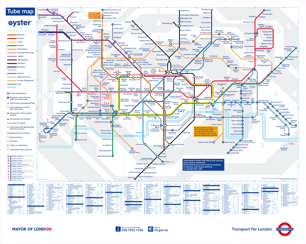 Tube map D C B 1 Chalfont & Latimer Chesham Amersham Chorleywood Rickmansworth A Croxley Uxbridge Ickenham Circle District Hammersmith & City Northolt B South Harrow Greenford ( Northern Preston Road Perivale Waterloo & City London Overground Hanger Lane C DLR Under construction North Acton North Ealing 654 Interchange stations Step-free access from the platform to the street Ealing Broadway Check before you travel. See index below 3 West Acton Acton Town D South Ealing Northfields Boston Manor Chiswick Hounslow Park East Osterley Hounslow Heathrow Hounslow West Terminals Central 1, 2, 3 Connection with Tramlink Location of Airport Interchange with National Rail services to airport E Ÿ Car parks Upper Holloway Finsbury Park Arsenal Holloway Road Canonbury Walthamstow Snaresbrook Queens Road Hackney Central Homerton King’s Cross St. Pancras 2 Angel Old Street 1 St. Paul’s Bank Covent Garden Leicester Square Mansion House Charing Cross Blackfriars Tower Hill Fenchurch Street 150m Tower Gateway Wapping Rotherhithe Langdon Park Opening November 2007 All Saints East India Poplar Canning Town Blackwall Custom House West Silvertown Beckton Park 2 Vauxhall Southfields Cyprus Gallions Reach for the O2 South Quay London City Airport Crossharbour East London line closes from 22 December 2007 for major line extension work to become part of the London Overground network Beckton Mudchute King George V Island Gardens E New Cross 3 for Maritime Greenwich Elephant & Castle Kennington Greenwich 100m Deptford Bridge Station in Zone D Pontoon Dock North Greenwich Cutty Sark Wimbledon Park D Prince Regent Royal Albert Heron Quays New Cross Gate ∏ Travel Information Centres 4 Lambeth North East Putney ∑ Toilets on site/nearby Devons Road West India Quay Surrey Quays Borough 3 200m Canary Wharf Bermondsey Canada Water Waterloo East 2 C Upton Park Plaistow West Ham for ExCeL London Bridge Southwark Upney Barking BromleyBow Church by-Bow Limehouse Temple Waterloo Pimlico for Shoreditch River Thames International rail services depart from King’s Cross St. Pancras from 14 November Dagenham Heathway Becontree Royal Victoria Charing Cross 100m Putney Bridge Whitechapel Shadwell Westferry Monument Embankment B Hornchurch Elm Park Dagenham East Wanstead Park Pudding Mill Lane Bow Road Aldgate Cannon Street Westminster Victoria Mile End Stepney Green Aldgate East Gants Hill East Ham Shoreditch no weekend service) Upminster Upminster Bridge Stratford Hackney Wick Moorgate ( Newbury Park Woodgrange Park Liverpool Street Barbican Chancery Lane Holborn Bethnal Green ( no weekend service) Farringdon Barkingside Leytonstone High Road Leyton A Fairlop Redbridge Leyton Midland Road Dalston Kingsland Highbury & Islington Euston 200m St. James’s Park Walthamstow Central Tottenham Hale 4 South Woodford Hainault Leytonstone Caledonian Road & Barnsbury Euston Square Piccadilly Circus Woodford Wanstead Camden Road River Thames under construction Manor House Kentish Town Euston Green Park 1 Fulham Broadway Richmond Seven Sisters 5 Chigwell Grange Hill South Tottenham Blackhorse Road Caledonian Road Tottenham Court Road Sloane Square South Kensington Earl’s Court Gunnersbury Harringay Green Lanes Crouch Hill Tufnell Park Kentish Town West Goodge Street Oxford Circus Hyde Park Corner Gloucester Road Parsons Green Heathrow Terminal 4 Heathrow Terminal 5 High Street Kensington West Brompton Kew Gardens Gospel Oak Russell Square Knightsbridge Turnham Stamford Ravenscourt West Green Brook Park Kensington Roding Valley Wood Green Archway 6 Buckhurst Hill Turnpike Lane Highgate Debden Bounds Green Leicester Square 340m Kensington (Olympia) Hammersmith Marylebone Queensway Marble Arch Barons Court Hatton Cross Replacement bus service Á Bicycle parking Acton Central Shepherd’s Bush Goldhawk Road South Acton Connections with riverboat services London Overground station under construction station under construction Finchley Central Warren Street Regent’s Park Notting Lancaster Bond Gate Street Hill Gate 2 Shepherd’s Bush Loughton Arnos Grove Mill Hill East Bayswater Holland Park East Acton Wood Lane Ealing Common Connections with National Rail Edgware Road Ladbroke Grove Latimer Road White City West Finchley Mornington Crescent Great Portland Street Baker Street Edgware Road Paddington Paddington Park Royal Theydon Bois for St. Pancras International Maida Vale Kilburn Park Warwick Avenue Royal Oak Westbourne Park Epping Southgate Camden Town Finchley Road Swiss Cottage St. John’s Wood 9 Cockfosters Woodside Park Chalk Farm Thameslink 200m 8 Totteridge & Whetstone Belsize Park West Hampstead Brondesbury Park Kensal Rise Brondesbury Kensal Green Kilburn South Queen’s Park High Road Hampstead Victoria Elverson Road Clapham Junction under construction Woolwich Arsenal Lewisham Oval Wimbledon Stockwell Clapham North Station in Zone C Clapham High Street 100m Station in Zone B Station in Zone A Station in Zone 6 and Zone A Station in Zone 6 Brixton Clapham Common Clapham South F Station in Zone 4 Station in both zones Colliers Wood Improvement works may affect your journey, particularly at weekends. Check before you travel; look for publicity at stations, visit tfl.gov.uk/check or call 020 7222 1234 100m Balham Tooting Bec Station in Zone 5 F Tooting Broadway Station in Zone 3 Station in Zone 2 Station in both zones Station in Zone 1 Stations Facilities Zones A ___________________________________________ ___________________________________________ D2 Acton Central µ 2 ___________________________________________ D2 Acton Town 3 ___________________________________________ D6 Aldgate 1 ___________________________________________ D7 Aldgate East 1 ___________________________________________ D8 All Saints µ 2 ___________________________________________ B2 Alperton : 4 ___________________________________________ A1 Amersham Ÿ Á : D ___________________________________________ C6 Angel 1 __________________________________________
