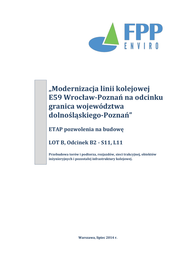 „Modernizacja linii kolejowej E59 Wrocław-Poznań na odcinku granica województwa dolnośląskiego-Poznań” ETAP pozwolenia na budowę LOT B, Odcinek B2 - S11, L11 Przebudowa torów i podtorza, rozjazdów, sieci trakcyjnej, obiektów inżynieryjnych i pozostałej infrastruktury kolejowej. Warszawa, lipiec 2014 r. Raport o oddziaływaniu na środowisko. Modernizacja linii kolejowej E59 Wrocław – Poznań, odcinek granica woj.dolnośląskiego – Poznań. Etap pozwolenia na budowę LOT B – S11, L11 „Modernizacja linii kolejowej E59 Wrocław-Poznań na odcinku granica województwa dolnośląskiego-Poznań” ETAP pozwolenia na budowę, LOT B, Odcinek B2 - S11, L11 Przebudowa torów i podtorza, rozjazdów, sieci trakcyjnej, obiektów inżynieryjnych i pozostałej infrastruktury kolejowej. Wykonawca FPP Enviro Sp. z o. o. ul. Wilcza 50/52 00-679 Warszawa Zamawiający PKP Polskie Linie Kolejowe S.A. Targowa 74 03-734 Warszawa Zespół opracowujący Agnieszka Kordecka Marzena Zblewska Patrycja Starnowska Tomasz Habrat Lars Briggs Marek Wołkowycki Bogdan Browarski Krzysztof Dudek Michał Maniakowski Albert Waiderny Grzegorz Gołębniak Piotr Tarasiuk Opracowania kartograficzne Karol Szymankiewicz Tomasz Szczepanek Zatwierdził Marta Wronka – Tomulewicz 3 Raport o oddziaływaniu na środowisko. Modernizacja linii kolejowej E59 Wrocław – Poznań, odcinek granica woj.dolnośląskiego – Poznań. Etap pozwolenia na budowę LOT B – S11, L11 4 Raport o oddziaływaniu na środowisko. Modernizacja linii kolejowej E59 Wrocław – Poznań, odcinek granica woj.dolnośląskiego – Poznań. Etap pozwolenia na budowę LOT B – S11, L11 SPIS TREŚCI 1 2 3 4 PRZEDMIOT OPRACOWANIA ..................................................................................................9 CEL INWESTYCJI .................................................................................................................... 11 PODSTAWY PRAWNE WYKONANIA RAPORTU O ODDZIAŁYWANIU NA ŚRODOWISKO ........... 12 OPIS PLANOWANEGO PRZEDSIĘWZIĘCIA .............................................................................. 16 4.1 Usytuowanie przedsięwzięcia ............................................................................................... 16 4.2 Wykaz zadań, dla których planuje się uzyskać pozwolenie na budowę .................................. 17 4.3 Zakres przedsięwzięcia ......................................................................................................... 17 4.3.1 Nawierzchnia torowa ................................................................................................. 18 4.3.2 Podtorze .................................................................................................................... 21 4.3.3 Roboty drogowe ........................................................................................................ 22 4.3.4 Roboty odwodnieniowe ............................................................................................. 36 4.3.5 Elektroenergetyka NN do 1 kV ................................................................................... 38 4.3.5.1. Elektroenergetyka nietrakcyjna – zasilanie odbiorów niskiego napięcia ........................ 38 4.3.5.2. Kolizje elektroenergetyczne ......................................................................................... 41 4.3.6 Oświetlenie ulicy Wilkowickiej w Lesznie.................................................................... 44 4.3.7 Urządzenia Sterowania Lokalnego Odłącznikami Sekcyjnymi (USLOS)......................... 45 4.3.8 Sieć trakcyjna ............................................................................................................. 45 4.3.9 Obiekty inżynieryjne .................................................................................................. 47 4.3.10 Obiekty budowlane - Centrum Obsługi Technicznej (COT) .......................................... 61 4.3.11 Rozbiórki.................................................................................................................... 62 4.3.12 Mała architektura ...................................................................................................... 63 4.3.13 Zewnętrzne sieci i instalacje ....................................................................................... 64 5 CHARAKTERYSTYKA ELEMENTÓW PRZYRODNICZYCH ŚRODOWISKA OBJĘTYCH ZAKRESEM PRZEWIDYWANEGO ODDZIAŁYWANIA PLANOWANEGO PRZEDSIĘWZIĘCIA NA ŚRODOWISKO........... 69 5.1 Zagospodarowanie terenu ................................................................................................... 69 5.2 Ukształtowanie powierzchni terenu...................................................................................... 69 5.3 Klimat i jakość powietrza atmosferycznego........................................................................... 72 5.4 Geologia............................................................................................................................... 74 5.5 Gleby.................................................................................................................................... 76 5.6 Wody podziemne ................................................................................................................. 77 5.7 Wody powierzchniowe ......................................................................................................... 87 5.8 Środowisko przyrodnicze ...................................................................................................... 92 5.8.1 Obszary chronione i korytarze ekologiczne ................................................................. 92 5.8.2 Inwentaryzacja siedlisk przyrodniczych w strefie bezpośredniego wpływu przedsięwzięcia ........................................................................................................................ 94 5.8.3 Inwentaryzacja przyro