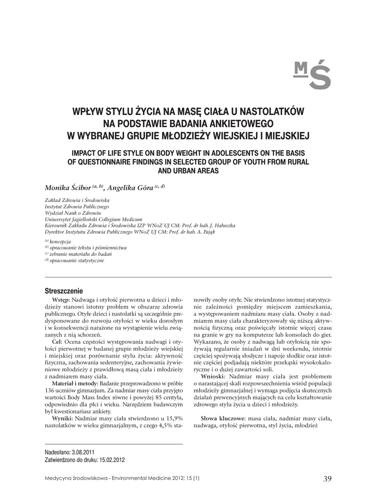 WpŁyW stylu Życia na masĘ ciaŁa u nastolatkóW na podstaWie badania ankietoWego W Wybranej grupie mŁodzieŻy Wiejskiej i miejskiej impact of life style on body Weight in adolescents on the basis of questionnaire findings in selected group of youth from rural and urban areas Monika Ścibor (a, b), Angelika Góra (c, d) Zakład Zdrowia i Środowiska Instytut Zdrowia Publicznego Wydział Nauk o Zdrowiu Uniwersytet Jagielloński Collegium Medicum Kierownik Zakładu Zdrowia i Środowiska IZP WNoZ UJ CM: Prof. dr hab. J. Hałuszka Dyrektor Instytutu Zdrowia Publicznego WNoZ UJ CM: Prof. dr hab. A. Pająk koncepcja opracowanie tekstu i piśmiennictwa (c) zebranie materiału do badań (d) opracowanie statystyczne (a) (b) streszczenie Wstęp: Nadwaga i otyłość pierwotna u dzieci i młodzieży stanowi istotny problem w obszarze zdrowia publicznego. Otyłe dzieci i nastolatki są szczególnie predysponowane do rozwoju otyłości w wieku dorosłym i w konsekwencji narażone na wystąpienie wielu związanych z nią schorzeń. Cel: Ocena częstości występowania nadwagi i otyłości pierwotnej w badanej grupie młodzieży wiejskiej i miejskiej oraz porównanie stylu życia: aktywność fizyczna, zachowania sedenteryjne, zachowania żywieniowe młodzieży z prawidłową masą ciała i młodzieży z nadmiarem masy ciała. Materiał i metody: Badanie przeprowadzono w próbie 136 uczniów gimnazjum. Za nadmiar masy ciała przyjęto wartości Body Mass Index równe i powyżej 85 centyla, odpowiednio dla płci i wieku. Narzędziem badawczym był kwestionariusz ankiety. Wyniki: Nadmiar masy ciała stwierdzono u 15,9% nastolatków w wieku gimnazjalnym, z czego 4,5% sta- nowiły osoby otyłe. Nie stwierdzono istotnej statystycznie zależności pomiędzy miejscem zamieszkania, a występowaniem nadmiaru masy ciała. Osoby z nadmiarem masy ciała charakteryzowały się niższą aktywnością fizyczną oraz poświęcały istotnie więcej czasu na granie w gry na komputerze lub konsolach do gier. Wykazano, że osoby z nadwagą lub otyłością nie spożywają regularnie śniadań w dni weekendu, istotnie częściej spożywają słodycze i napoje słodkie oraz istotnie częściej podjadają niektóre przekąski wysokokaloryczne i o dużej zawartości soli. Wnioski: Nadmiar masy ciała jest problemem o narastającej skali rozpowszechnienia wśród populacji młodzieży gimnazjalnej i wymaga podjęcia skutecznych działań prewencyjnych mających na celu kształtowanie zdrowego stylu życia u dzieci i młodzieży. Słowa kluczowe: masa ciała, nadmiar masy ciała, nadwaga, otyłość pierwotna, styl życia, młodzież Nadesłano: 3.08.2011 Zatwierdzono do druku: 15.02.2012 Medycyna Środowiskowa - Environmental Medicine 2012; 15 (1) 39 abstract Introduction: Overweight and primary obesity in children and adolescents is a crucial problem in public health. Obese children and adolescents are especially susceptible to obesity in adulthood and consequently exposed to many obesity related diseases. Objective: Evaluation of overweight and primary obesity in urban and rural youth populations and comparison of life style concerning: physical activity, sedentary behaviors, dietary habits among overweight and obese adolescents and their peers with proper Body Mass Index value. Materials and methods: The study was performed in the group of 136 students from junior high school. The students with BMI value over 85th percentile of sex-specific growth charts were classified as overweight. Research tool was a questionnaire. Wstęp Nadwaga i otyłość pierwotna u dzieci i młodzieży stanowi istotny problem w obszarze zdrowia publicznego. Wzrost liczby przypadków występowania otyłości jest obecnie zbyt duży, aby mógł zależeć tylko od czynników genetycznych. Uważa się, że czynniki genetyczne są odpowiedzialne za występowanie otyłości w 25–45%. Na genetyczną predyspozycję nakładają się bardzo istotne czynniki środowiskowe. Wpływ środowiska jest szczególnie silny w okresie dzieciństwa, kiedy kształtują się nawyki dotyczące stylu życia [1–3]. Styl życia to zespół codziennych zachowań, specyficznych dla danej jednostki lub zbiorowości. Styl życia w dużym stopniu wpływa na stan zdrowia oraz samopoczucie każdego człowieka, niezależnie od jego wieku. Do najistotniejszych jego elementów należą zachowania prozdrowotne i antyzdrowotne. Spośród zachowań zdrowotnych szczególnie istotne znaczenie w przypadku osób z nadwagą i otyłością mają aktywność fizyczna i sposób odżywiania. Zwiększenie liczby komórek tłuszczowych jest procesem nieodwracalnym, dlatego otyłość w dzieciństwie może być przyczyną rozwoju otyłości w wieku dorosłym. Wykazano, że wysokie Body Mass Index (BMI) w dzieciństwie koreluje z otyłością w wieku dorosłym, a siła tej korelacji zależy od stopnia otyłości w dzieciństwie. Dzieci, których wskaźnik masy ciała (BMI) przeniesiony na siatki centylowe odpowiadał wartości powyżej 95 centyla cztery razy częściej zapadały w wieku dorosłym na otyłość niż te, których wskaźnik masy ciała był poniżej 50 centyla. Siła zależności pomiędzy otyłością w dzieciństwie, a wystąpieniem otyłości w wieku dorosłym zależy od wieku dziecka, w którym było otyłe i jest większa u tych dzieci, które były otyłe w starszym wieku. 40 Results: 15,9% of adolescents were overweight, out of which 4,5% were obese. There was not a significant relation between Body Mass Index and the place of residence. Overweight and obese adolescents revealed lower physical activity and tendency to spend much more time playing computer games. Adolescents with overweight or obesity did not regularly have breakfast at weekends, more often had sweets and sweet drinks and also high energy and very salty snacks instead. Conclusions: Overweight and obesity is a serious problem among students from junior high school population which calls for taking immediate 