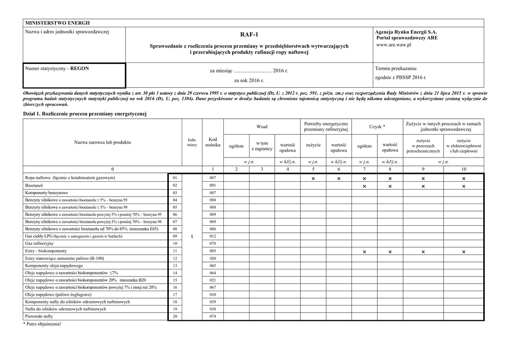 MINISTERSTWO ENERGII Nazwa i adres jednostki sprawozdawczej Agencja Rynku Energii S.A. Portal sprawozdawczy ARE www.are.waw.pl RAF-1 Sprawozdanie z rozliczenia procesu przemiany w przedsiębiorstwach wytwarzających i przerabiających produkty rafinacji ropy naftowej Numer statystyczny - REGON Termin przekazania: za miesiąc ............................ 2016 r. zgodnie z PBSSP 2016 r. za rok 2016 r. Obowiązek przekazywania danych statystycznych wynika z art. 30 pkt 3 ustawy z dnia 29 czerwca 1995 r. o statystyce publicznej (Dz. U. z 2012 r. poz. 591, z późn. zm.) oraz rozporządzenia Rady Ministrów z dnia 21 lipca 2015 r. w sprawie programu badań statystycznych statystyki publicznej na rok 2016 (Dz. U. poz. 1304). Dane pozyskiwane w drodze badania są chronione tajemnicą statystyczną i nie będą nikomu udostępniane, a wykorzystane zostaną wyłącznie do zbiorczych opracowań. Dział 1. Rozliczenie procesu przemiany energetycznej Potrzeby energetyczne przemiany rafineryjnej Wsad Jedn. miary Nazwa surowca lub produktu Kod nośnika ogółem 1 2 w tym z zagranicy w j.n. 0 Ropa naftowa (łącznie z kondensatem gazowym) 01 007 Bioetanol 02 001 Komponenty benzynowe 03 087 Benzyny silnikowe o zawartości bioetanolu ≤ 5% – benzyna 95 04 088 Benzyny silnikowe o zawartości bioetanolu ≤ 5% – benzyna 98 05 088 Benzyny silnikowe o zawartości bioetanolu powyżej 5% i poniżej 70% – benzyna 95 06 089 Benzyny silnikowe o zawartości bioetanolu powyżej 5% i poniżej 70% – benzyna 98 07 089 Benzyny silnikowe o zawartości bioetanolu od 70% do 85% (mieszanka E85) 08 Gaz ciekły LPG (łącznie z autogazem i gazem w butlach) 09 Gaz rafineryjny 10 078 Estry - biokomponenty 11 005 Estry stanowiące samoistne paliwo (B-100) 12 020 Komponenty oleju napędowego 13 065 Oleje napędowe o zawartości biokomponentów ≤7% 14 064 Oleje napędowe o zawartości biokomponentów 20% mieszanka B20 15 021 Oleje napędowe o zawartości biokomponentów powyżej 7% i innej niż 20% 16 067 Oleje napędowe (paliwo żeglugowe) 17 010 Komponenty nafty do silników odrzutowych turbinowych 18 039 Nafta do silników odrzutowych turbinowych 19 038 Pozostałe nafty 20 074 * Patrz objaśnienia! 3 Zużycie w innych procesach w ramach jednostki sprawozdawczej Uzysk * zużycie w procesach petrochemicznych zużycie w elektrociepłowni i/lub ciepłowni wartość opałowa zużycie wartość opałowa ogółem wartość opałowa w kJ/j.n. w j.n. w kJ/j.n. w j.n. w kJ/j.n. 4 5 6 7 8 9 10 w j.n. 086 t 012 Dział 1. Rozliczenie procesu przemiany energetycznej (cd.) Potrzeby energetyczne przemiany rafineryjnej Wsad Jedn. miary Nazwa surowca lub produktu Kod nośnika ogółem w tym z zagranicy w j.n. 0 1 Komponenty lekkiego oleju opałowego 21 090 Lekki olej opałowy 22 096 23 091 Komponenty ciężkiego oleju opałowego 24 097 Ciężki olej opałowy o niskiej zawartości siarki (≤1%) 25 098 26 092 27 099 28 093 Komponenty do produkcji asfaltów 29 070 Asfalty z przerobu ropy naftowej 30 073 Benzyna lotnicza 31 069 Benzyny specjalne (do ekstrakcji i lakierów) 32 075 Pozostałe półprodukty rafineryjne pochodzenia naftowego 33 068 Oleje bazowe 34 080 Oleje silnikowe 35 071 Oleje i preparaty smarowe 36 Wazeliny, gacze, parafiny, woski pochodzenia naftowego 37 072 Benzyna do pirolizy 38 076 Gudron 39 059 Pozostałe produkty naftowe 40 077 Biometanol 41 006 Biodimetyloeter 42 058 Bio-ETBE 43 008 Bio-MTBE 44 009 Inne dodatki uszlachetniające 45 081 Etan 46 057 Koks naftowy 47 063 Benzole surowe 48 052 Siarka 49 055 Oleje odpadowe – przepracowane 50 022 Pozostałe odpady przemysłowe stałe i ciekłe 51 034 Paliwa odpadowe gazowe 52 Gaz ziemny wysokometanowy 53 Gaz ziemny pozostały (gaz towarzyszący wydobyciu ropy naftowej) 54 w tym: paliwo żeglugowe w tym: paliwo żeglugowe Ciężki olej opałowy o wysokiej zawartości siarki (>1%) w tym: paliwo żeglugowe * Patrz objaśnienia! 3 zużycie w procesach petrochemicznych zużycie w elektrociepłowni i/lub ciepłowni wartość opałowa zużycie wartość opałowa ogółem wartość opałowa w kJ/j.n. w j.n. w kJ/j.n. w j.n. w kJ/j.n. 4 5 6 7 8 9 10 w j.n. 082 t GJ dam 2 Zużycie w innych procesach w ramach jednostki sprawozdawczej Uzysk * 079 3 013 018 Dział 1. Rozliczenie procesu przemiany energetycznej (dok.) Potrzeby energetyczne przemiany rafineryjnej Wsad Jedn. miary Nazwa surowca lub produktu Kod nośnika ogółem 1 2 w tym z zagranicy w j.n. 0 Węgiel kamienny do celów energetycznych 55 Koks i półkoks z węgla 56 Ciepło w parze i gorącej wodzie 57 GJ 023 Energia elektryczna 58 MWh 024 Odzysk z przemysłu petrochemicznego 59 w tym: t wartość opałowa ogółem wartość opałowa w kJ/j.n. w j.n. w kJ/j.n. w j.n. w kJ/j.n. 4 5 6 7 8 9 10 3 062 t 62 63 64 * Patrz objaśnienia! Dział 2. Moce przerobowe (w tys. ton/rok) Nazwa procesu 0 Moc przerobowa Nazwa procesu 1 0 Moc przerobowa 1 Destylacja atmosferyczna 01 Koksowanie 08 Destylacja próżniowa 02 Reforming katalityczny 09 Kraking katalityczny (ekwiwalentny) 03 Hydroodsiarczanie (HDS), Hydrotreating (HT) 10 Kraking katalityczny 04 Alkilacja 11 Hydrokraking 05 Polimeryzacja 12 Kraking termiczny 06 Izomeryzacja 13 Visbreaking 07 Produkcja ETBE 14 Produkcja MTBE 15 Proszę podać szacunkowy czas (w minutach) przeznaczony na przygotowanie danych dla potrzeb wypełnienia formularza 1 Proszę podać szacunkowy czas (w minutach) przeznaczony na wypełnienie formularza 2 .................................................................... (imię, nazwisko i telefon osoby, która sporządziła sprawozdanie) ................................................................. (miejscowość, data) zużycie w elektrociepłowni i/lub ciepłowni zużycie 60 61 zużycie w procesach petrochemicznych wartość opałowa 060 Zużycie w innych procesach w ramach jednostki sprawozdawczej Uzysk * ................................................................. (imię, nazwisko i telefon osoby zatwierdzającej sprawozdanie) w j.n.
