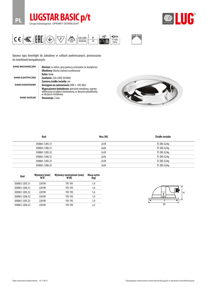 PL LUGSTAR BASIC p/t Grupa katalogowa: OPRAWY DOWNLIGHT Oprawa typu downlight do zabudowy w sufitach podwieszanych, przeznaczona do świetlówek kompaktowych. DANE MECHANICZNE DANE ELEKTRYCZNE DANE DODATKOWE DANE OGÓLNE Montaż: w suficie, przy pomocy uchwytów (w komplecie) Obudowa: blacha stalowa ocynkowana Kolor: biały Zasilanie: 220-240V 50/60Hz Zawiera źródło światła: nie Dostępne na zamówienie: DIM 1..10V, DALI Wyposażenie dodatkowe: pierścień metalowy, osprzęt elektryczny na płytce montażowej, w skrzynce plastikowej, w skrzynce metalowej Gwarancja: 2 lata Kod Moc [W] Źródło światła 030061.1205.31 030061.1206.31 030061.1205.32 030061.1206.32 030061.1205.33 030061.1206.33 2x18 2x26 2x18 2x26 2x18 2x26 TC-DEL G24q TC-DEL G24q TC-DEL G24q TC-DEL G24q TC-DEL G24q TC-DEL G24q Kod Wymiary [mm] WH Wymiary montażowe [mm] W ØS Masa netto [kg] 030061.1205.31 030061.1206.31 030061.1205.32 030061.1206.32 030061.1205.33 030061.1206.33 220 90 220 90 220 90 220 90 220 90 220 90 195 195 195 195 195 195 195 195 195 195 195 195 1,4 1,0 1,6 1,9 1,9 2,2 Data utworzenia dokumentu: 12-1-2017 Zastrzegamy sobie prawo zmian konstrukcyjnych w oprawach oświetleniowych PL LUGSTAR BASIC p/t Grupa katalogowa: OPRAWY DOWNLIGHT POZOSTAŁE ZDJĘCIA płytka montażowa skrzynka plastikowa skrzynka metalowa AKCESORIA 150100.00173 Szyba matowa IP43 150100.00174 Raster turbo IP 20 (krzywa rozsyłu światła dla oprawy 2x18W, 2x26W) 150100.00172 Szyba przezroczysta IP43 150100.00176 Pleksa mleczna IP44 z uszczelką IP44 150100.00171 Szyba centralnie matowiona IP43 (krzywa rozsyłu światła dla oprawy 2x18W, 2x26W) 150100.00175 Pleksa przezroczysta IP44 z uszczelką IP44 PRZYKŁADOWE REALIZACJE Biurowiec Europejskiego Funduszu Leasingowego, Wrocław Data utworzenia dokumentu: 12-1-2017 Centrum Biurowe Salzburg Center, Warszawa, Polska Dana Hotel & Spa, Zielona Góra, Polska Zastrzegamy sobie prawo zmian konstrukcyjnych w oprawach oświetleniowych