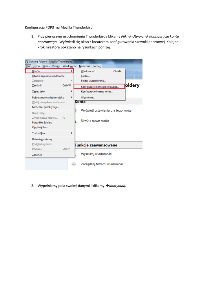 Konfiguracja POP3 na Mozilla Thunderbird: 1. Przy pierwszym uruchomieniu Thunderbirda klikamy Plik Utwórz Konfigurację konta pocztowego. Wyświetli się okno z kreatorem konfigurowania skrzynki pocztowej. Kolejne kroki kreatora pokazano na rysunkach poniżej. 2. Wypełniamy pola swoimi danymi i klikamy Kontynuuj. 3. Zaznaczamy opcję POP3 i klikamy Konfiguracja zaawansowana 4. Dla serwera POP3 oraz SMTP wpisujemy adres serwera mailvs.mw.mil.pl. Dla POP3 wybieramy opcję SSL/TLS na porcie 995, a dla SMTP opcję TLS na porcie 25. W polu Uwierzytelnianie dla POP3 i SMTP wybieramy Normalne hasło. 5. Klikamy Utwórz konto. 6. Pojawi się nam okno, w którym zostaniemy poproszeni o zatwierdzenie certyfikatu. Można obejrzed certyfikat klikając Wyświetl. Klikamy Pobierz certyfikat. Klikamy Potwierdź wyjątek bezpieczeostwa. 7. Konto zostało utworzone.