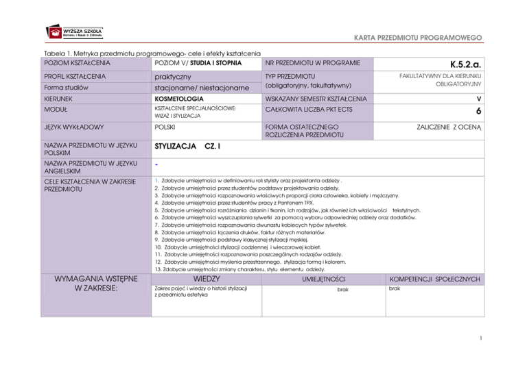 KARTA PRZEDMIOTU PROGRAMOWEGO Tabela 1. Metryka przedmiotu programowego- cele i efekty kształcenia POZIOM KSZTAŁCENIA POZIOM V/ STUDIA I STOPNIA NR PRZEDMIOTU W PROGRAMIE K.5.2.a. FAKULTATYWNY DLA KIERUNKU OBLIGATORYJNY PROFIL KSZTAŁCENIA praktyczny Forma studiów stacjonarne/ niestacjonarne TYP PRZEDMIOTU (obligatoryjny, fakultatywny) KIERUNEK KOSMETOLOGIA WSKAZANY SEMESTR KSZTAŁCENIA V MODUŁ KSZTAŁCENIE SPECJALNOŚCIOWE: WIZAŻ I STYLIZACJA CAŁKOWITA LICZBA PKT ECTS 6 JĘZYK WYKŁADOWY POLSKI FORMA OSTATECZNEGO ROZLICZENIA PRZEDMIOTU NAZWA PRZEDMIOTU W JĘZYKU POLSKIM STYLIZACJA NAZWA PRZEDMIOTU W JĘZYKU ANGIELSKIM - CELE KSZTAŁCENIA W ZAKRESIE PRZEDMIOTU 1. Zdobycie umiejętności w definiowaniu roli stylisty oraz projektanta odzieży . 2. Zdobycie umiejętności przez studentów podstawy projektowania odzieży. 3. Zdobycie umiejętności rozpoznawania właściwych proporcji ciała człowieka, kobiety i mężczyzny. 4. Zdobycie umiejętności przez studentów pracy z Pantonem TPX. 5. Zdobycie umiejętności rozróżniania dzianin i tkanin, ich rodzajów, jak również ich właściwości tekstylnych. 6. Zdobycie umiejętności wyszczuplania sylwetki za pomocą wyboru odpowiedniej odzieży oraz dodatków. 7. Zdobycie umiejętności rozpoznawania dwunastu kobiecych typów sylwetek. 8. Zdobycie umiejętności łączenia druków, faktur różnych materiałów. 9. Zdobycie umiejętności podstawy klasycznej stylizacji męskiej. 10. Zdobycie umiejętności stylizacji codziennej i wieczorowej kobiet. 11. Zdobycie umiejętności rozpoznawania poszczególnych rodzajów odzieży. 12. Zdobycie umiejętności myślenia przestrzennego, stylizacja formą i kolorem. 13. Zdobycie umiejętności zmiany charakteru, stylu elementu odzieży. WYMAGANIA WSTĘPNE W ZAKRESIE: ZALICZENIE Z OCENĄ CZ. I WIEDZY Zakres pojęć i wiedzy o historii stylizacji z przedmiotu estetyka UMIEJĘTNOŚCI brak KOMPETENCJI SPOŁECZNYCH brak 1 KARTA PRZEDMIOTU PROGRAMOWEGO EFEKTY KSZTAŁCENIA W ZAKRESIE PRZEDMIOTU STUDENT/ ABSOLWENT: W ODNIESIENIU DO OBSZAROWYCH EK W ODNIESIENIU DO KIERUNKOWYCH EK ODNIESIENIE DO FORM ZAJĘĆ W ĆW/K/W inne 1. Projektuje odzież z zastosowaniem ogólnych zasad stylizacji, posiada podstawową wiedzę dotyczącą tkanin oraz tekstylnych oznaczeń kolorów. M1_U01, KU_07 x x 2. Diagnozuje typy sylwetek osób, przestrzennie stylizuje formą i kolorem według zasad typologii sylwetek, również według zasad wyszczuplania sylwetki. M1_U01, KU_07 x x 3. Wykonuje stylizacje z wykorzystaniem wiedzy łączenia druków w celu poprawnej stylizacji sylwetki. M1_U01, KU_07 x x 4. Wykonuje pełne stylizacje: codzienną i wieczorową, przy użyciu zasad proporcjonalnego kształtowania wyglądu ludzkiej sylwetki. M1_U01, M1_K03; M1_K04; M1_K05 KU_07; KK_03 x 5. Wykonuje zmianę charakteru i stylu elementu dzieży. M1_U01, M1_K03; M1_K04; M1_K05 KU_07; KK_03 x Tabela 2. Walidacja i weryfikacja efektów kształcenia EFEKTY KSZTAŁCENIA- student Formy prezentacji EK Poziomy osiągnięcia EK i odpowiadające im oceny ndst (2) dst (3) db (4) bdb (5) 1. Projektuje odzież z zastosowaniem ogólnych zasad stylizacji, posiada podstawową wiedzę dotyczącą tkanin oraz tekstylnych oznaczeń kolorów. Ćwiczenie: przeprowadza wywiad z klientem, wybiera tkaniny oraz nadaje ich kolorowi symbol według Pantonu TPX w celu zaprojektowania odzieży dla niego. Popełnia błędy w zakresie doboru odzieży. 2. Diagnozuje typy sylwetek osób, przestrzennie stylizuje formą i kolorem według zasad typologii sylwetek, również według zasad wyszczuplania sylwetki. Ćwiczenie/zaliczenie: po przeprowadzeniu wywiadu i wykorzystując ocenę wzrokową, student rozpoznaje typ sylwetki osoby i wykonuje przestrzenną stylizacje z różnych materiałów, z zastosowaniem zasad typologii kobiecych sylwetek. Popełnia błędy w rozpoznawaniu typu sylwetki, nie posiada wiedzy z zakresu jej stylizacji. Prawidłowo, choć niezbyt szczegółowo wykonuje analizę i projekt przestrzenny. Prawidłowa i dość szczegółowa przeprowadzona analiza sylwetki, co jest uwzględnione w wykonanym projekcie. Prawidłowo rozpoznaje typ sylwetki, bardzo szczegółowo i twórczo wykonuje projekt przestrzenny, uwzględnia wszystkie zasady stylizacji dla określonego typu sylwetki. 3. Wykonuje stylizacje z wykorzystaniem wiedzy łączenia druków w celu poprawnej stylizacji sylwetki. Ćwiczenie/zaliczenie: wykorzystując wiedzę z zakresu łączenia wzorów i optycznego ich Popełnia błędy w łączeniu wzorów oraz źle dostosowuje je do Prawidłowo choć nie szczegółowo wykonuje projekt. Prawidłowo i dość szczegółowo wykonuje projekt, dobre łączenie Kreatywnie ,prawidłowo wykonany projekt z zastosowaniem wszystkich Prawidłowo, choć niezbyt szczegółowo wykonany projekt, błędy w zastosowaniu tkanin i opisach kolorystycznych. Prawidłowo i dość szczegółowo przygotowany projekt odzieży. Kreatywnie zaprojektowana odzież z uwzględnieniem potrzeb klientki. 2 KARTA PRZEDMIOTU PROGRAMOWEGO działania w stylizacji, wykonuje przestrzenny projekt z papieru. typu sylwetki. wzorów. poznanych zasad optycznego działania wzorów w stylizacji sylwetki. 4. Wykonuje pełne stylizacje: codzienna i wieczorową, przy użyciu zasad proporcjonalnego kształtowania wyglądu ludzkiej sylwetki. Ćwiczenie: za pomocą collage wykonuje projekt stylizacji wieczorowej i dziennej , dla wybranej przez siebie osoby (przedstawienie zdjęcia sylwetki). Popełnia błędy w stylizacji . Prawidłowo choć niezbyt dokładnie wykonana stylizacja. Prawidłowo, dość dokładnie wykonany projekt, z opisem tkanin i oznaczonymi kolorami według Pantonu TPX. Twórczo i prawidłowo wykonany projekt, z dokładnym opisem i zastosowaniem obowiązujących trendów. 5. Wykonuje zmianę charakteru i stylu elementu dzieży. Ćwiczenie/zaliczenie: wykorzystując przyniesiony przez siebie element ubioru, za pomocą technik plastycznych i odzieżowych nadaje mu inny charakter, zmieni